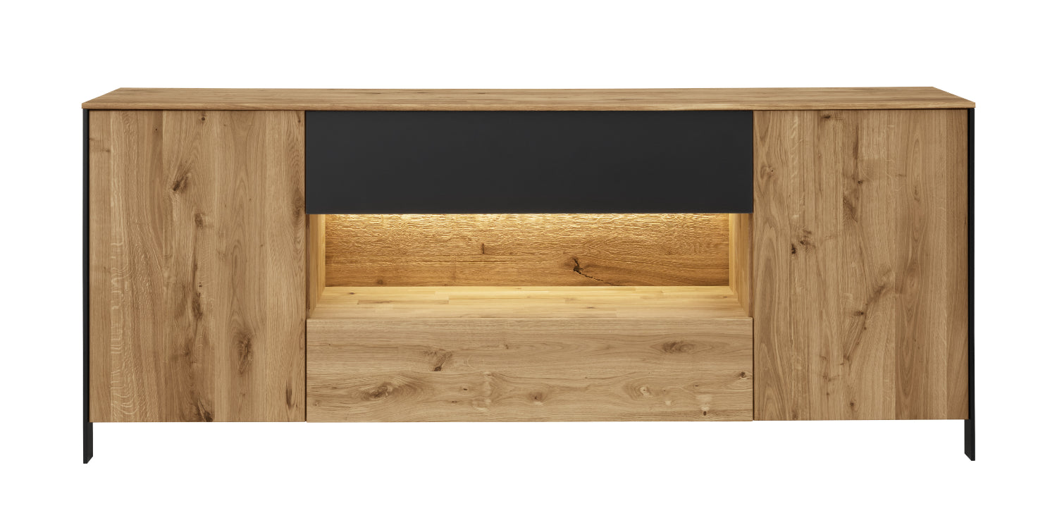 Inkl. LED-Beleuchtung des offenen Fachs und 2 Fachböden. 2 Schubladen, 2 Türen. Korpus Eiche, Front Wildeiche, Holzfüße schwarz lackiert. Lieferzeit ca. 5-8 Wochen.