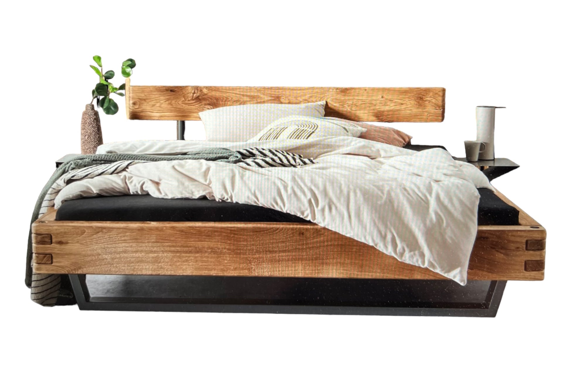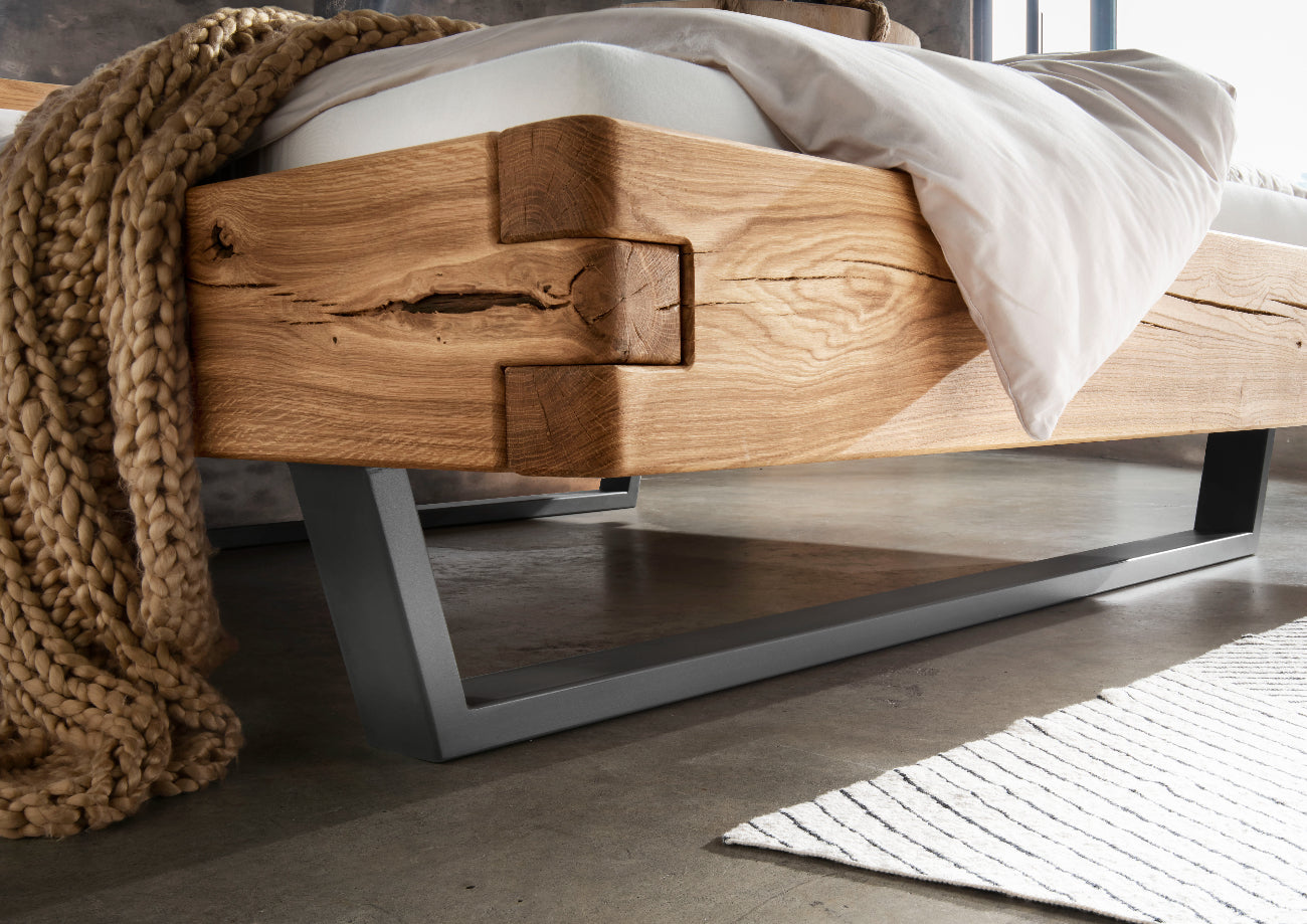 Dieses Balkenbett aus massiver, natur geölter Wildeiche ist ein Schmuckstück für jedes Schlafzimmer. Mit einer Breite von 140-200 cm und einer Länge von 200 cm bietet es genügend Platz für erholsame Nächte. Wählen Sie aus 2 Bettrahmen und 3 Fußarten, darunter Holzfüße, Schwebe-Metallkufe und Schwebe-Holzunterbau.
