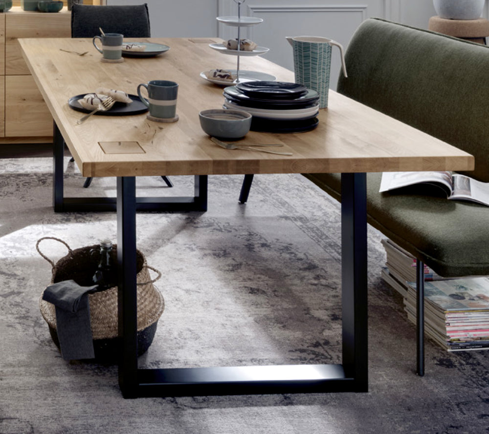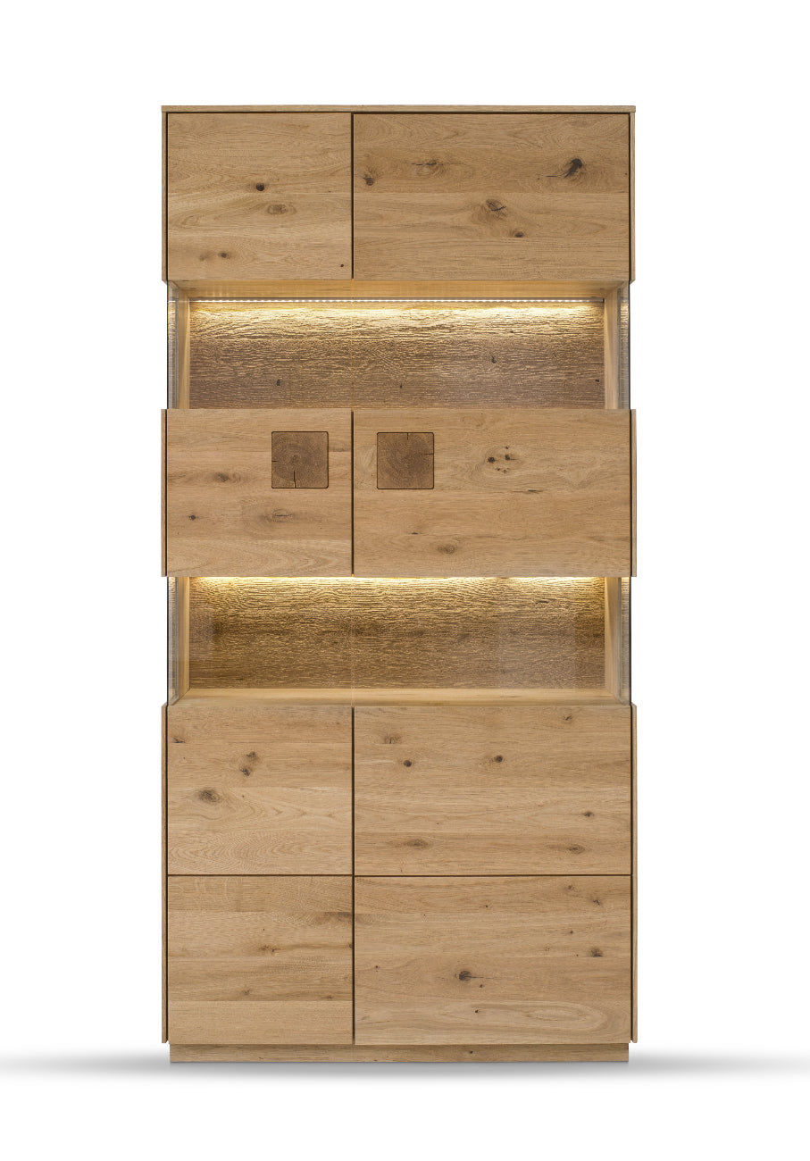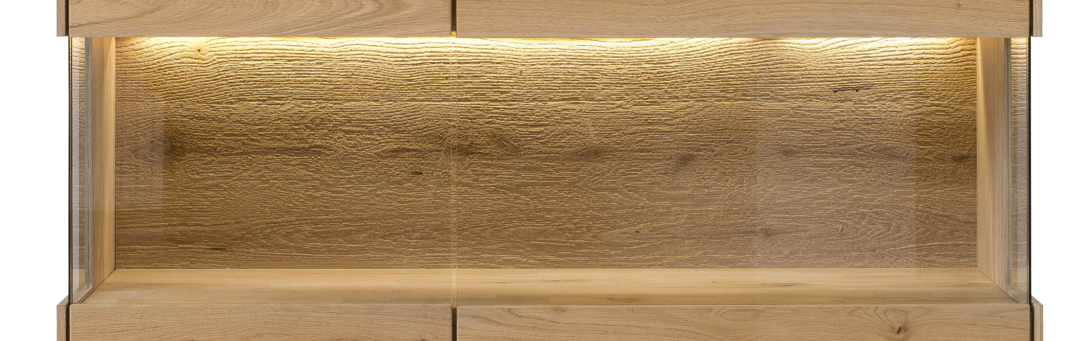 3-teilig, Wildeiche Natur geölt, inkl. Tip-on Beschläge, inkl. Beleuchtung. Besteht aus: Doppel-Glasvitrine (B/H/T ca. 103 x 209 x 44 cm), Esstisch nur Natur geölt (B/H/T ca. 200 x 75 x 90 cm), Highboard mit 2 Glastüren (B/H/T ca. 103 x 145 x 44 cm). Lieferzeit ca. 5-8 Wochen.