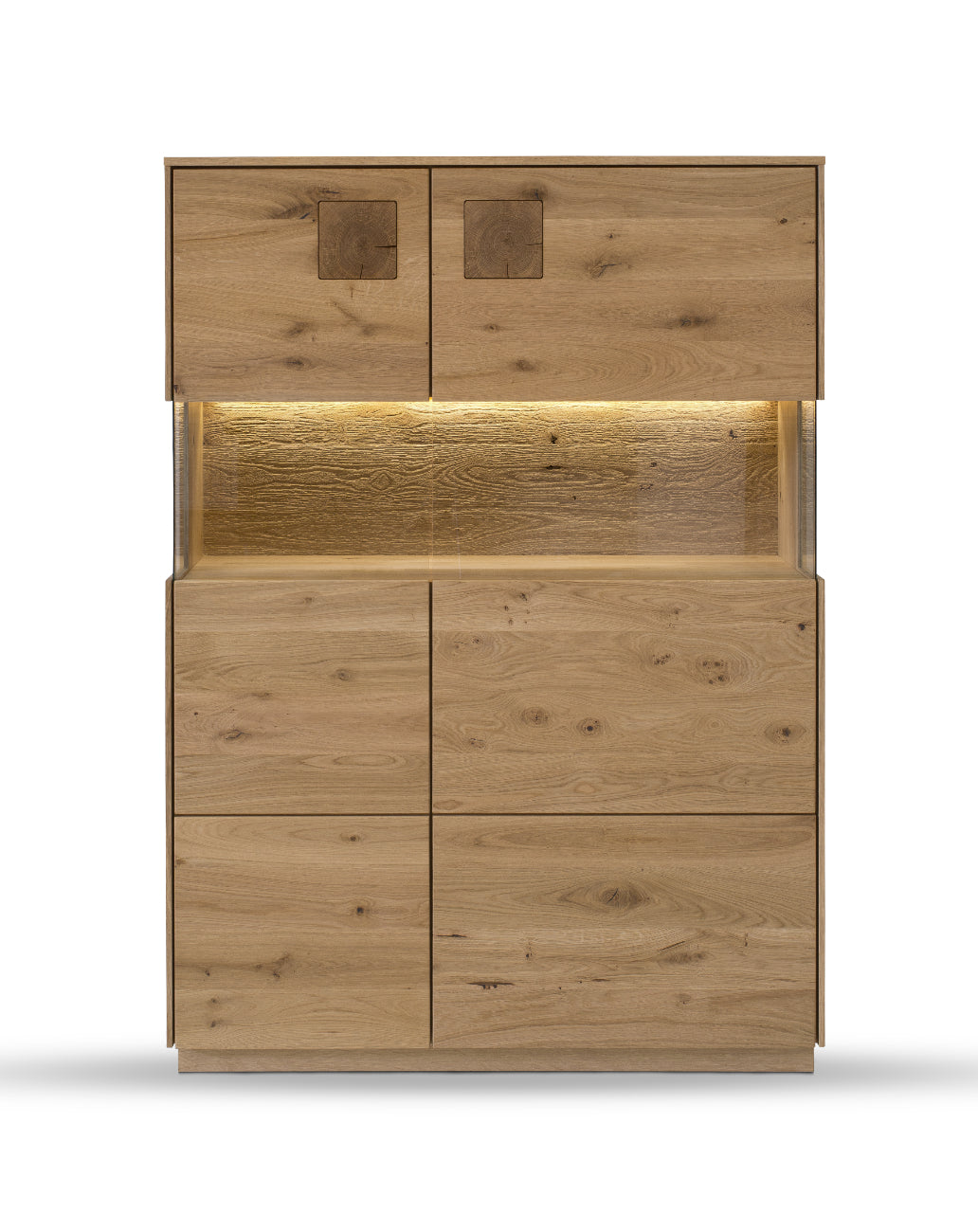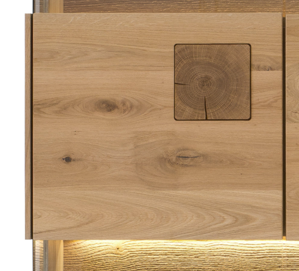 Das Esszimmer-Set Davos 3-teilig besticht durch seine Exklusivität und modernes Design. Die Fronten sind gekonnt mit Hirnholz-Elementen verziert, was dem Schrank und anderen Möbelstücken ein exklusives und raffiniertes Aussehen verleiht. Die geschliffenen und gebürsteten Rückwände aus Wildeiche mit integrierter LED-Beleuchtung sorgen für ein einzigartiges Ambiente. Mit einer Oberflächenbehandlung aus naturbelassenem Öl bietet es nicht nur einen natürlichen Glanz, sondern auch eine optimale Pflege. Ein super Esszimmer-Set für jeden, der Funktionalität und Ästhetik schätzt. Wählen Sie zwischen dem Natur-Design oder hellen Blanco-Design aus massiver, geölter Wildeiche. Mit der praktischen Push-to-Open-Funktion bieten sich keine störenden Griffe, sondern ein eleganter Zugang zu großzügigem Stauraum. Das 3-teilige Set besteht aus einen Higboard 2-türig, einem Esstisch 200 cm Breite und eine Doppel-Glasvitrine - perfekt für eine luxuriöse Einrichtung. Kostenlose Lieferung und Montage inklusive. Holen Sie sich die Natur in Ihr Zuhause und spüren Sie die Wärme!