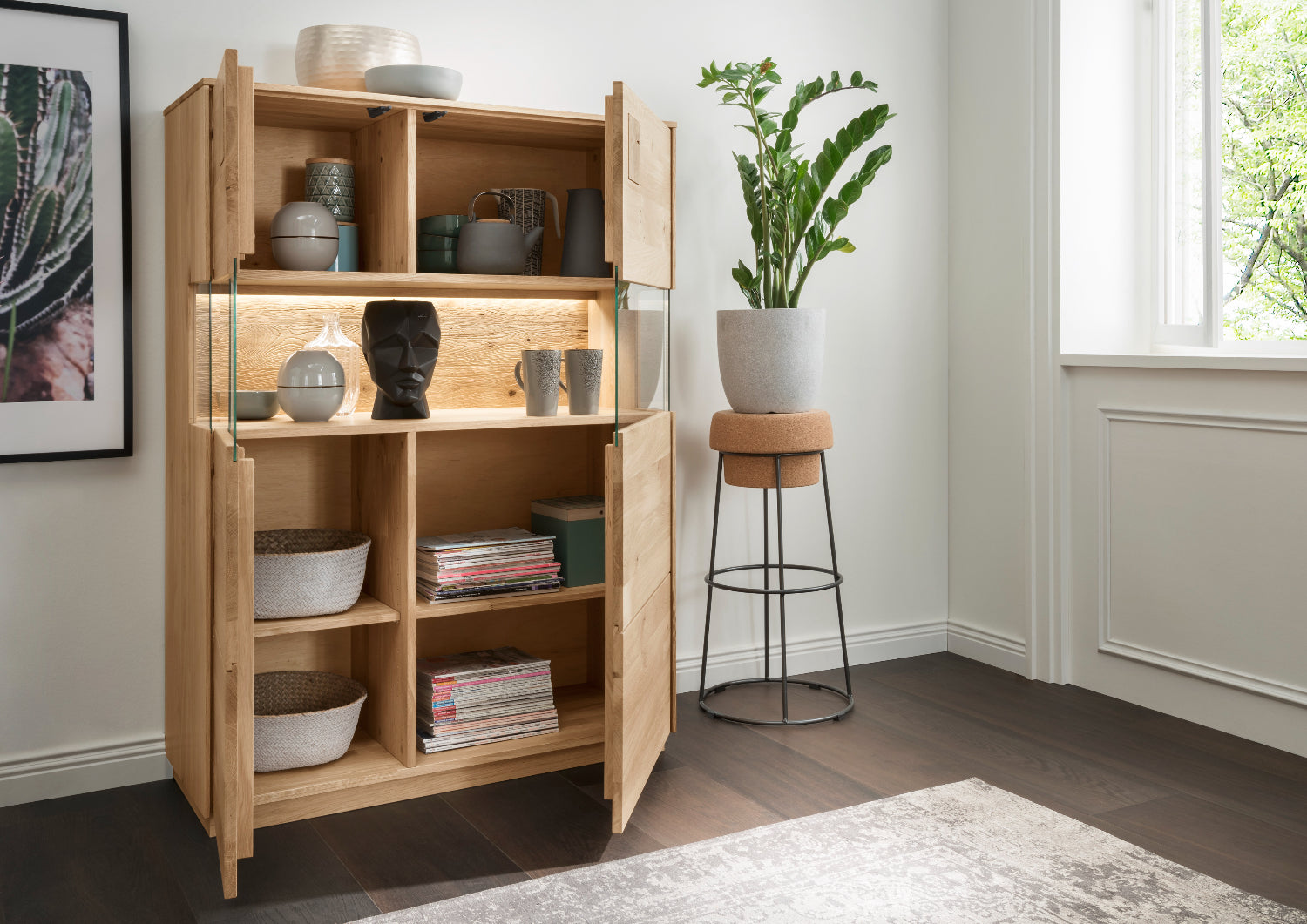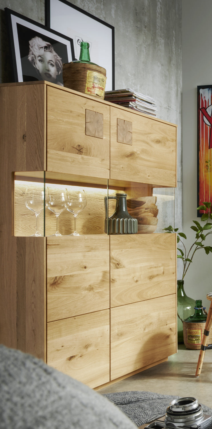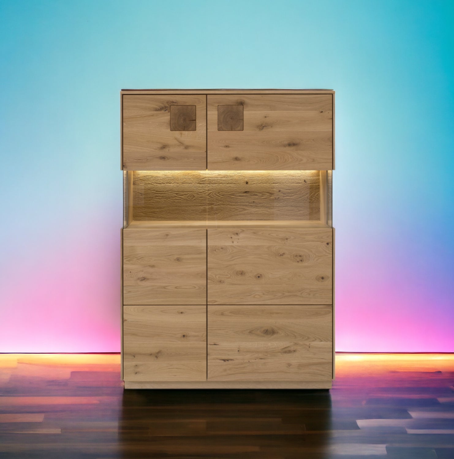 TPT Davos Higboard 2-türig mit Glas, Wildeiche massiv natur/blanco geölt, inkl. Beleuchtung B/H/T 103 x 145 x 44 cm