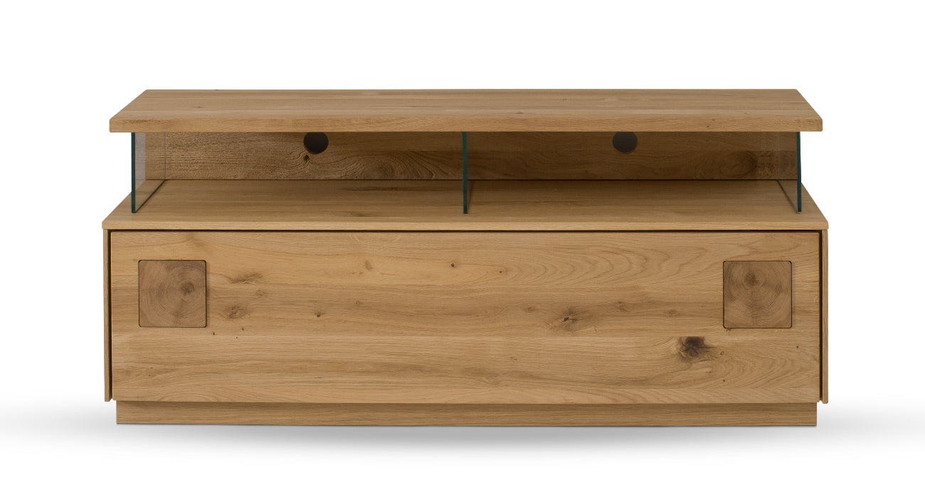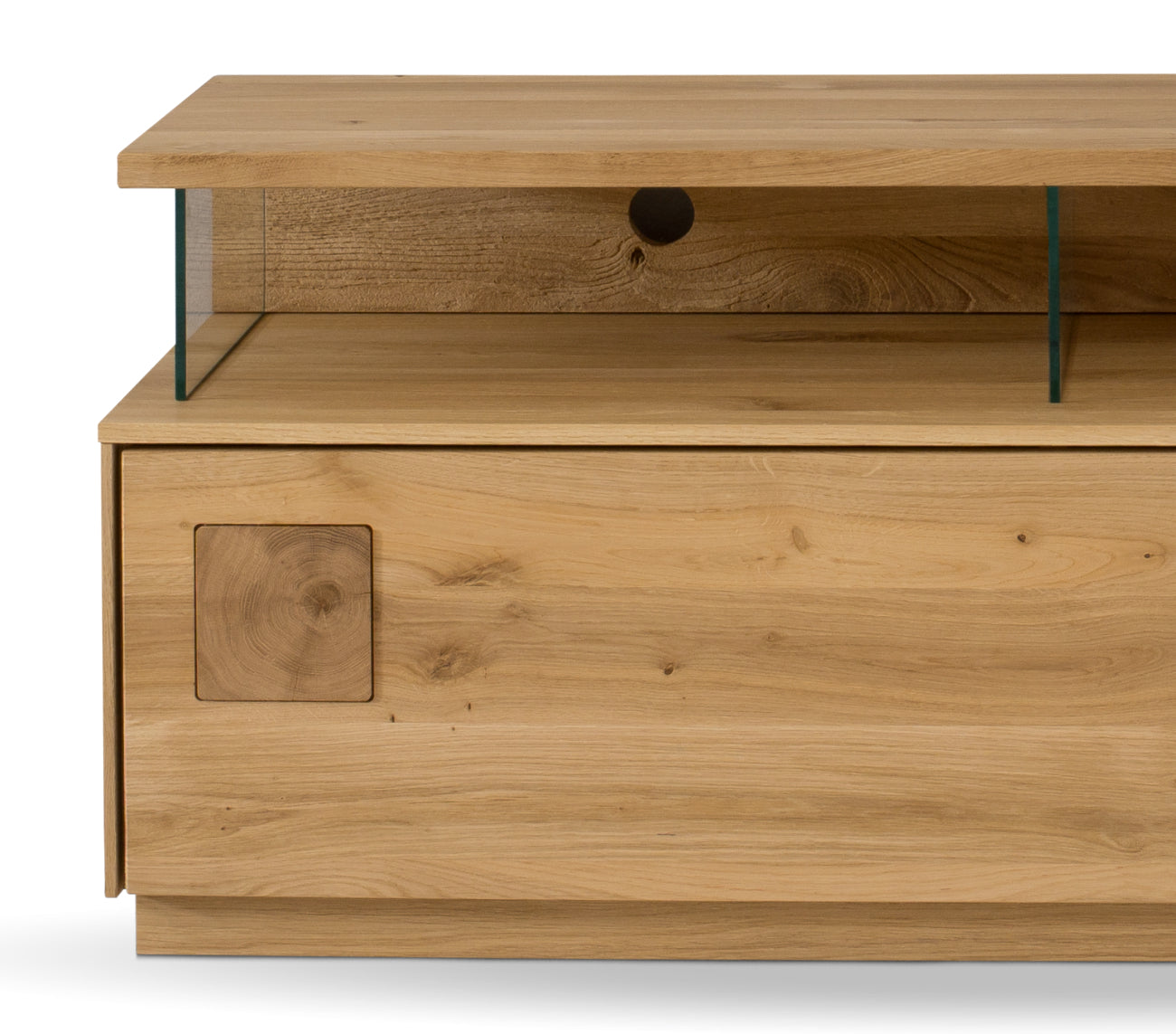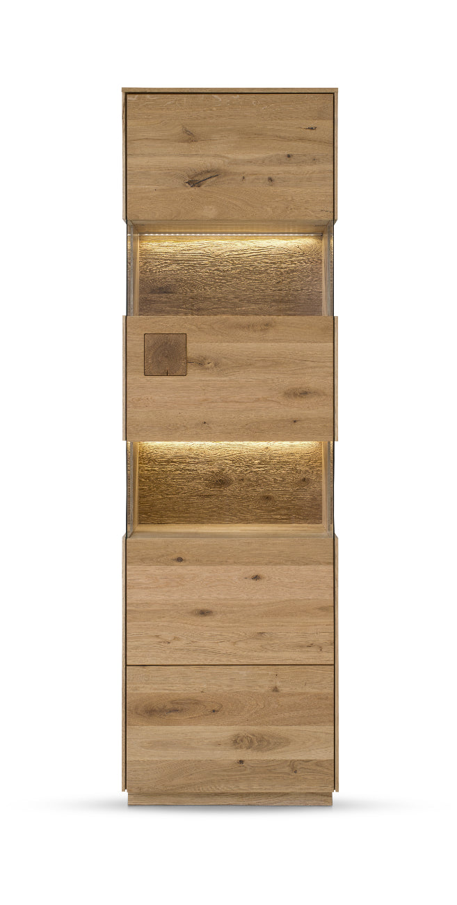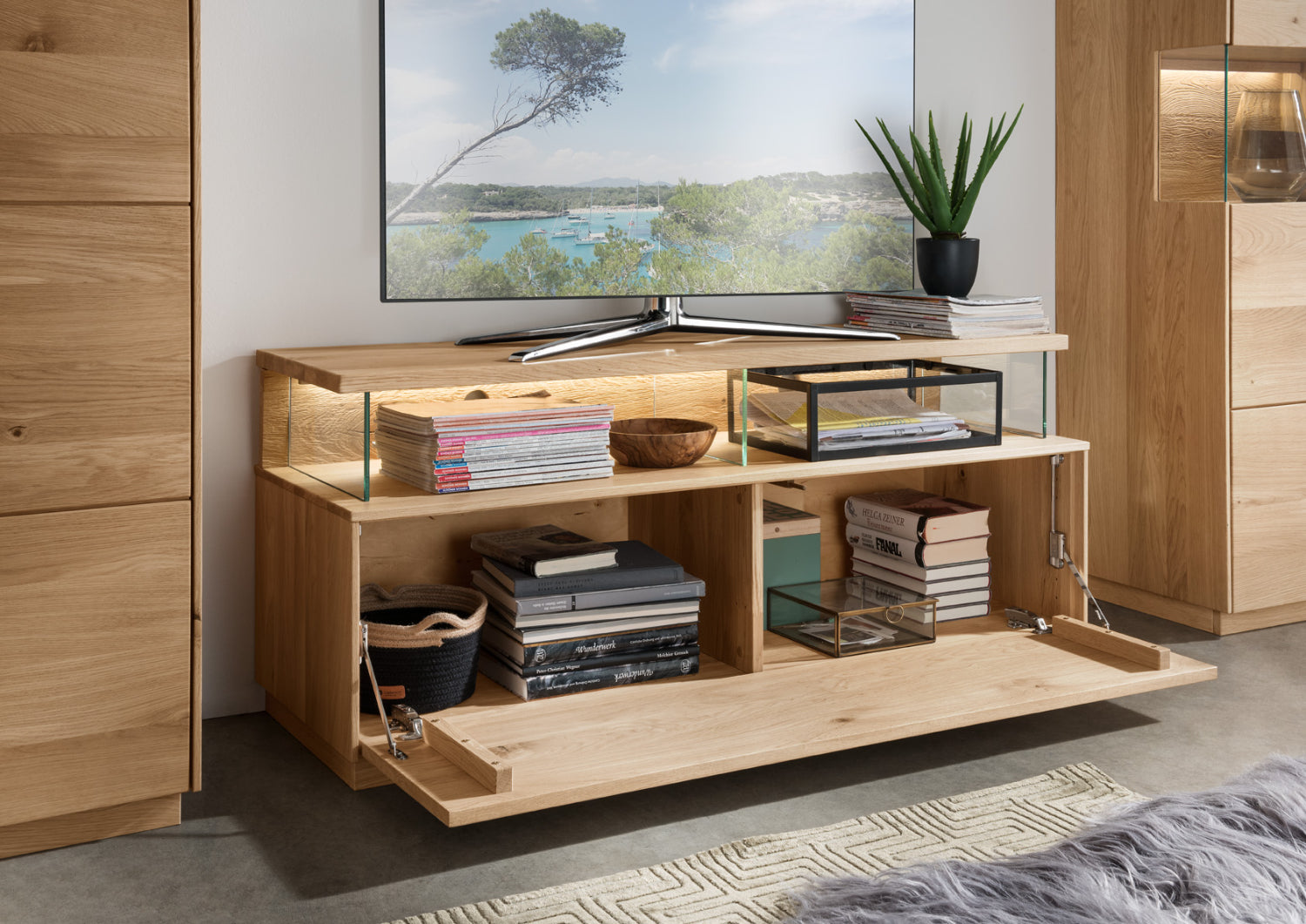 3-teilig, Wildeiche Natur geölt, inkl. Tip-on Beschläge, inkl. Beleuchtung. Besteht aus: Glasvitrine (B/H/T ca. 64 x 209 x 44 cm, optional links/rechts), TV Lowboard (B/H/T ca. 130 x 56 x 44 cm), Highboard (B/H/T ca. 103 x 145 x 44 cm). Lieferzeit ca. 5-8 Wochen.