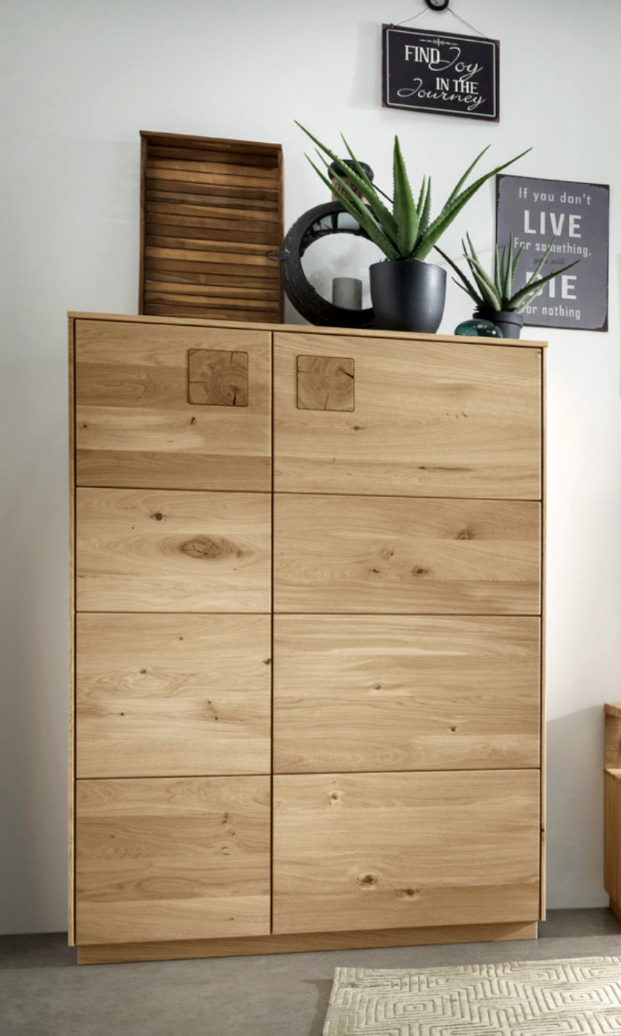 Das Wohnzimmer-Set Davos 3-teilig besticht durch seine Exklusivität und modernes Design. Die Fronten sind gekonnt mit Hirnholz-Elementen verziert, was dem Schrank und anderen Möbelstücken ein exklusives und raffiniertes Aussehen verleiht. Die geschliffenen und gebürsteten Rückwände aus Wildeiche mit integrierter LED-Beleuchtung sorgen für ein einzigartiges Ambiente. Mit einer Oberflächenbehandlung aus naturbelassenem Öl bietet es nicht nur einen natürlichen Glanz, sondern auch eine optimale Pflege. Ein super Wohnzimmer-Set für jeden, der Funktionalität und Ästhetik schätzt. Wählen Sie zwischen dem Natur-Design oder hellen Blanco-Design aus massiver, geölter Wildeiche. Mit der praktischen Push-to-Open-Funktion bieten sich keine störenden Griffe, sondern ein eleganter Zugang zu großzügigem Stauraum. Das 3-teilige Set besteht aus einen Higboard, einem TV Lowboard, eine Glasvitrine - perfekt für eine luxuriöse Einrichtung. Kostenlose Lieferung und Montage inklusive. Holen Sie sich die Natur in Ihr Zuhause und spüren Sie die Wärme!