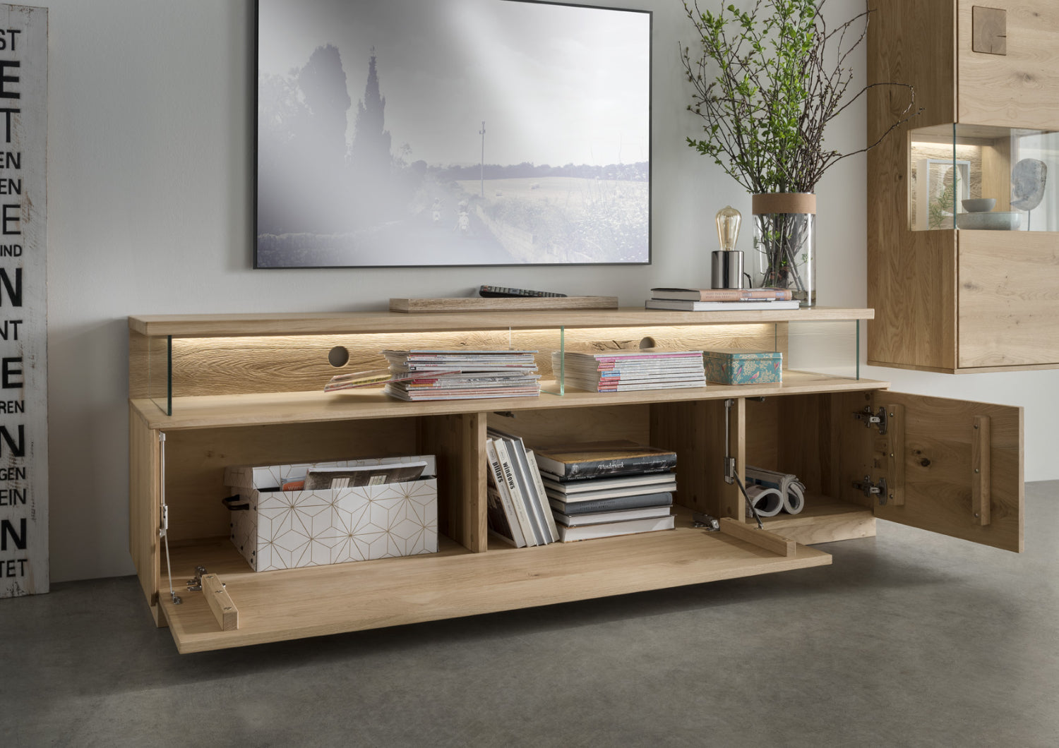 4-teilig, Wildeiche Natur geölt, inkl. Tip-on Beschläge, inkl. Beleuchtung. Besteht aus: Glashighboard (B/H/T ca. 103 x 145 x 44 cm), TV Lowboard (B/H/T ca. 170 x 56 x 44 cm), Highboard (B/H/T ca. 63 x 145 x 44 cm, optional links/rechts) und Wandregal (B/H/T ca. 155 x 24 x 38 cm). Lieferzeit ca. 5-8 Wochen.
