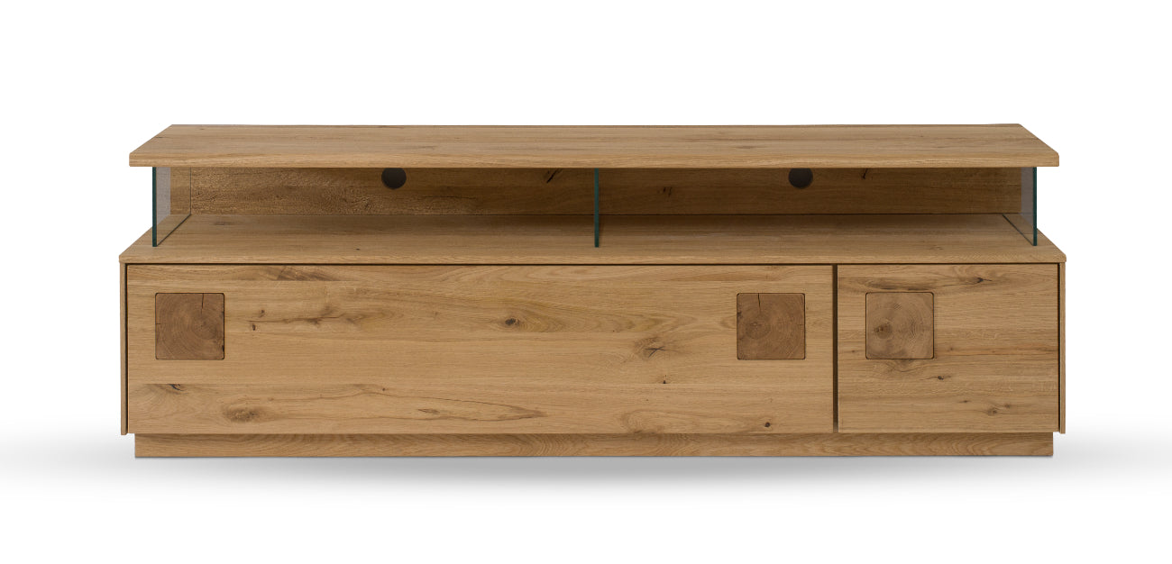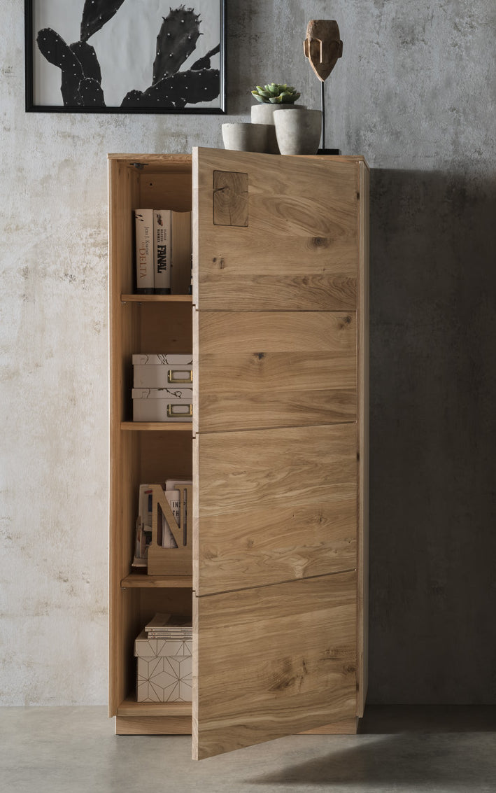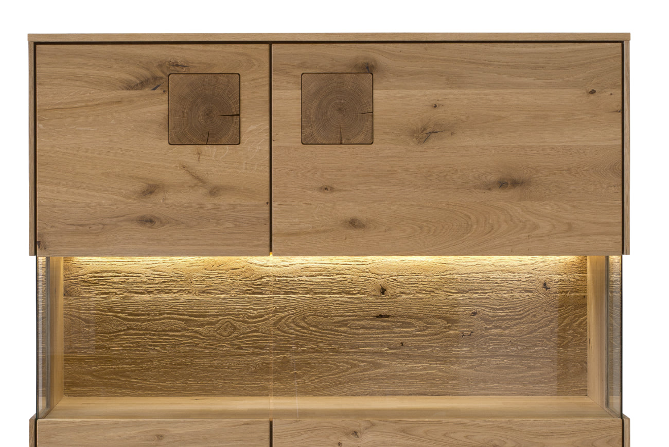 Das Wohnzimmer-Set Davos 4-teilig besticht durch seine Exklusivität und modernes Design. Die Fronten sind gekonnt mit Hirnholz-Elementen verziert, was dem Highboard und anderen Möbelstücken ein exklusives und raffiniertes Aussehen verleiht. Die geschliffenen und gebürsteten Rückwände aus Wildeiche mit integrierter LED-Beleuchtung sorgen für ein einzigartiges Ambiente. Mit einer Oberflächenbehandlung aus naturbelassenem Öl bietet es nicht nur einen natürlichen Glanz, sondern auch eine optimale Pflege. Ein super Wohnzimmer-Set für jeden, der Funktionalität und Ästhetik schätzt. Wählen Sie zwischen dem Natur-Design oder hellen Blanco-Design aus massiver, geölter Wildeiche. Mit der praktischen Push-to-Open-Funktion bieten sich keine störenden Griffe, sondern ein eleganter Zugang zu großzügigem Stauraum. Das 4-teilige Set besteht aus einen Higboard 1-türig, einem TV Lowboard, einen Highboard mit 2 Glastüren und ein Wandregal - perfekt für eine luxuriöse Einrichtung. Kostenlose Lieferung und Montage inklusive. Holen Sie sich die Natur in Ihr Zuhause und spüren Sie die Wärme!