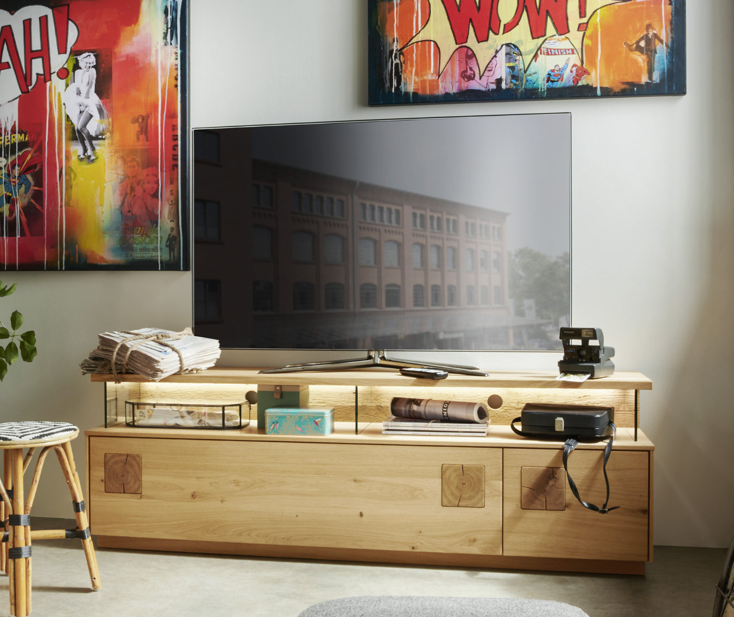 TPT Davos Wohnzimmer-Set 4-teilig Wildeiche massiv, natur/blanco geölt, inkl. Beleuchtung