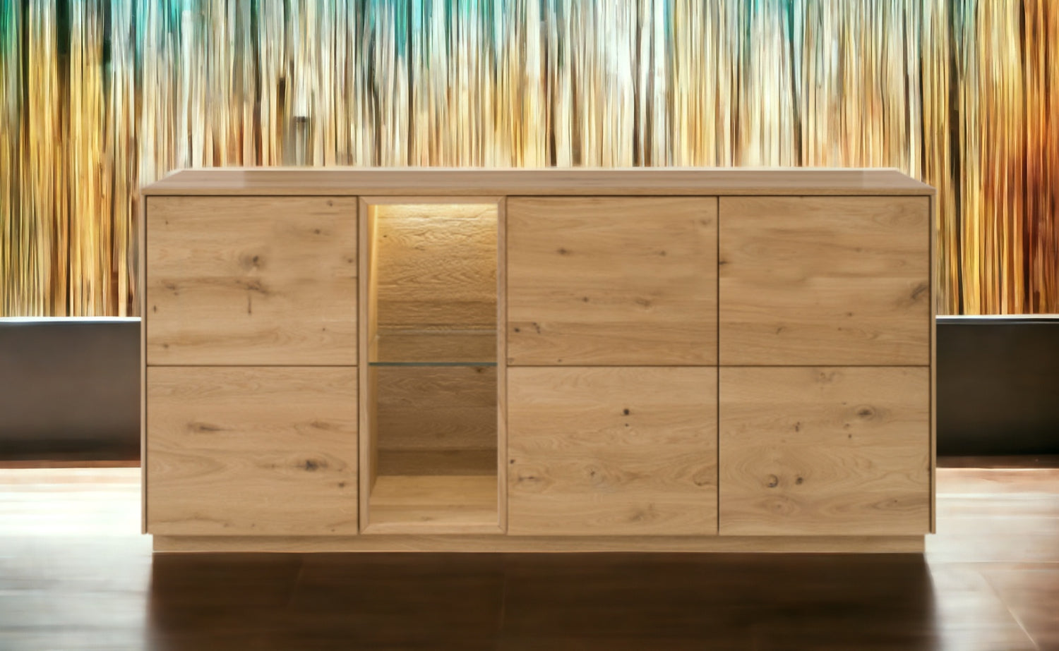 3-türig und offenes Fach, Wildeiche Natur geölt (optional Wildeiche Bianco geölt = gleiche Preis), inkl. Tip-on Beschläge, inkl. Beleuchtung. Lieferzeit ca. 5-8 Wochen.