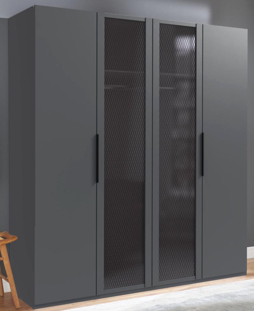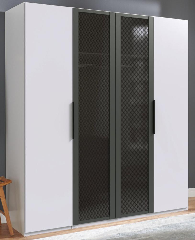 Drehtürenschrank 4-türig mit 2 Abteilungen inkl. Seiten ca: 100/100 cm, inkl. 2 Einlegeböden und 2 Kleiderstangen. Korpus und Front Weiß, Absetzung Graphit + Wabenglas Grey.