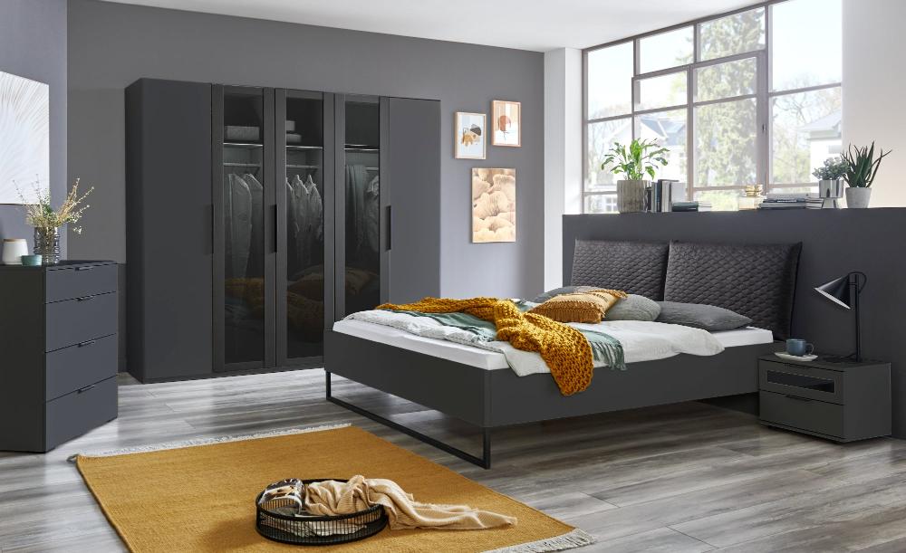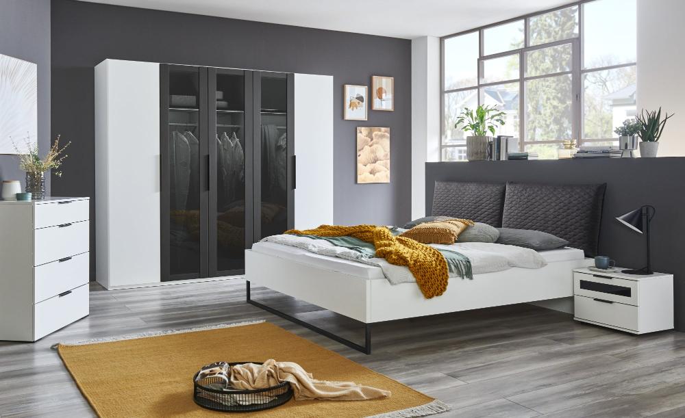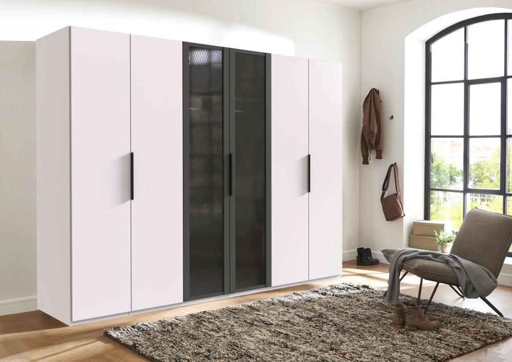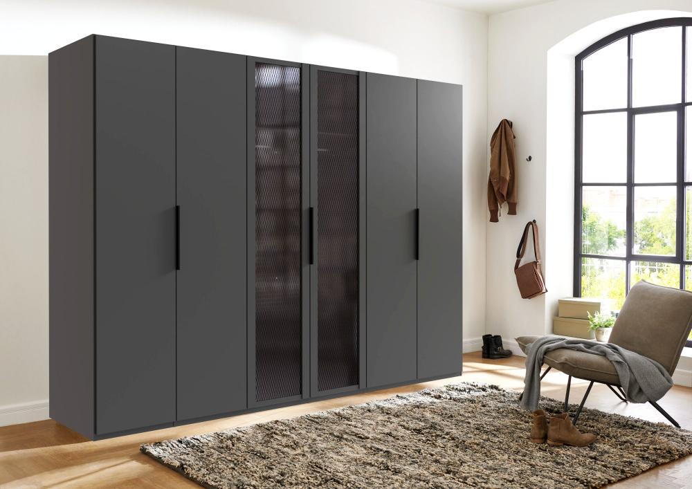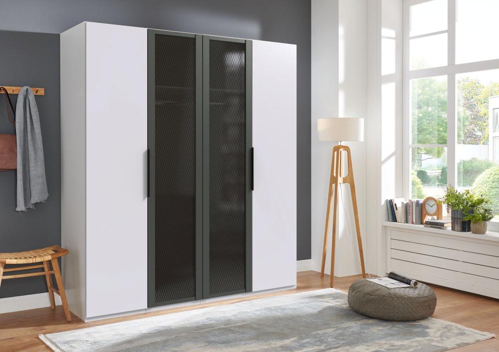 Der Schrank ist in den eleganten Farben Weiß und Graphit erhältlich, was ihm eine zeitlose und moderne Ausstrahlung verleiht. In der Mitte befinden sich hochwertige Glastüren, die dem Schrank eine besondere Eleganz verleihen und gleichzeitig den Raum optisch vergrößern.