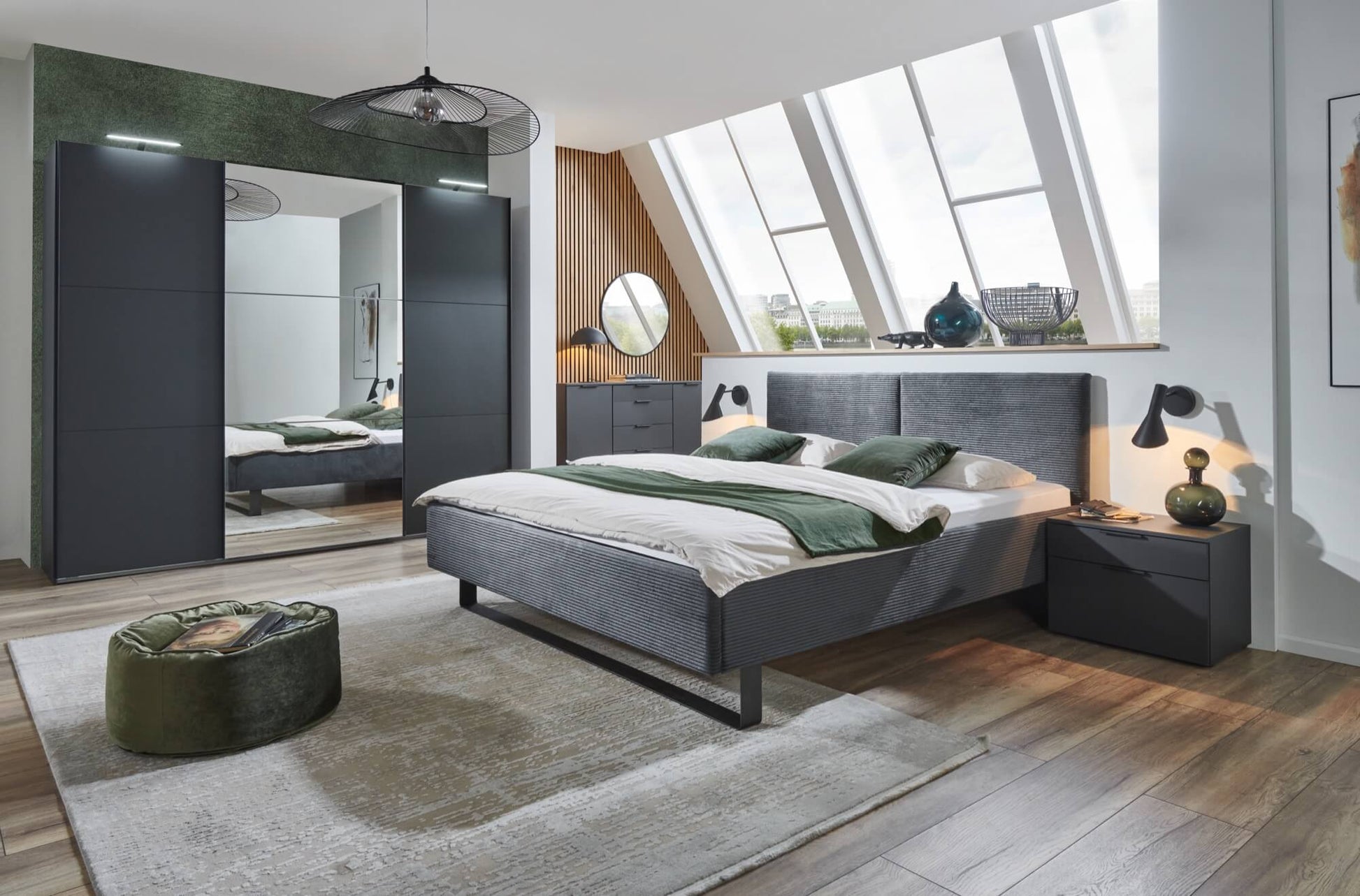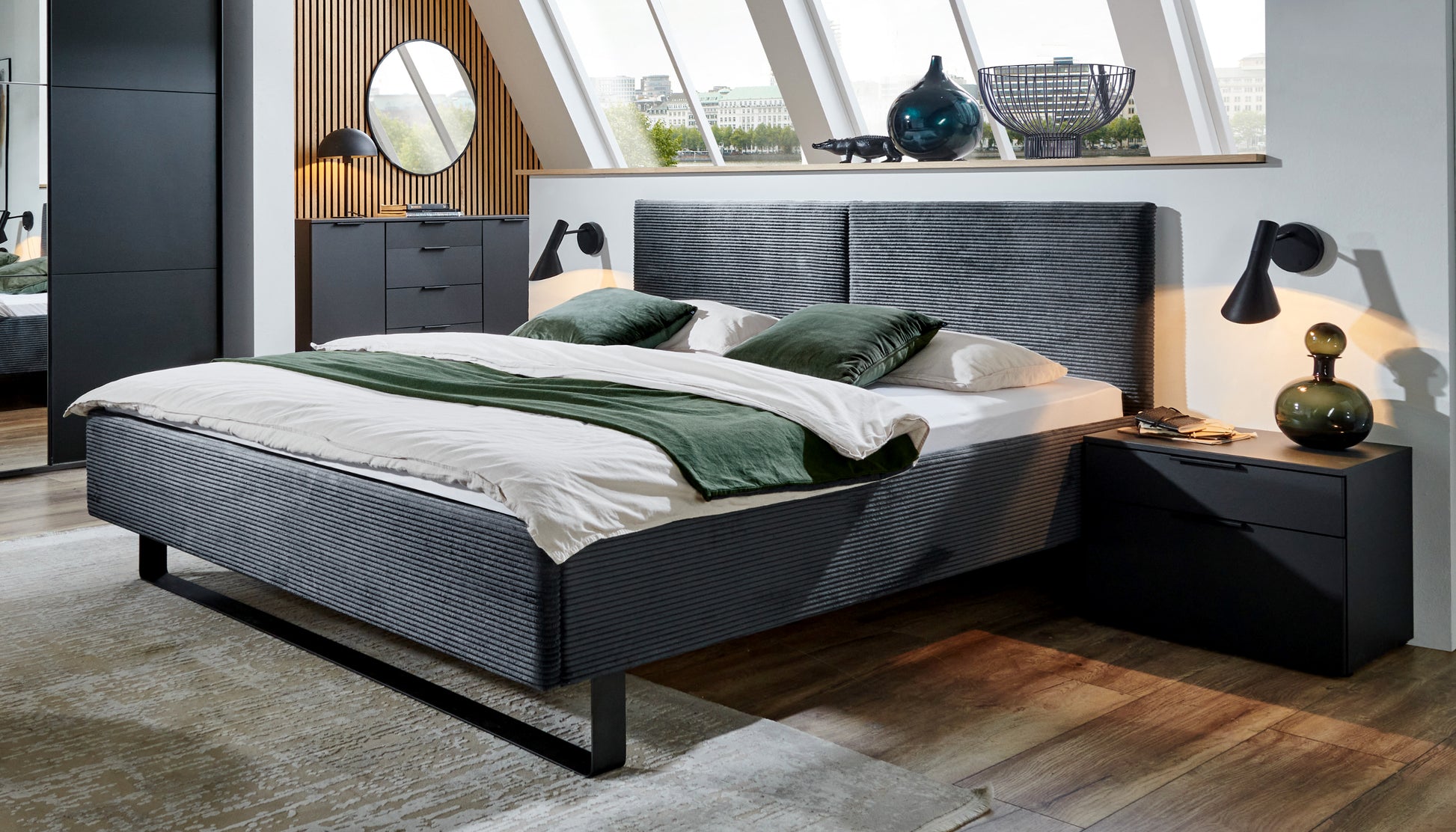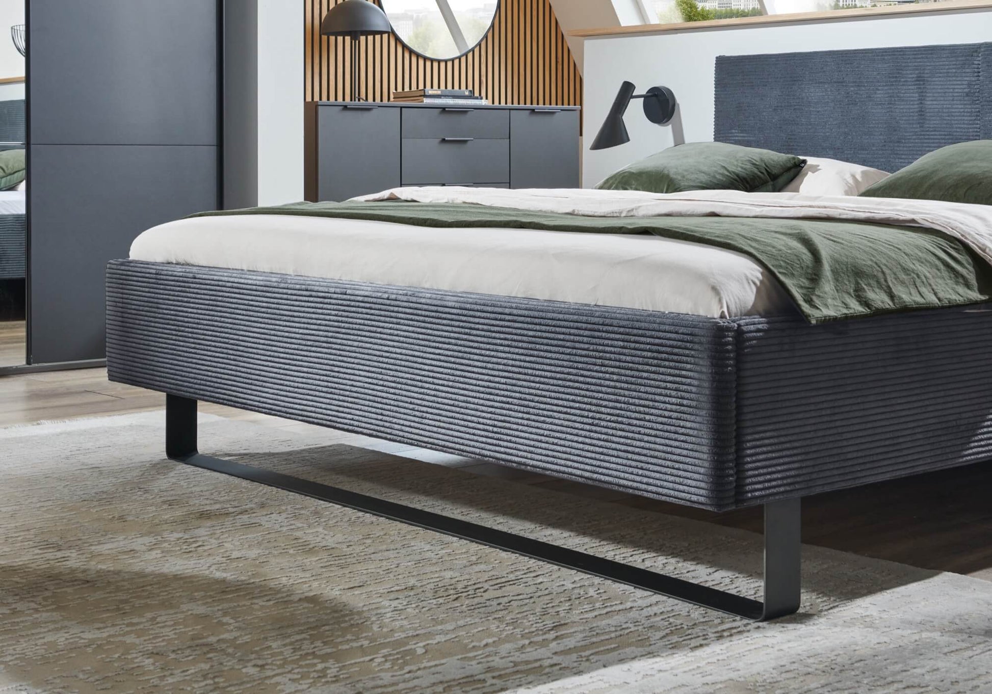 Höhenverstellbar, Inkl. Bettpolster, Farbe: Cord dunkelgrau. Ohne Deko, Lattenrost und Matratzen.