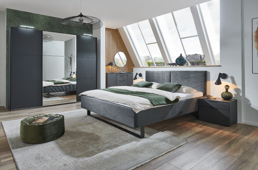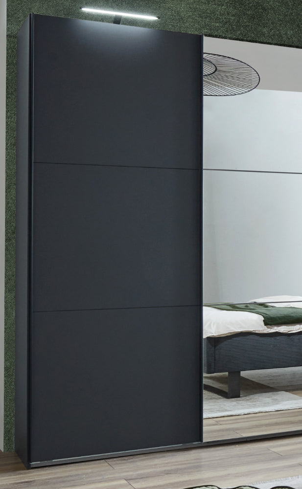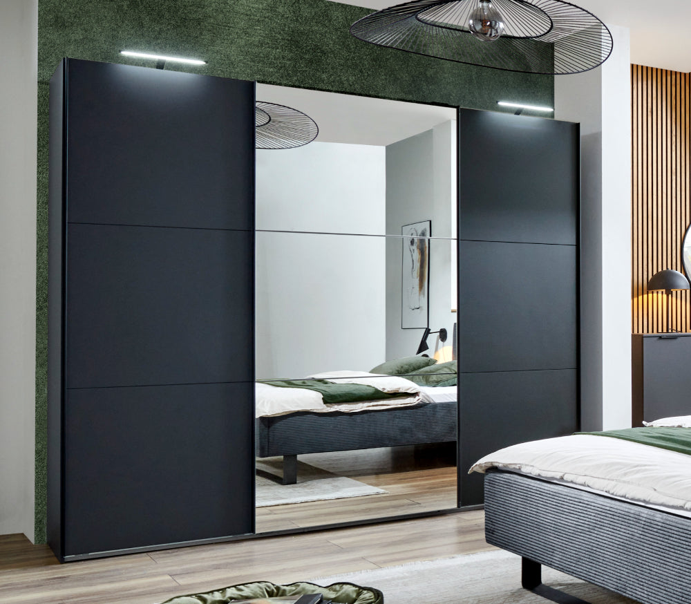 Der elegante Graphit-Ton verleiht dem Schrank eine markante, moderne Ausstrahlung, die in jedem Raum sofort ins Auge fällt. Die mittlere Tür aus Spiegelglas ist nicht nur ein optisches Highlight, sondern erweitert den Raum und verleiht ihm eine faszinierende Tiefe.