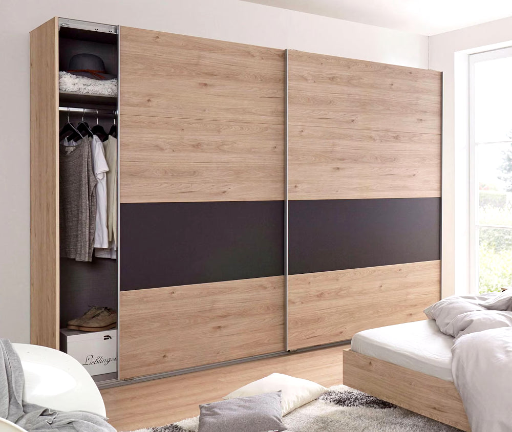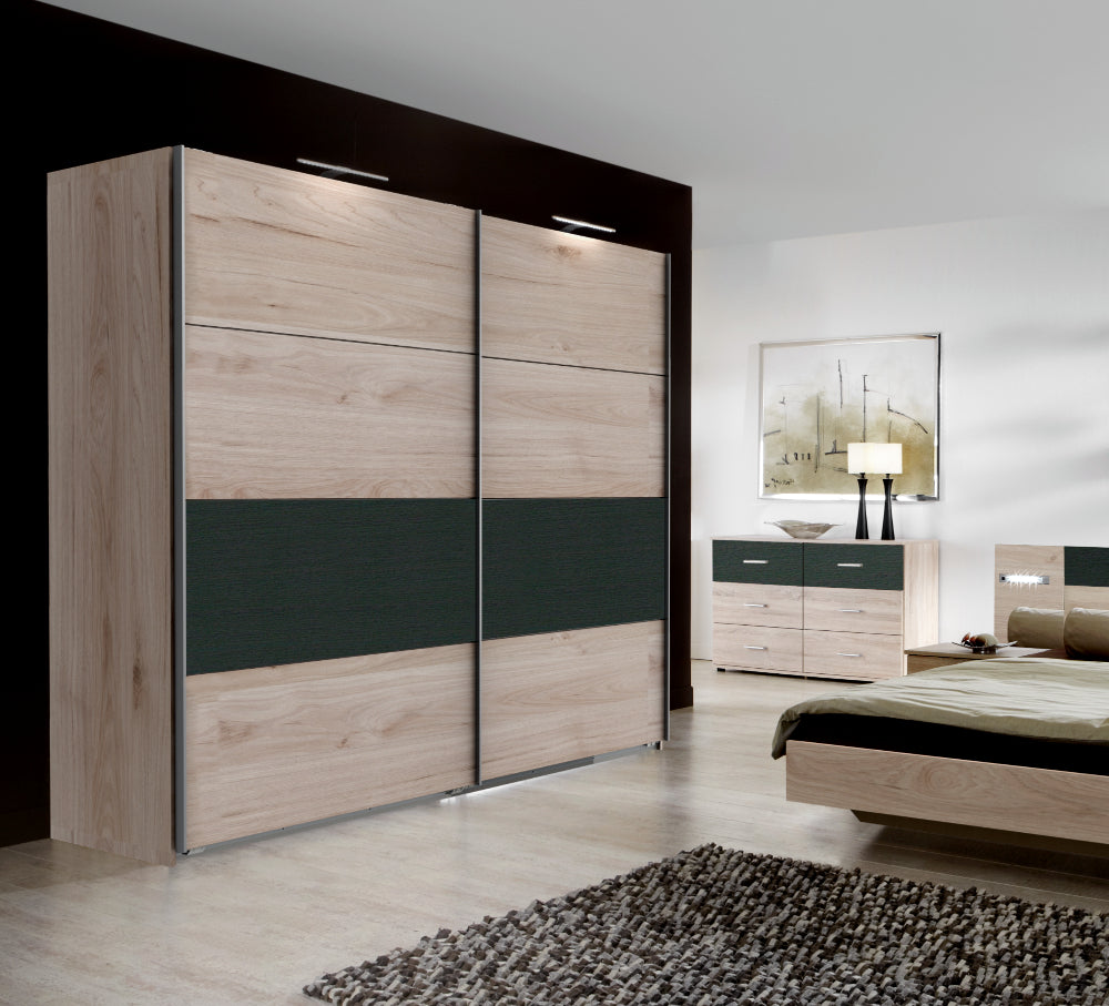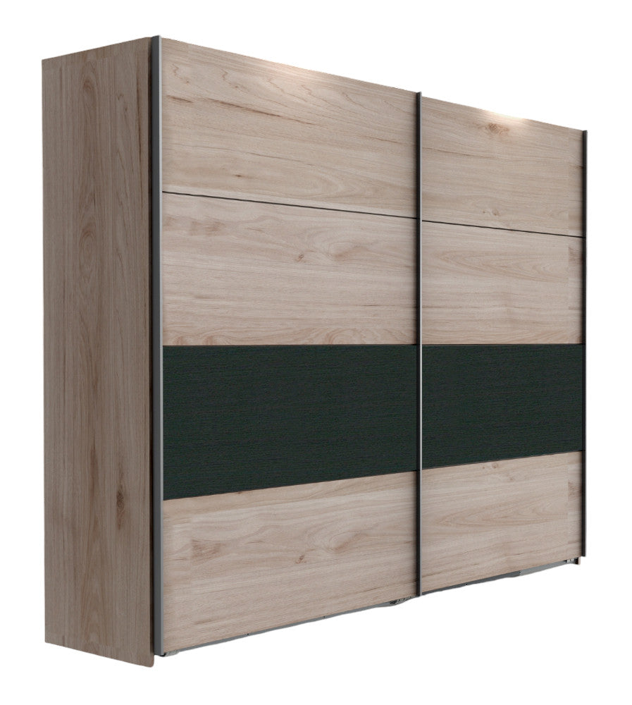 Schwebetürenschrank 2-türig mit 2 Abteilungen inkl. Seiten ca. 112,5/112,5 cm, inkl. 2 Einlegeböden und 2 Kleiderstangen. Dekor: Korpus und Front Hickroy-Oak-Nachbildung, Abs. Graphit.
