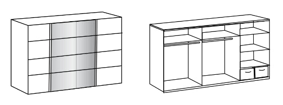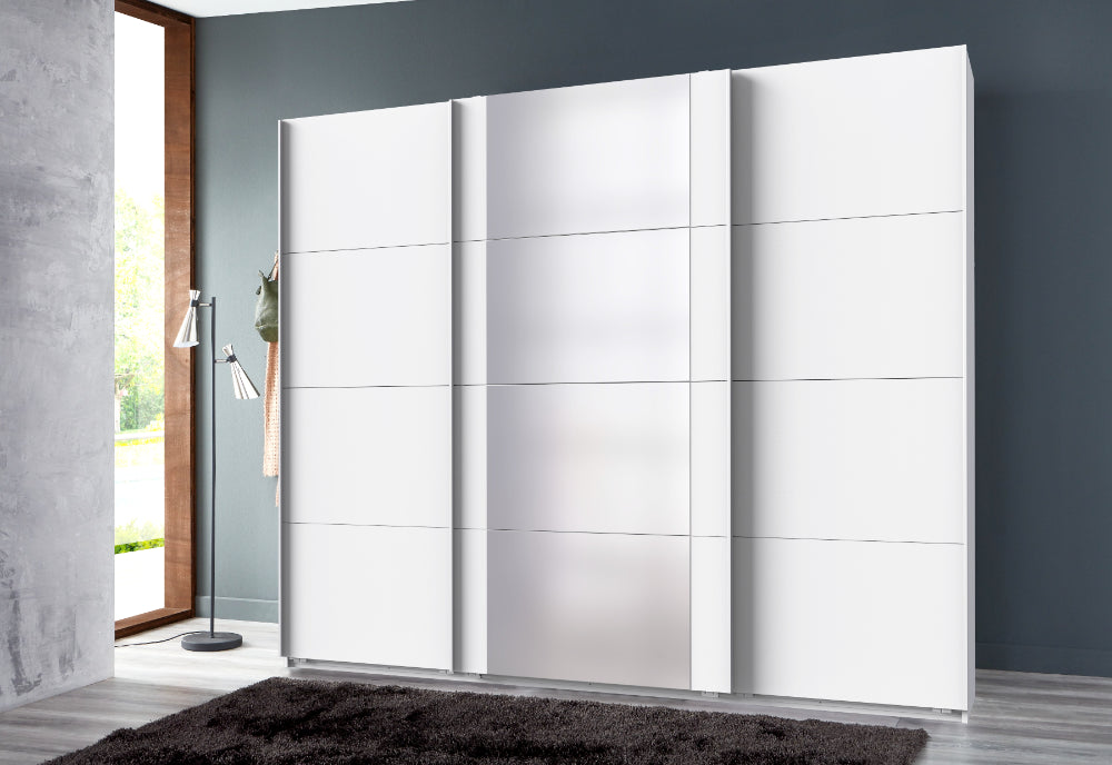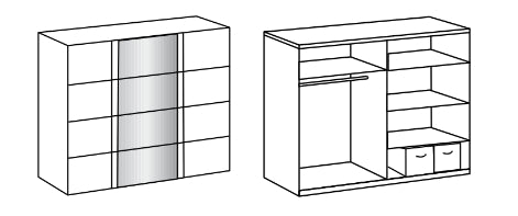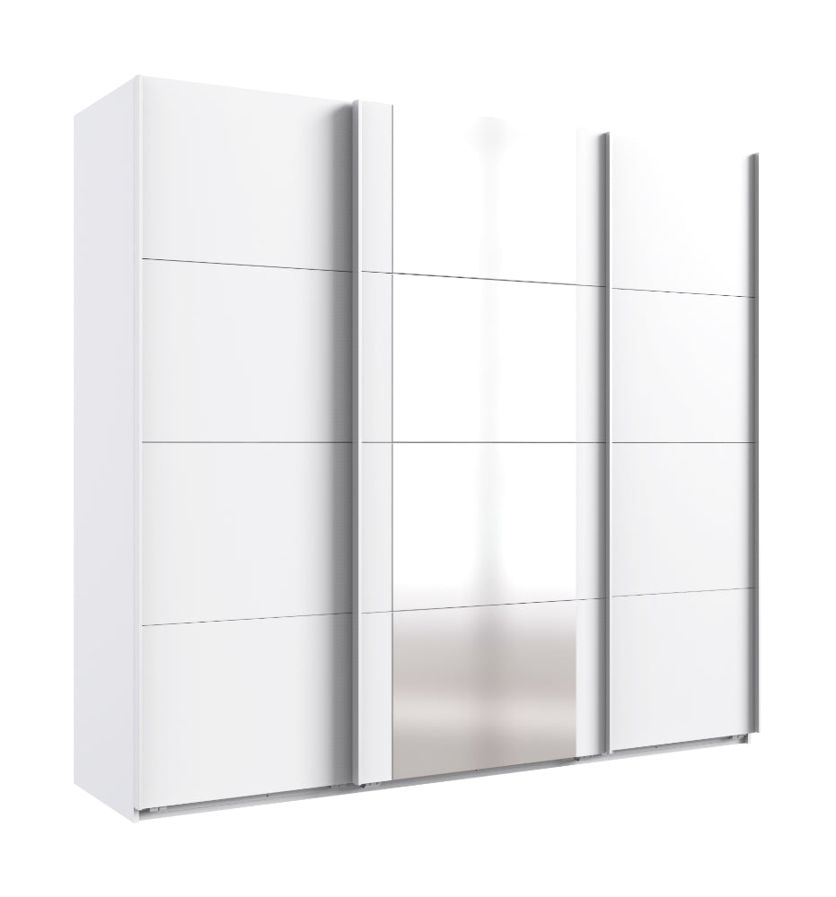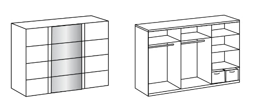 Schwebetürenschrank 3-türig mit 2 Abteilungen inkl. Seiten ca: 112,5/112,5 cm, inkl. 4 Einlegeböden und 1 Kleiderstange, inkl. 2 Stoffboxen. Dekor: Korpus und Front Weiß, Absetzung in Weiß, in der Mitte Spiegeltür, Griffe in Korpusfarbe.