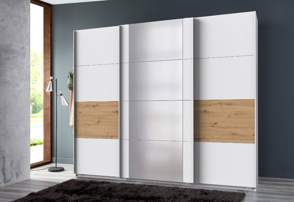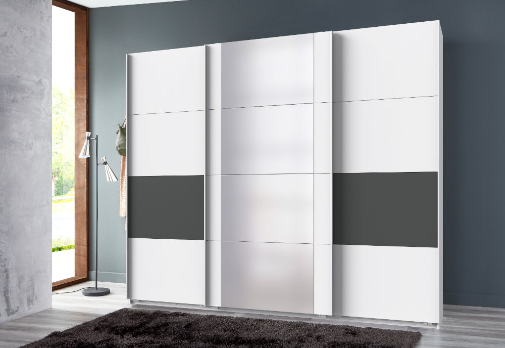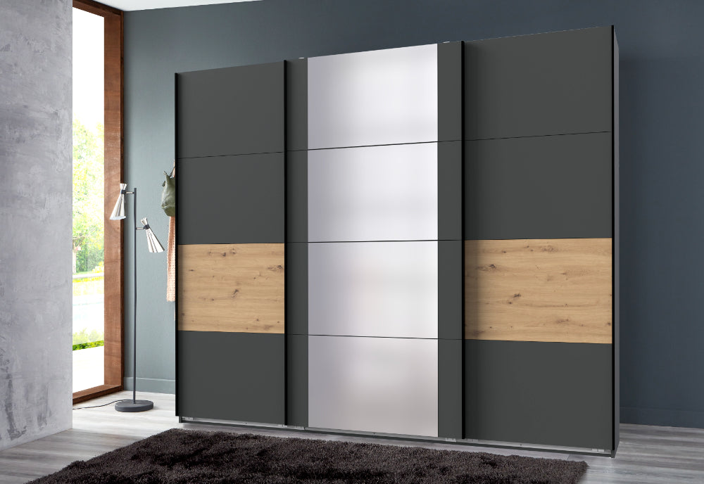 Der Schwebetürenschrank Barmbek von Wimex ist die perfekte Kombination aus schlichter Eleganz und cleverem Stauraumkonzept. Wählen Sie aus vier edlen Farbvarianten: Weiß, Weiß mit Absetzung in Graphit, Weiß mit Absetzung in Artisan-Eiche oder Graphit mit Absetzung in Artisan-Eiche. Die mittlere Tür ist mit einem großzügigen Spiegel ausgestattet, der Ihrem Schlafzimmer nicht nur Stil, sondern auch ein Gefühl von Weite und Helligkeit verleiht.