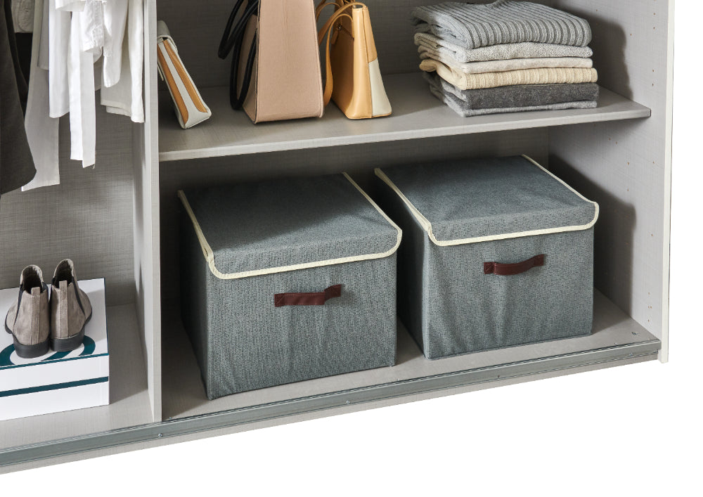 Der Schrank überzeugt nicht nur durch seine ästhetische Optik, sondern auch durch praktische Extras: Zusätzlich zu den Schwebetüren, die leicht und geräuschlos gleiten, erhalten Sie extra Einlegeböden und zwei Stoffboxen, die Ihnen dabei helfen, Ihre Kleidung und Accessoires perfekt zu organisieren. So vereint dieser Schrank Funktionalität und Design auf höchstem Niveau.
