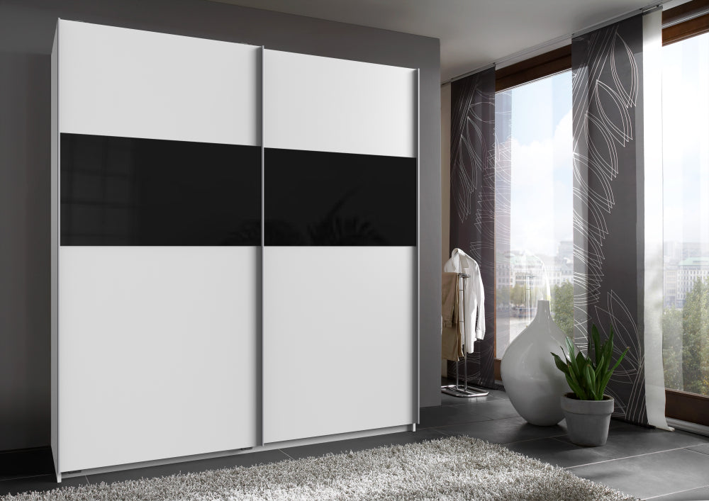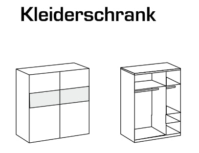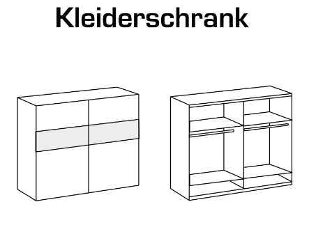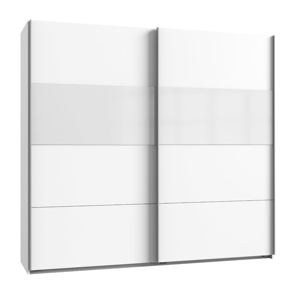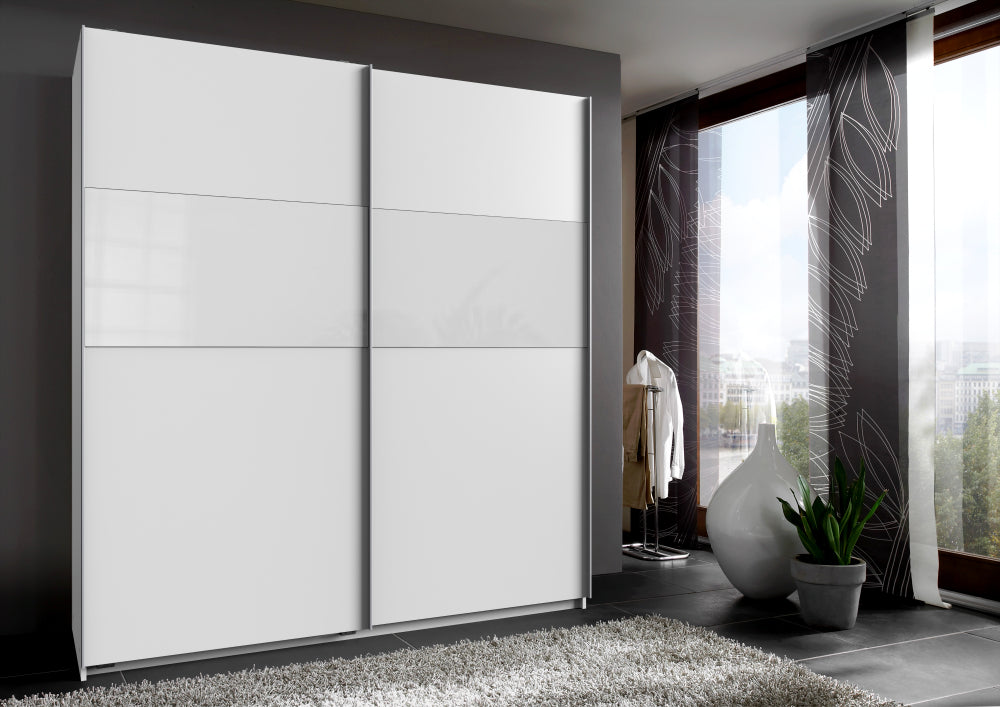 Schwebetürenschrank 2-türig mit 2 Abteilungen inkl. Seiten ca.: 90/45 cm, 4 Einlegeböden und 2 Kleiderstangen. Dekor: Weiß, Abs. Glas Weiß.