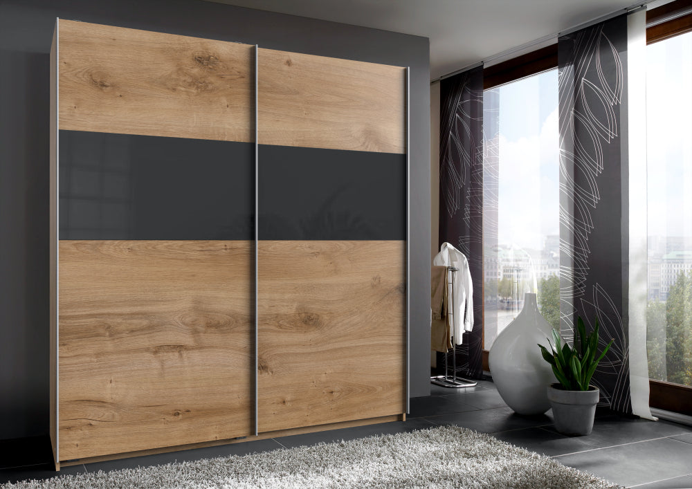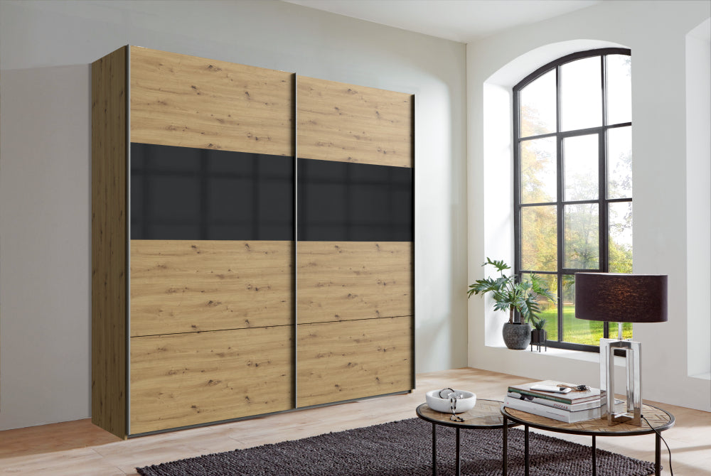 Der Schwebetürenschrank Bramfeld von Wimex ist nicht einfach nur ein Schrank – er ist ein Kunstwerk der modernen Innenarchitektur. Mit seinen eleganten Farbglaselementen auf den Türen bringt dieser Schrank einen Hauch von Luxus in Ihr Schlafzimmer und schafft eine beeindruckende visuelle Dynamik. Sie können aus sechs faszinierenden Farbkombinationen wählen, die Ihrem Raum eine individuelle Note verleihen und perfekt zu Ihrer Einrichtung passen. Die Schwebetüren ermöglichen einfaches Öffnen und Schließen, während die verschiedenen Farbvarianten des Korpus - Weiß, Plankeneiche-Nachbildung, Graphit und Artisan-Eiche-Nachbildung - einen individuellen Stil ermöglichen.