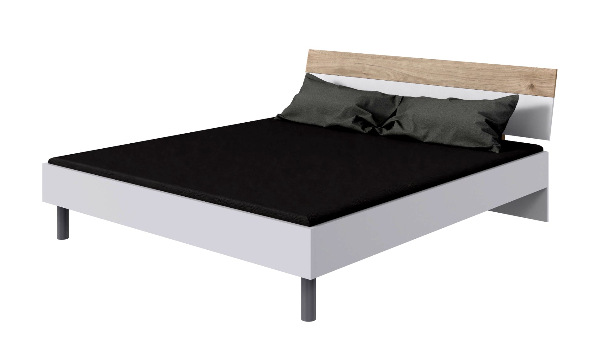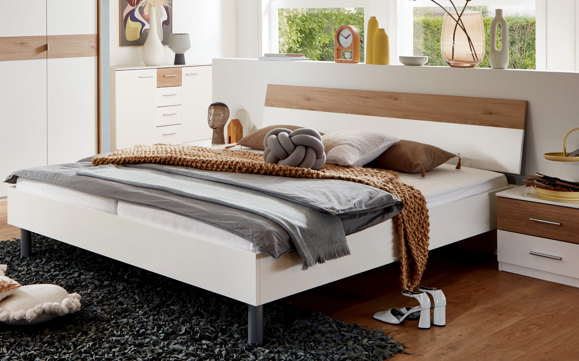 Weiß, Abs. + Rahmen Hickory-oak Nachbildung. Ohne Deko, ohne Lattenrost, ohne Matratzen.