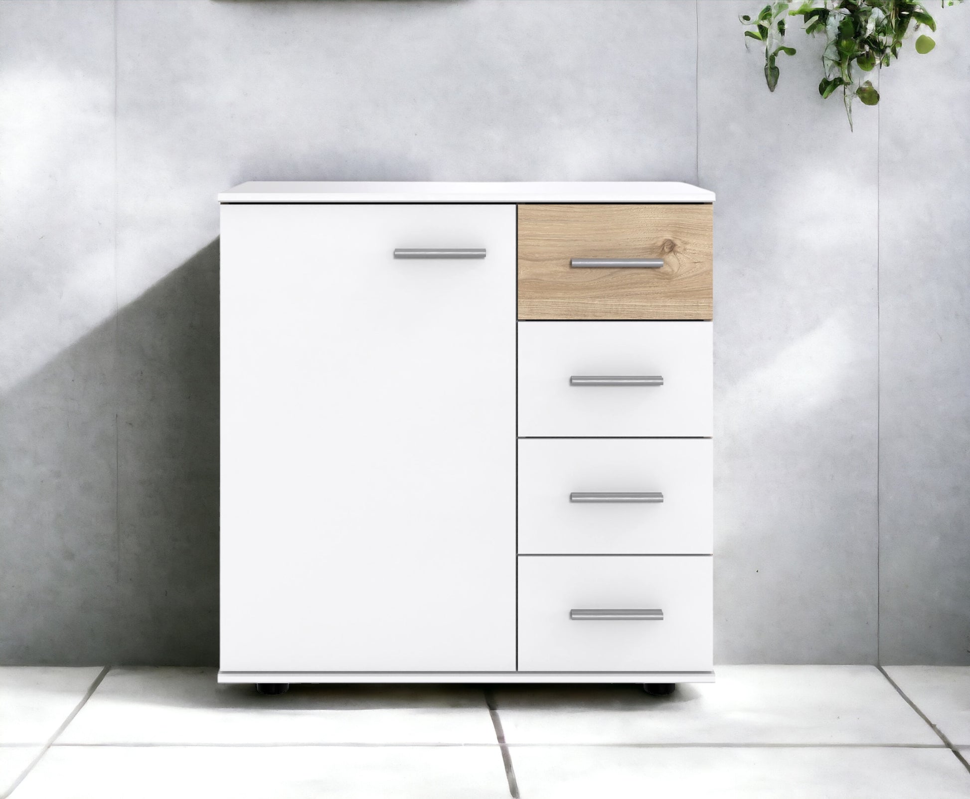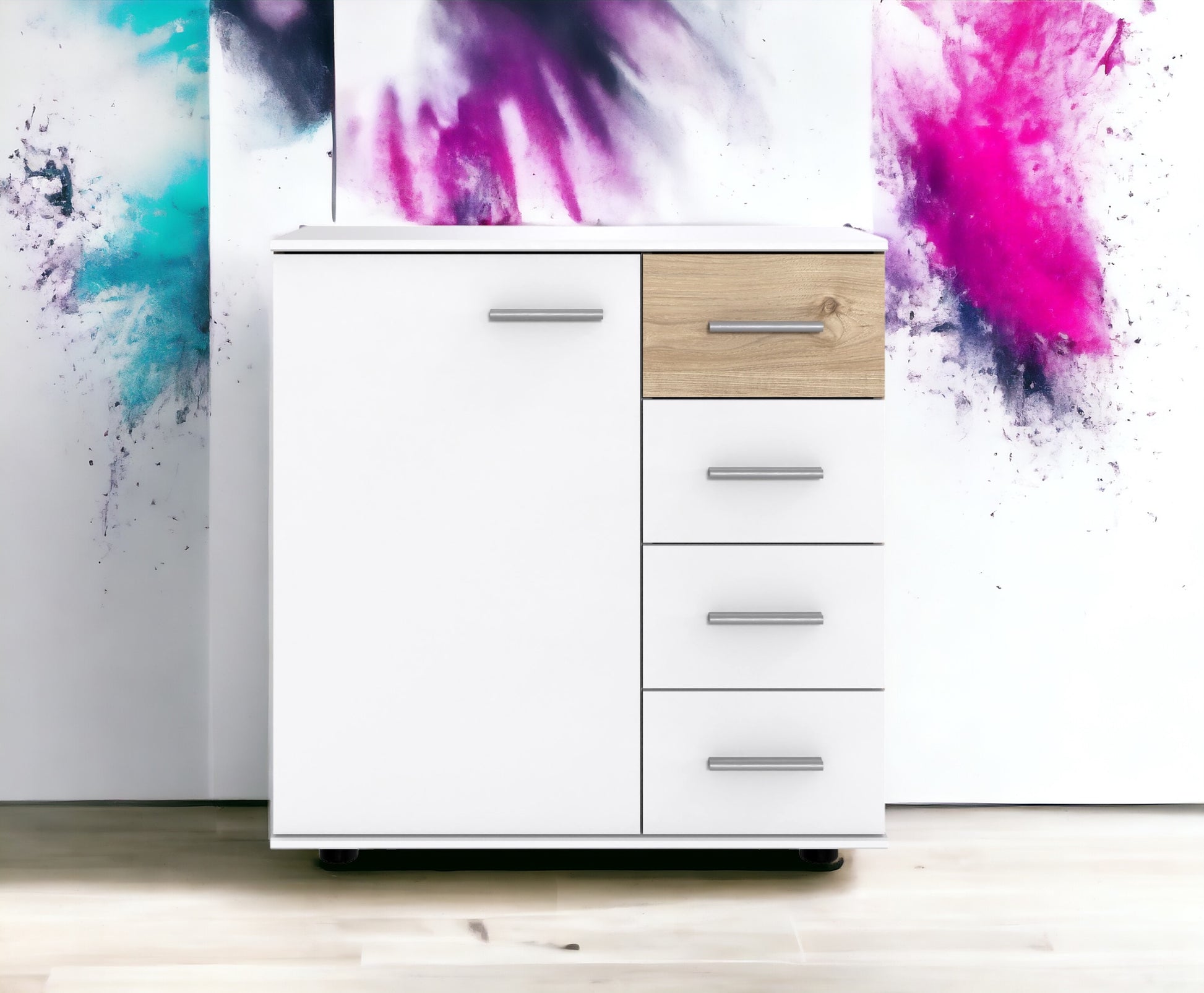 Tür links und 4 Schubladen rechts, inkl. 2 Einlegeböden, Weiß, Abs. Hickory-Oak Nachbildung.