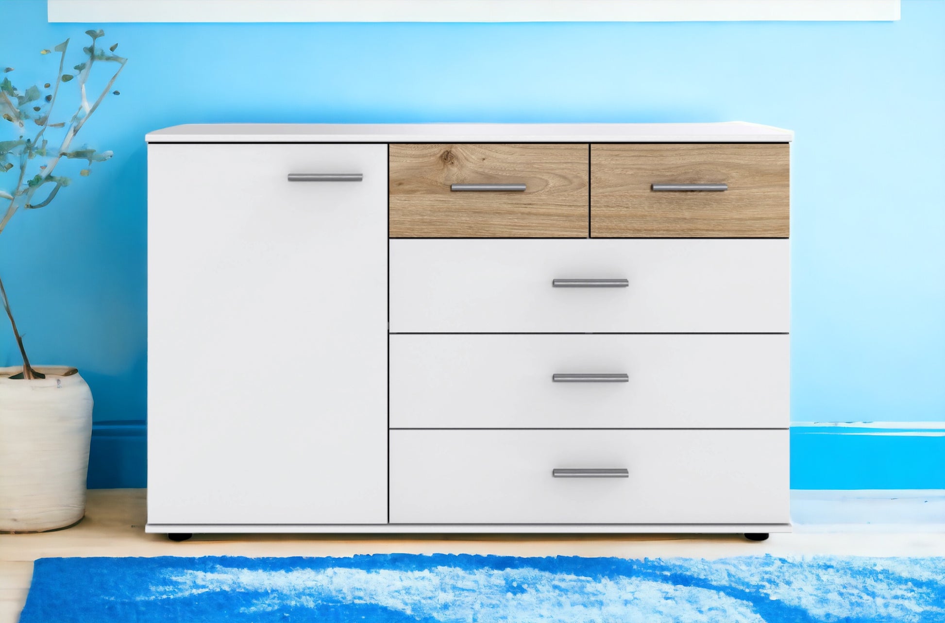 Tür links und 5 Schubladen rechts, inkl. 2 Einlegeböden, Weiß, Abs. Hickory-Oak Nachbildung.