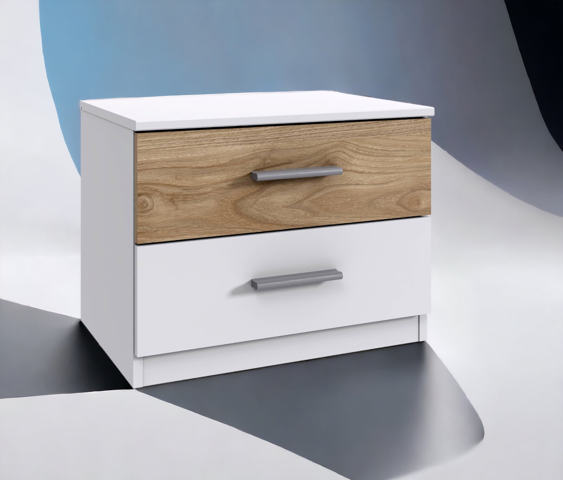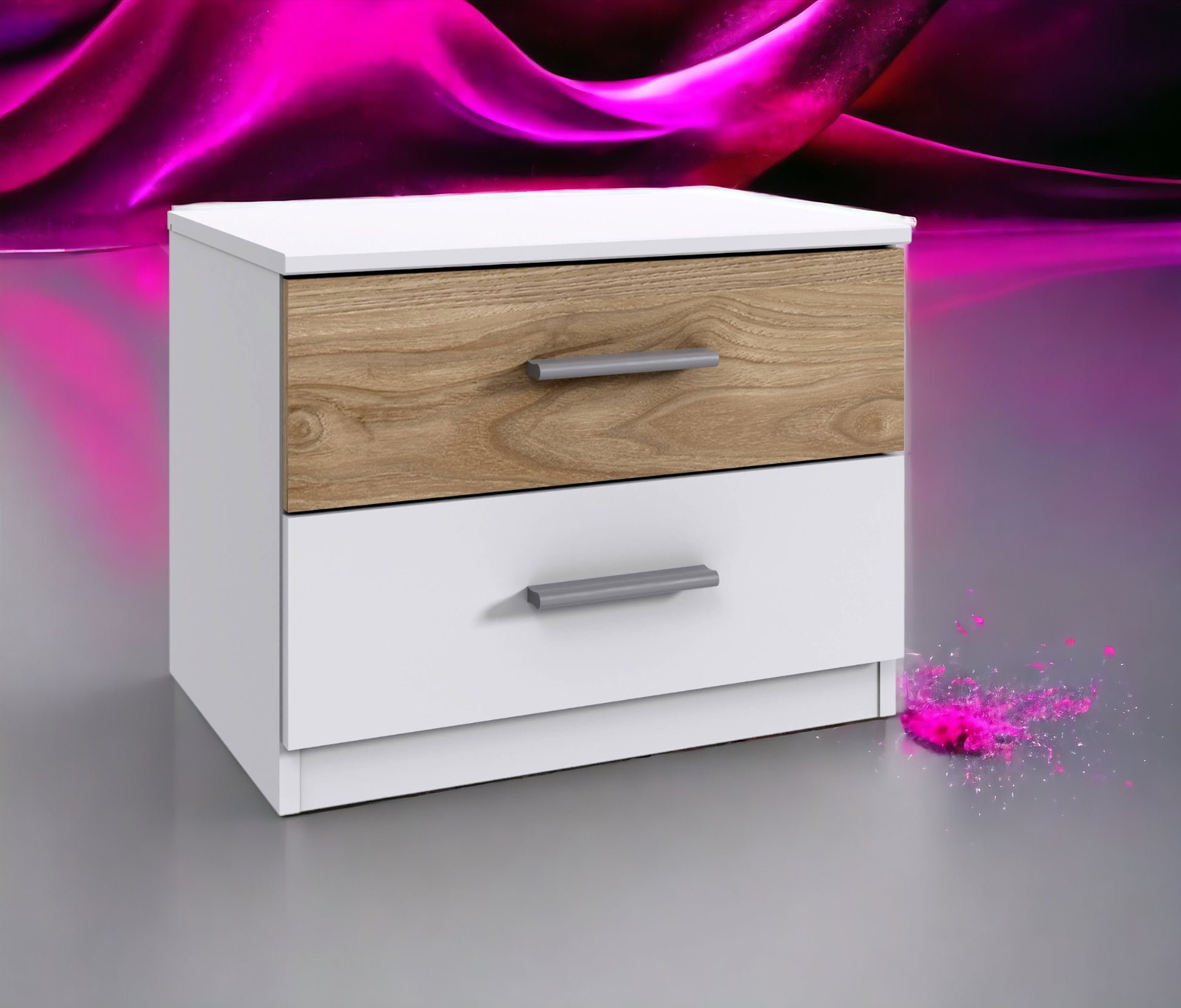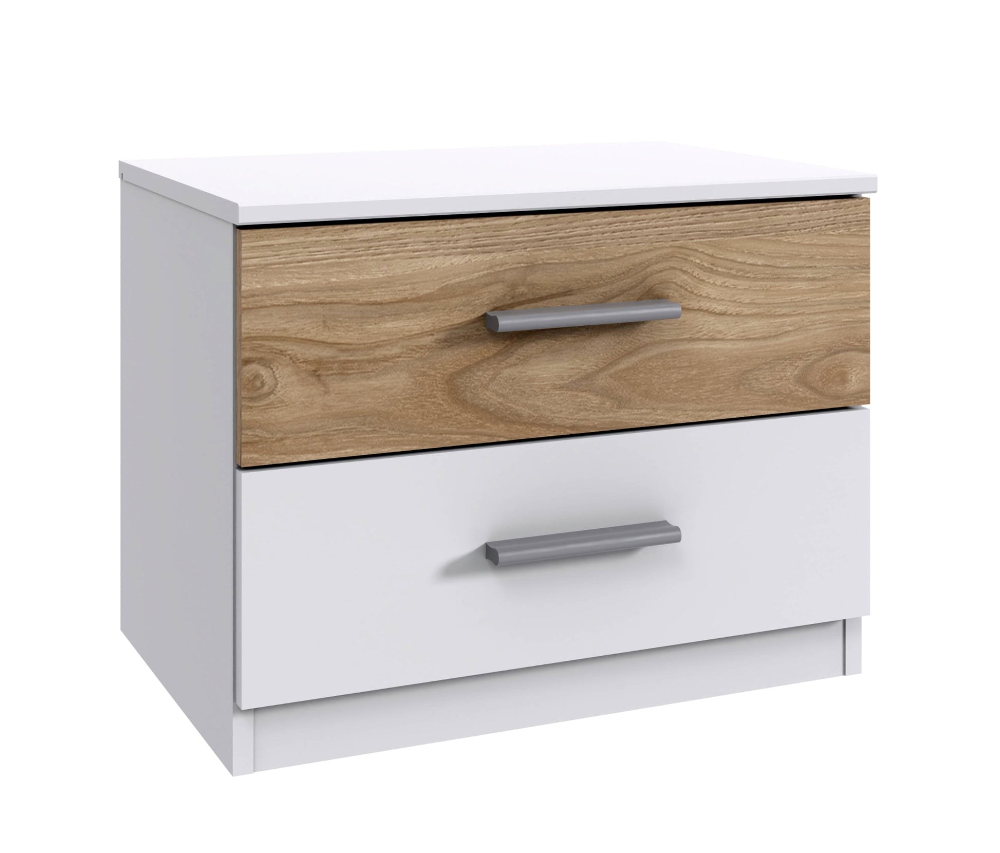 2 Schubladen. Weiß, Abs. + Rahmen Hickory-oak Nachbildung, obere Schublade in Absetzfarbe.