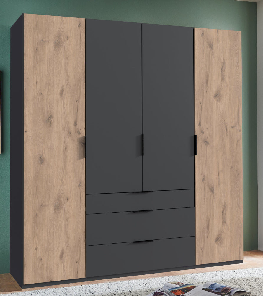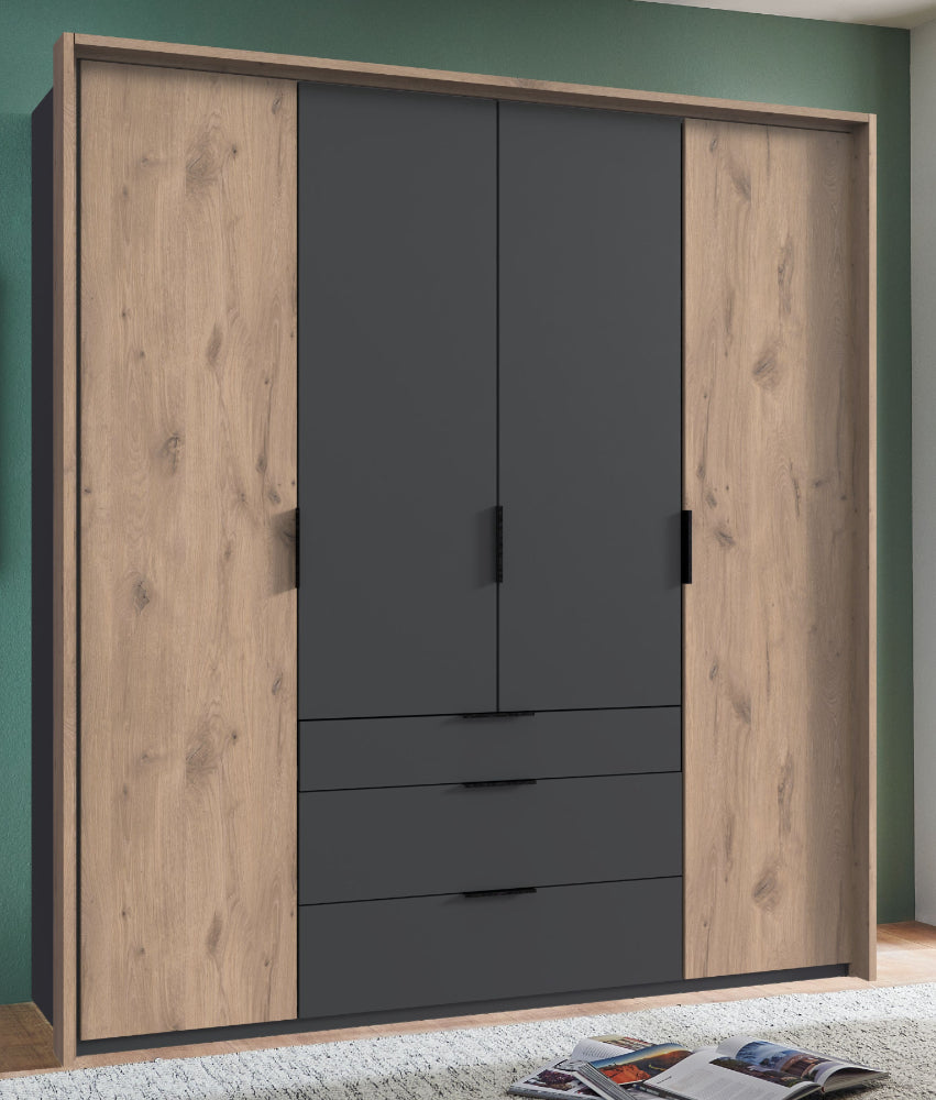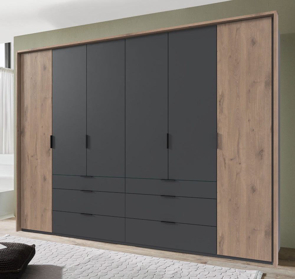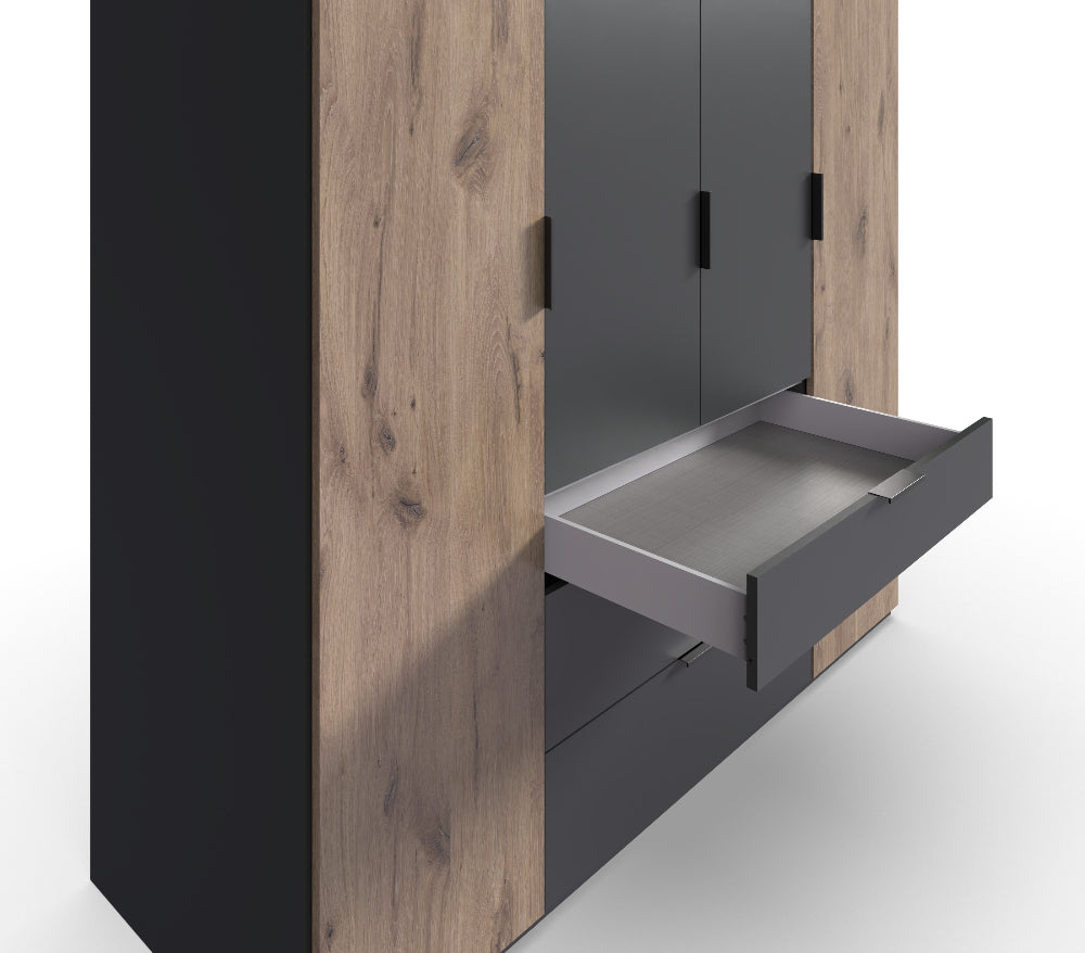 Drehtürenschrank 4-türig mit 3 Abteilungen inkl. Seiten ca.: 50/100/50 cm, inkl. 3 Einlegeböden + 3 Kleiderstangen, 3 Schubladen. Dekor: Korpus und Front Graphit, Absetzung und Rahmen Viking-oak-Nachbildung.