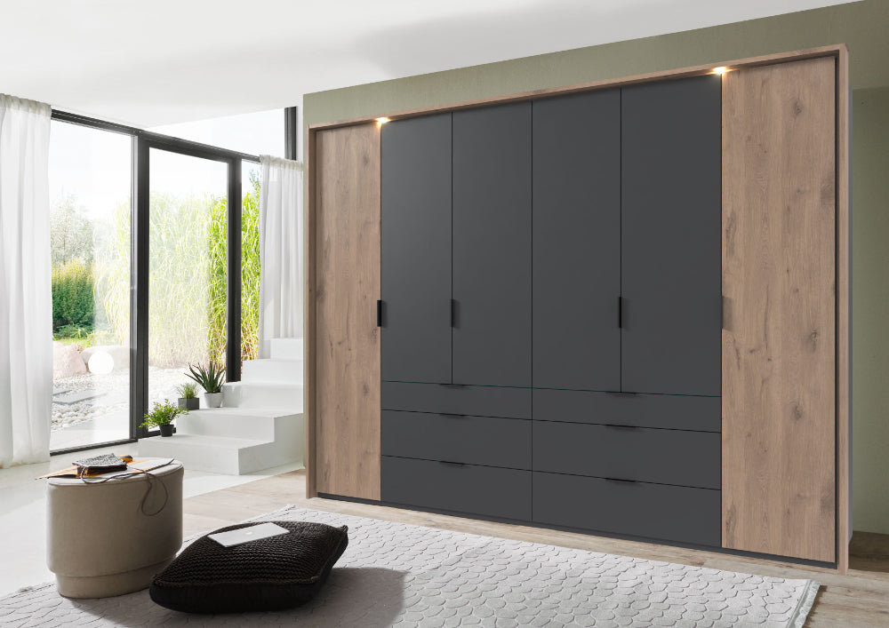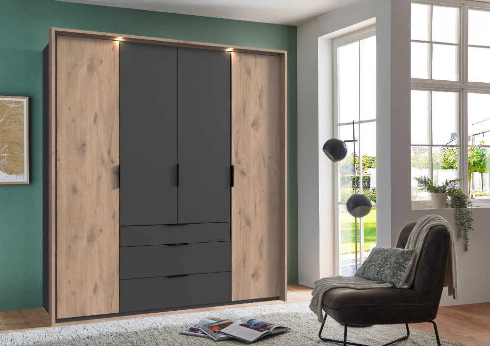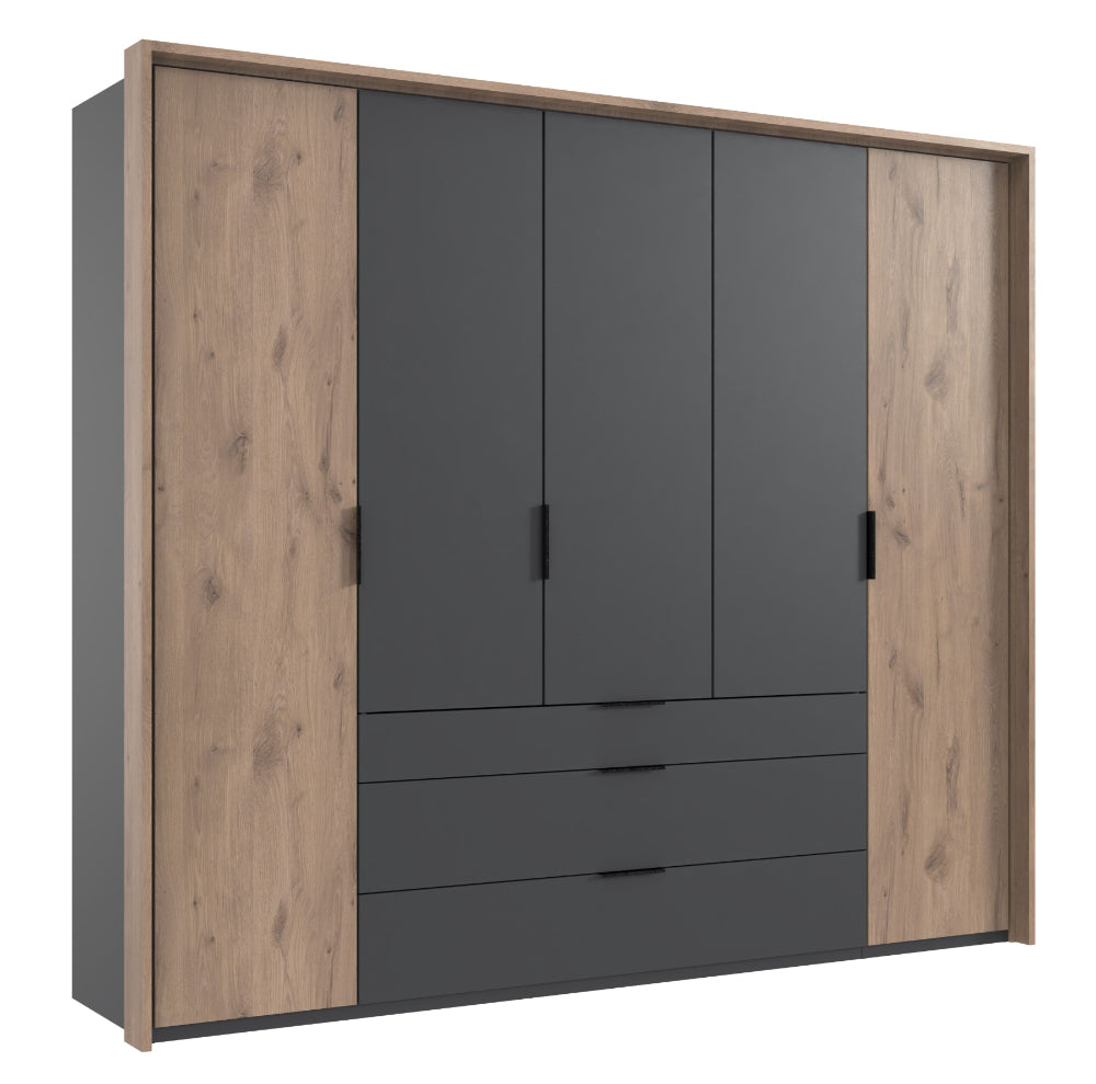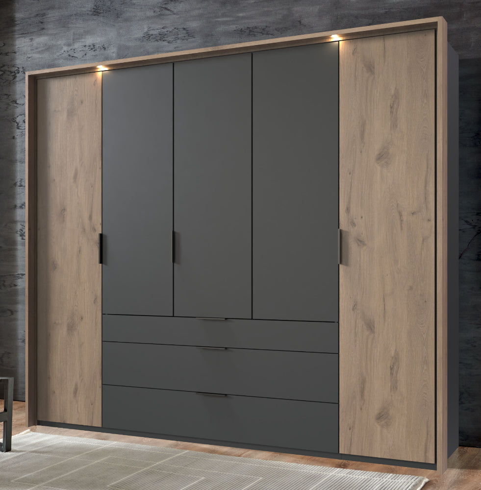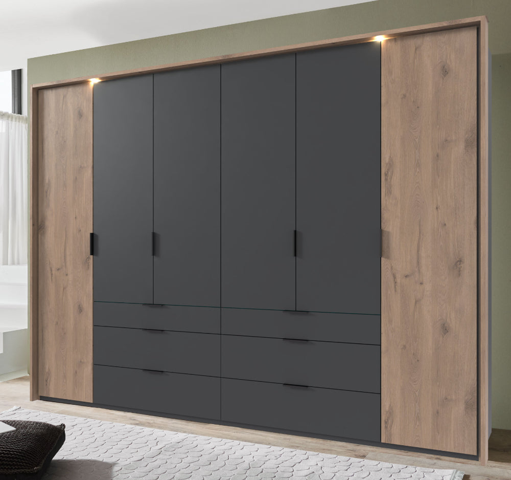 Drehtürenschrank 4-türig mit 3 Abteilungen inkl. Seiten ca.: 50/100/50 cm, inkl. 3 Einlegeböden + 3 Kleiderstangen, 3 Schubladen. Dekor: Korpus und Front Graphit, Absetzung und Rahmen Viking-oak-Nachbildung.