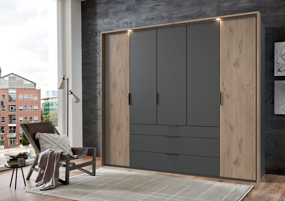 Mit seiner modernen Kombination aus graphitfarbenem Korpus und Front sowie den stilvollen Absetzungen in Viking-Eiche verleiht er Ihrem Raum ein elegantes und zeitloses Ambiente.