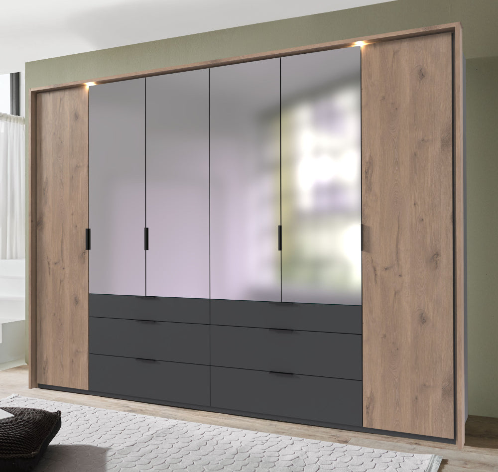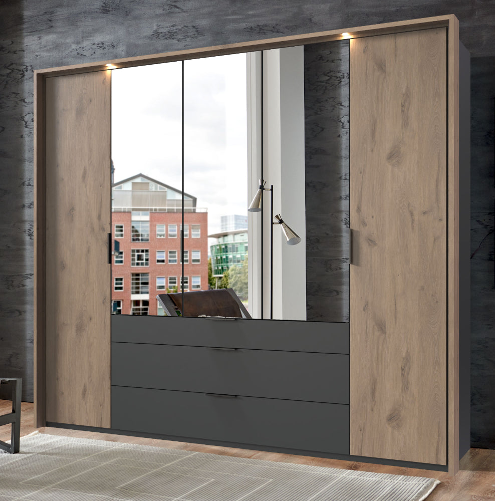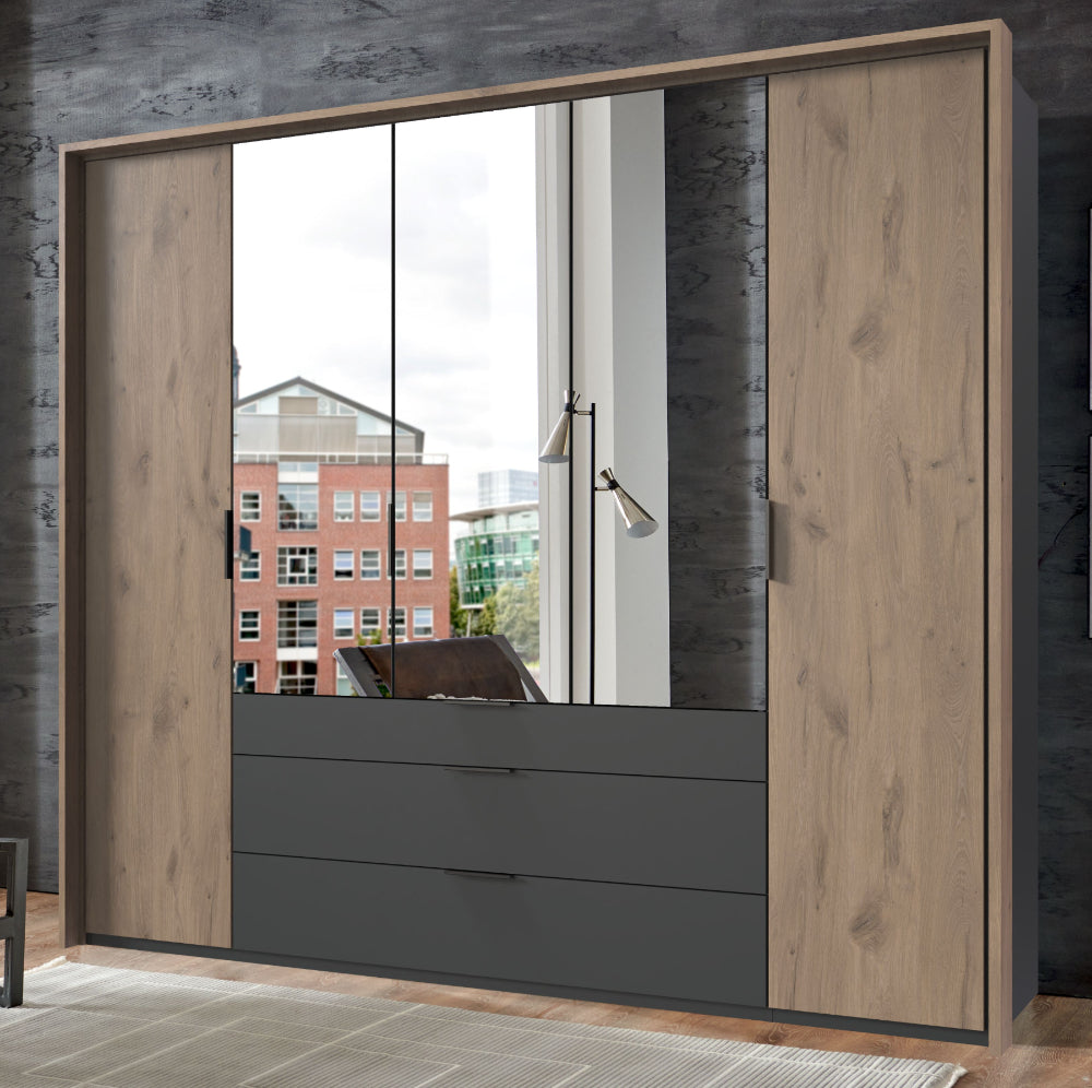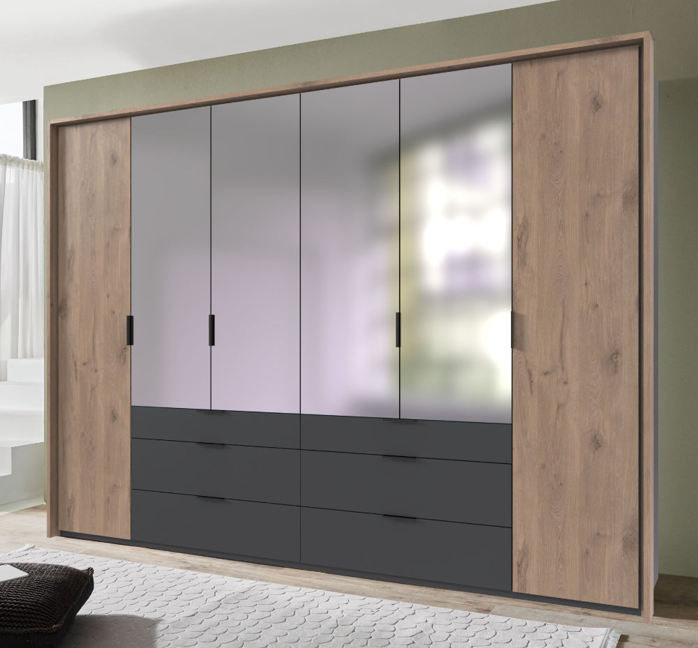 Drehtürenschrank 4-türig mit 3 Abteilungen inkl. Seiten ca.: 50/100/50 cm, inkl. 3 Einlegeböden + 3 Kleiderstangen, 3 Schubladen, in der Mitte oben 2 Spiegeltüren. Dekor: Korpus und Front Graphit, Absetzung und Rahmen Viking-oak-Nachbildung.