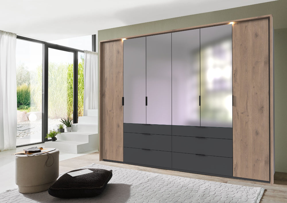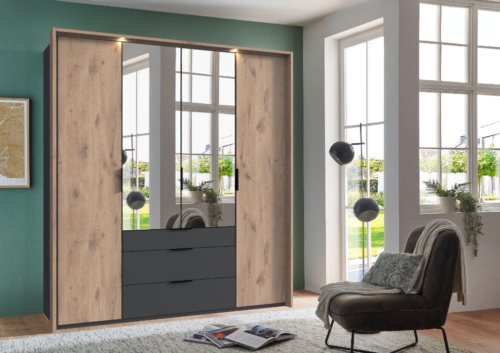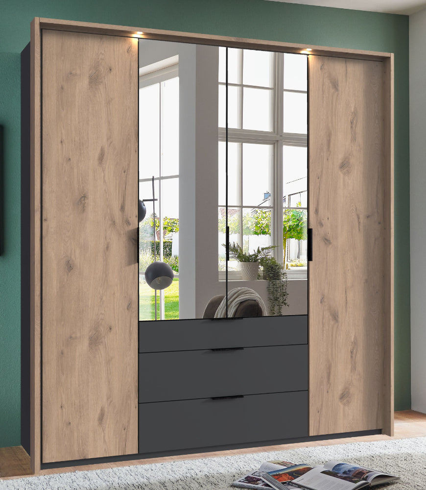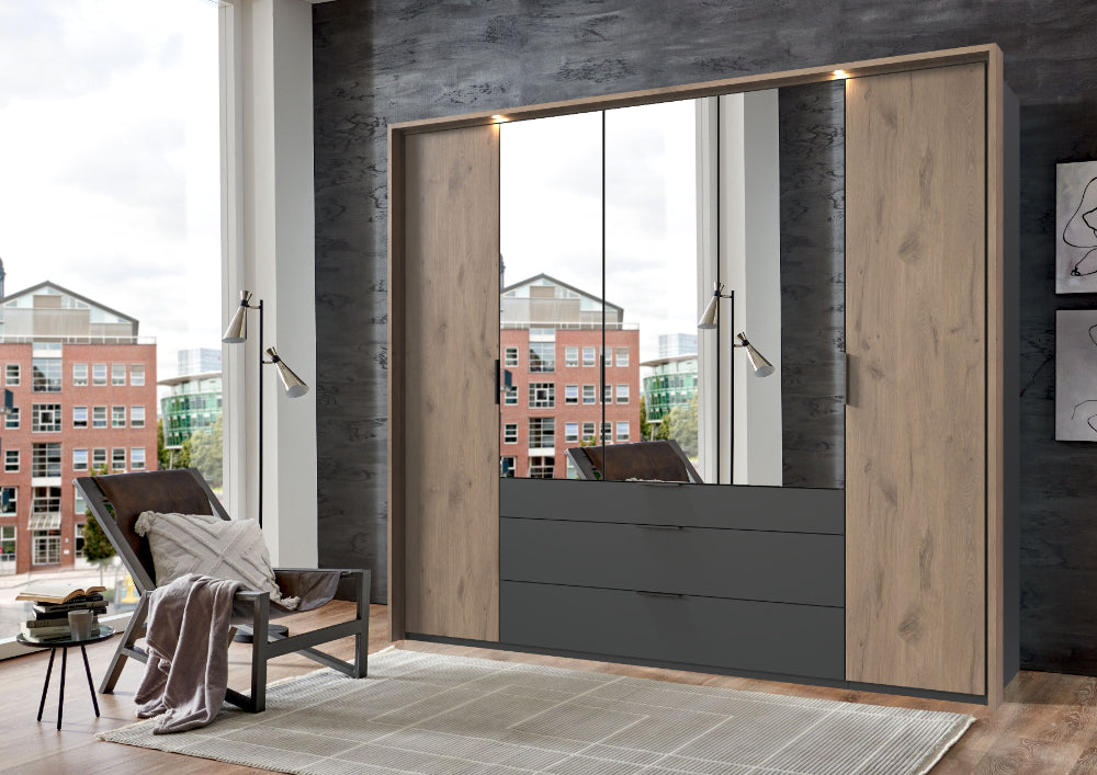 Drehtürenschrank 4-türig mit 3 Abteilungen inkl. Seiten ca.: 50/100/50 cm, inkl. 3 Einlegeböden + 3 Kleiderstangen, 3 Schubladen, in der Mitte oben 2 Spiegeltüren. Dekor: Korpus und Front Graphit, Absetzung und Rahmen Viking-oak-Nachbildung.