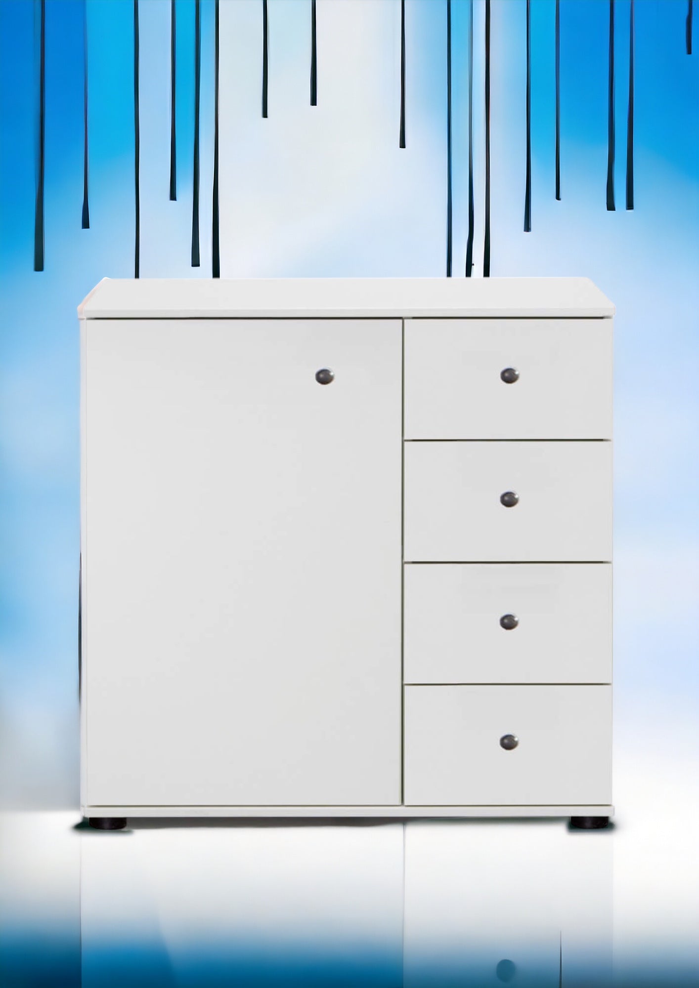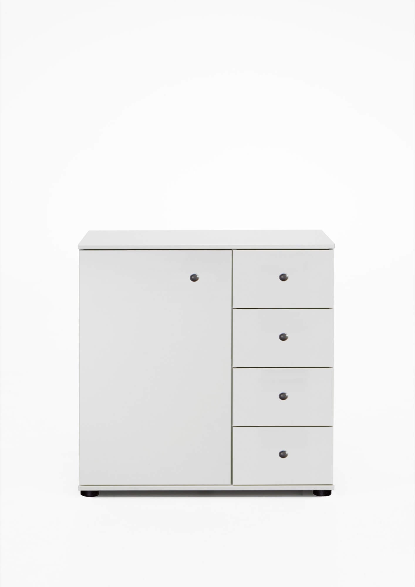 Tür links, Schubladen rechts. Inkl. 2 Einlegeböden, Front und Korpus Weiß.
