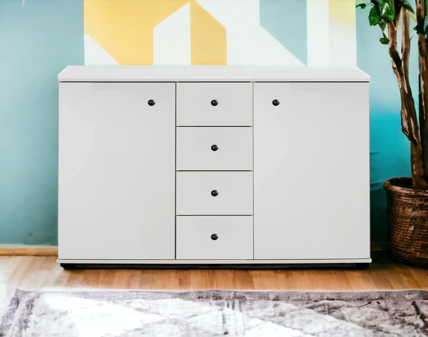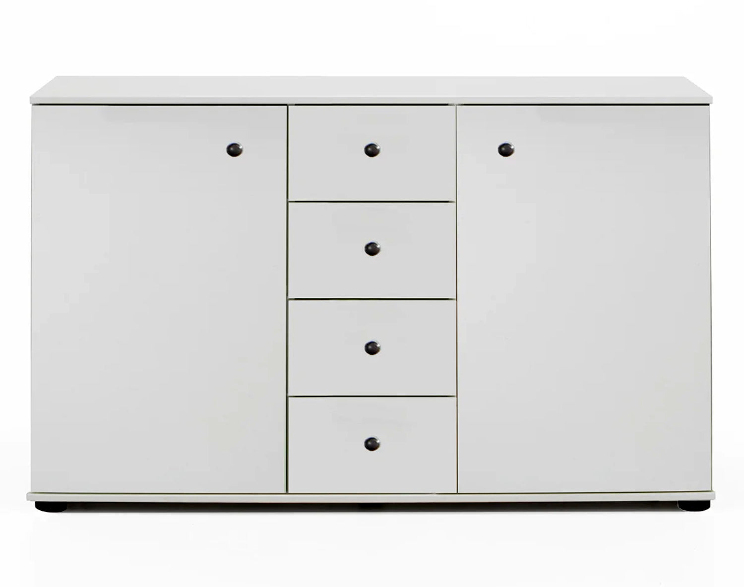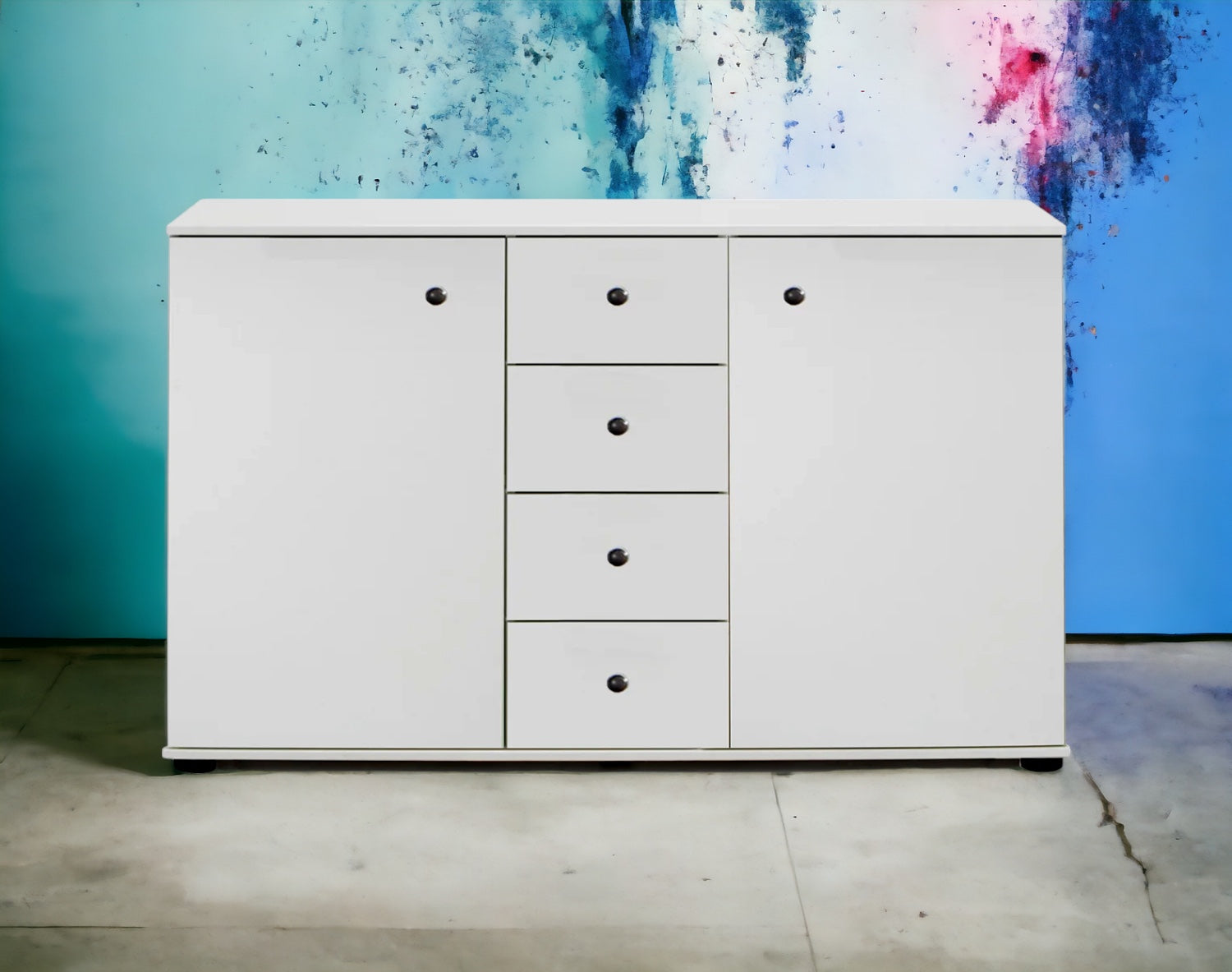 Türen links und recht, Schubaden in der Mitte. Ink. 2 x 2 Einlegeböden, Front und Korpus Weiß.