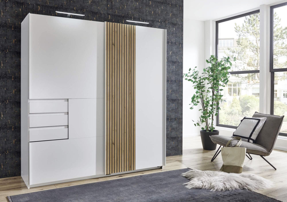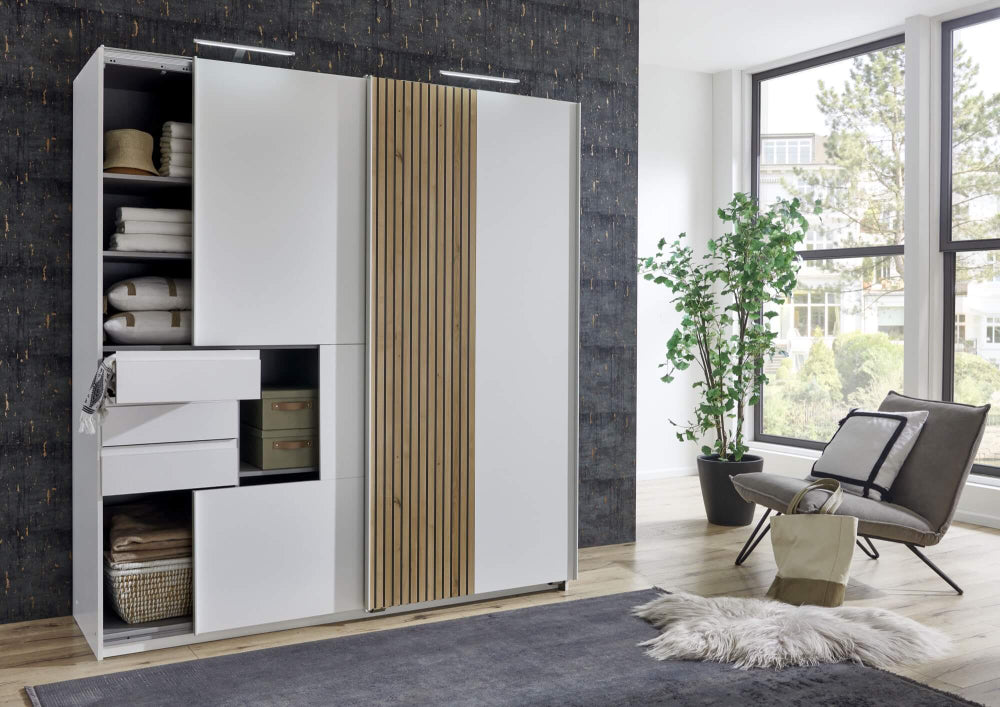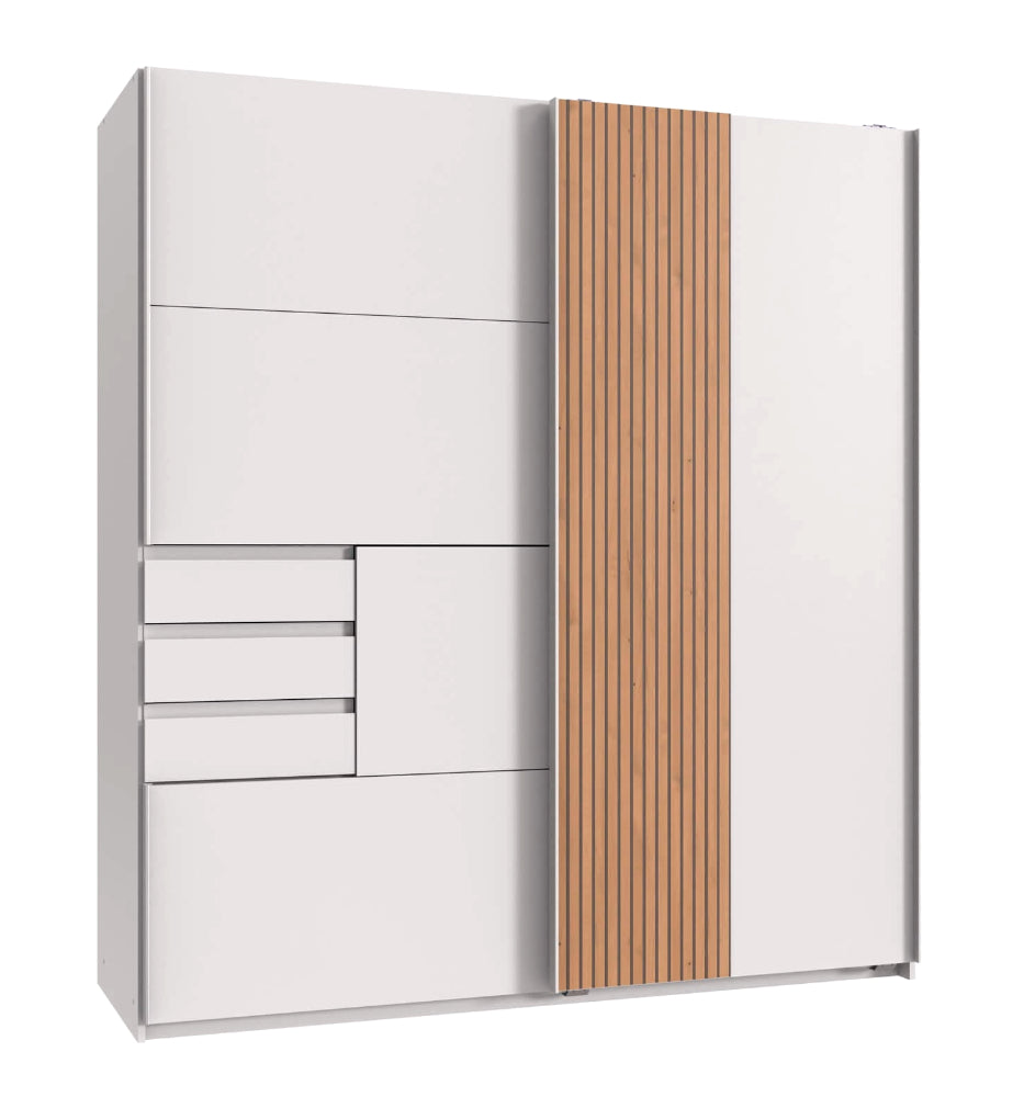 Ohne Passepartout-Rahmen. 2 Abteilungen inkl. Seiten ca.: 90/90 cm, inkl. 4 Einlegeböden + 1 Kleiderstange, 3 Schubladen, Front + Korpus Weiß, Akustiklamellen-Nachbildung in Artisan-Eiche Nachbildung.