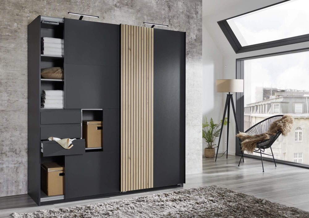 Der Schwebetürenschrank Coburg von Wimex ist ein Meisterwerk moderner Ästhetik und Funktionalität. Erhältlich in den zeitlosen Farben Graphit oder Weiß, strahlt dieser Schrank eine subtile Eleganz aus, die in jedes Schlafzimmer passt. Doch das wahre Highlight ist die markante Tür mit Akustiklamellen, die nicht nur optisch beeindruckt, sondern auch eine beruhigende, stilvolle Atmosphäre schafft.