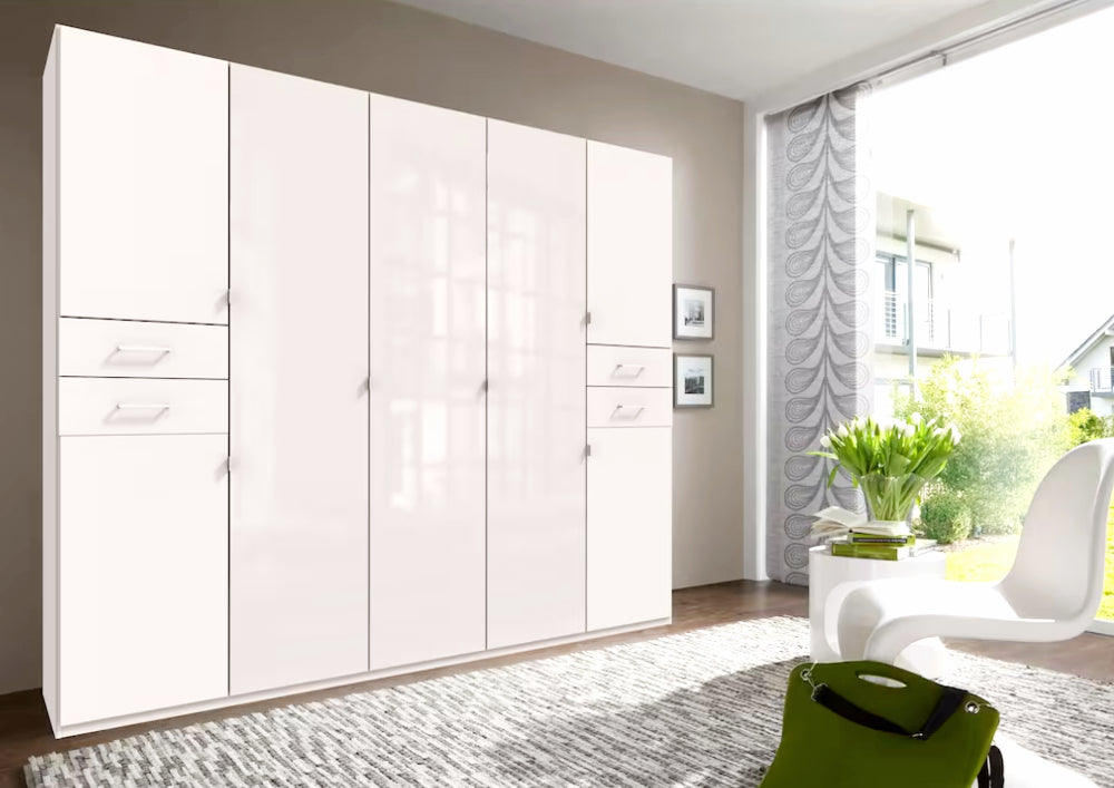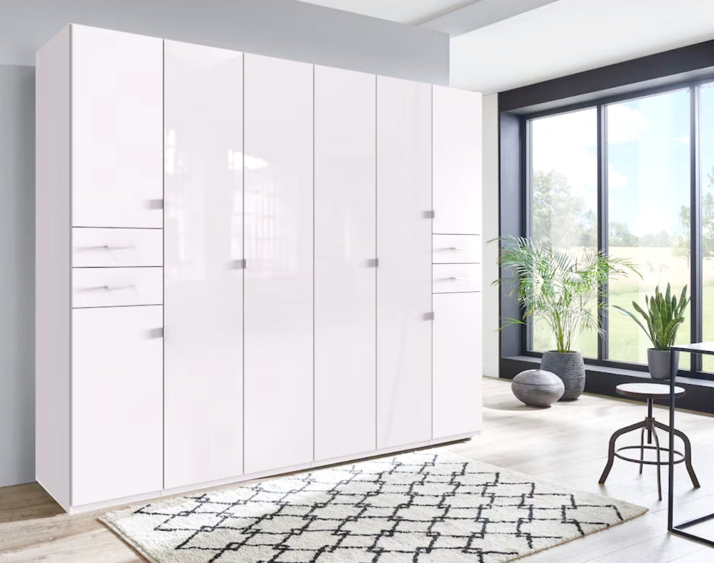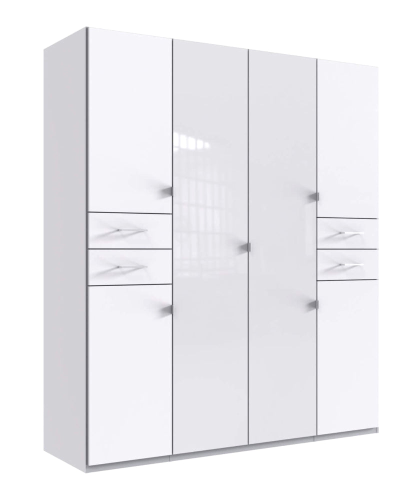 Drehtürenschrank 4-türig mit 2 Farbglastüren. Besteht aus 3 Abteilungen inkl. Seiten ca. 45/90/45 cm, inkl. 5 Einlegeböden + 1 Kleiderstange, 4 Schubladen. Dekor: Korpus und Front Weiß, in der Mitte 2 lange durchgängige Türfronten Glas Weiß.