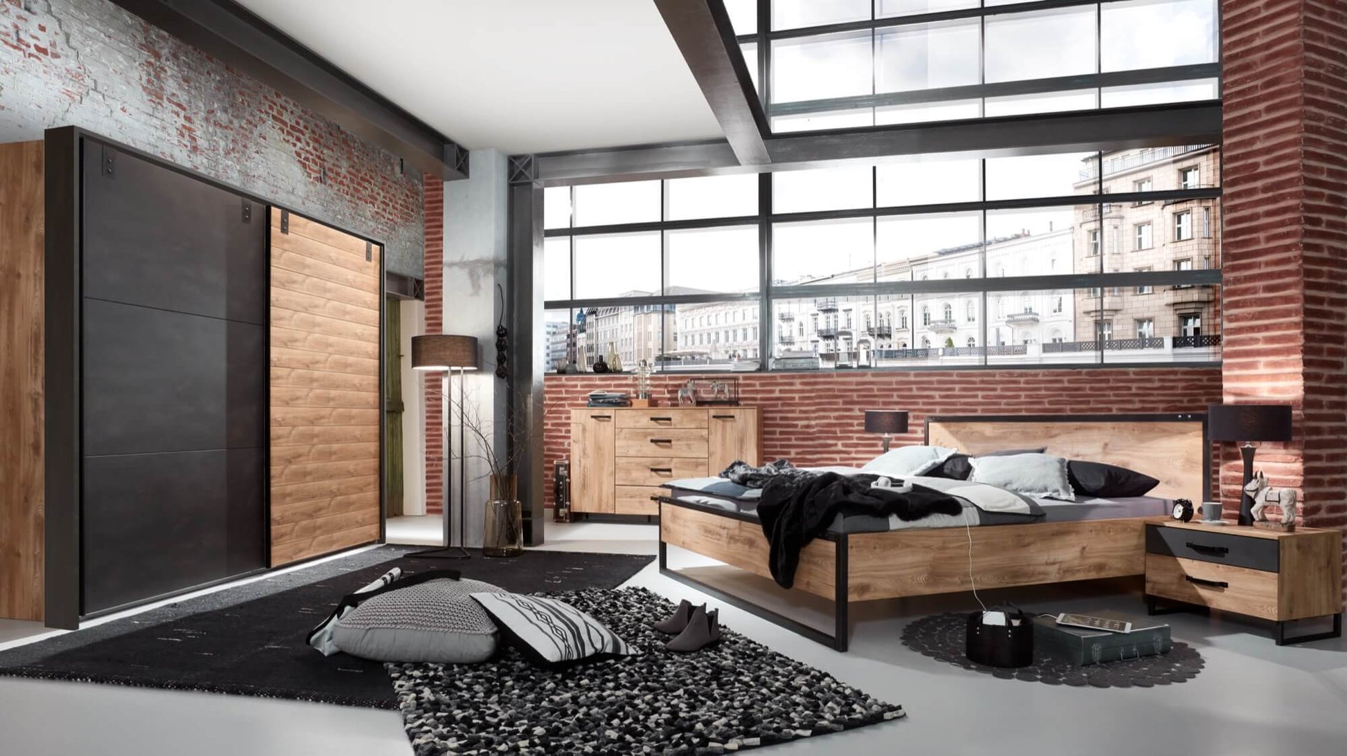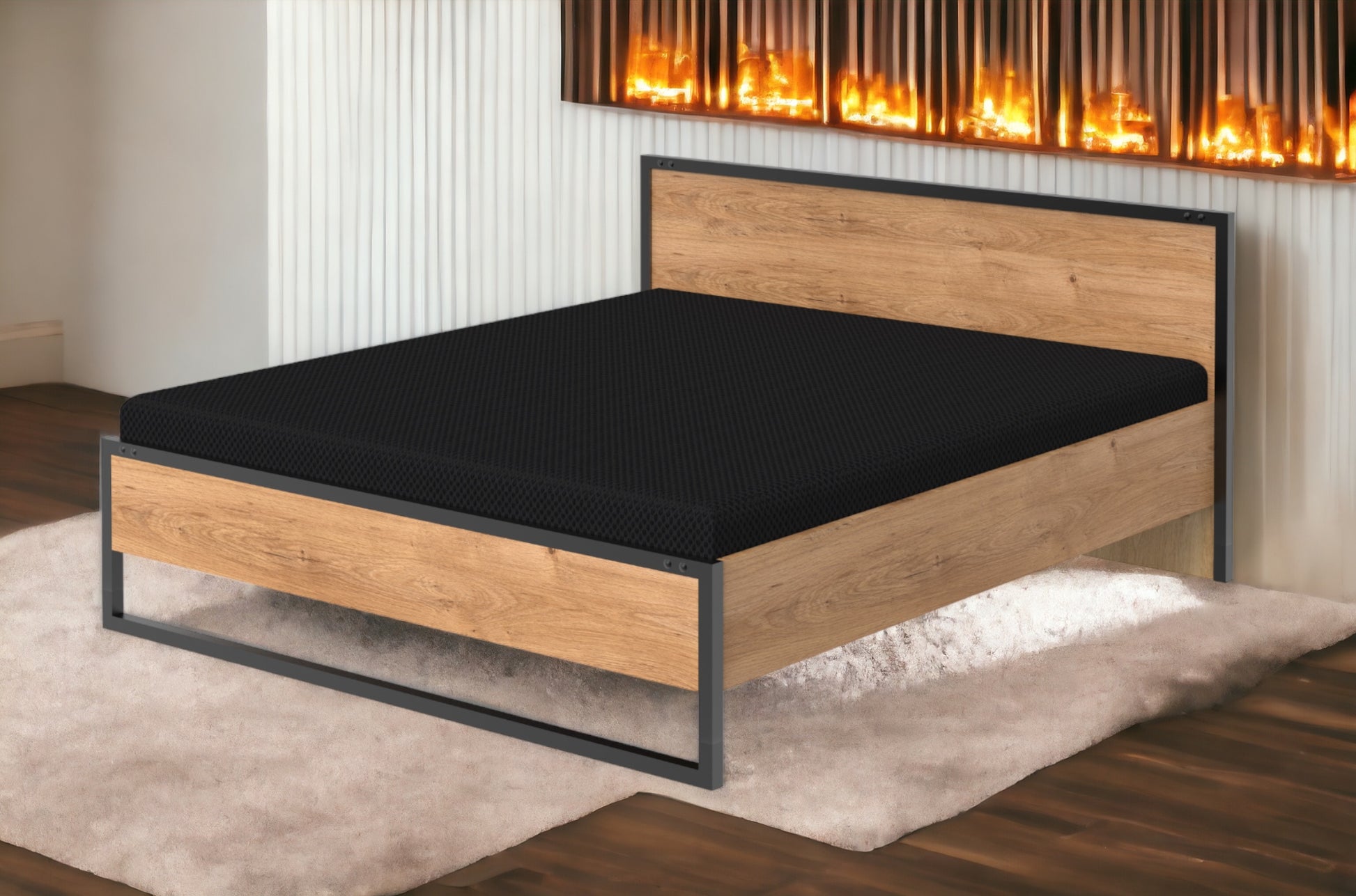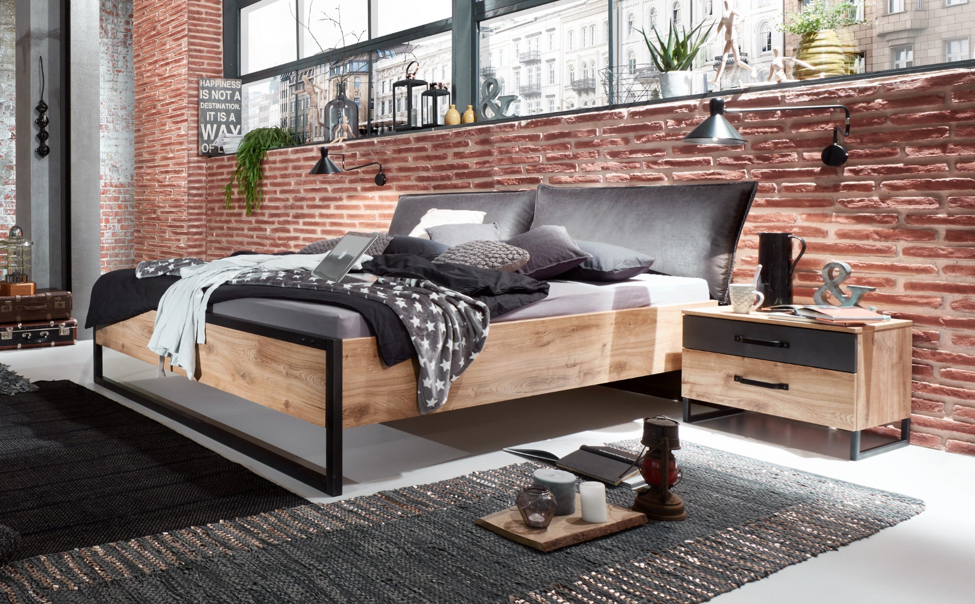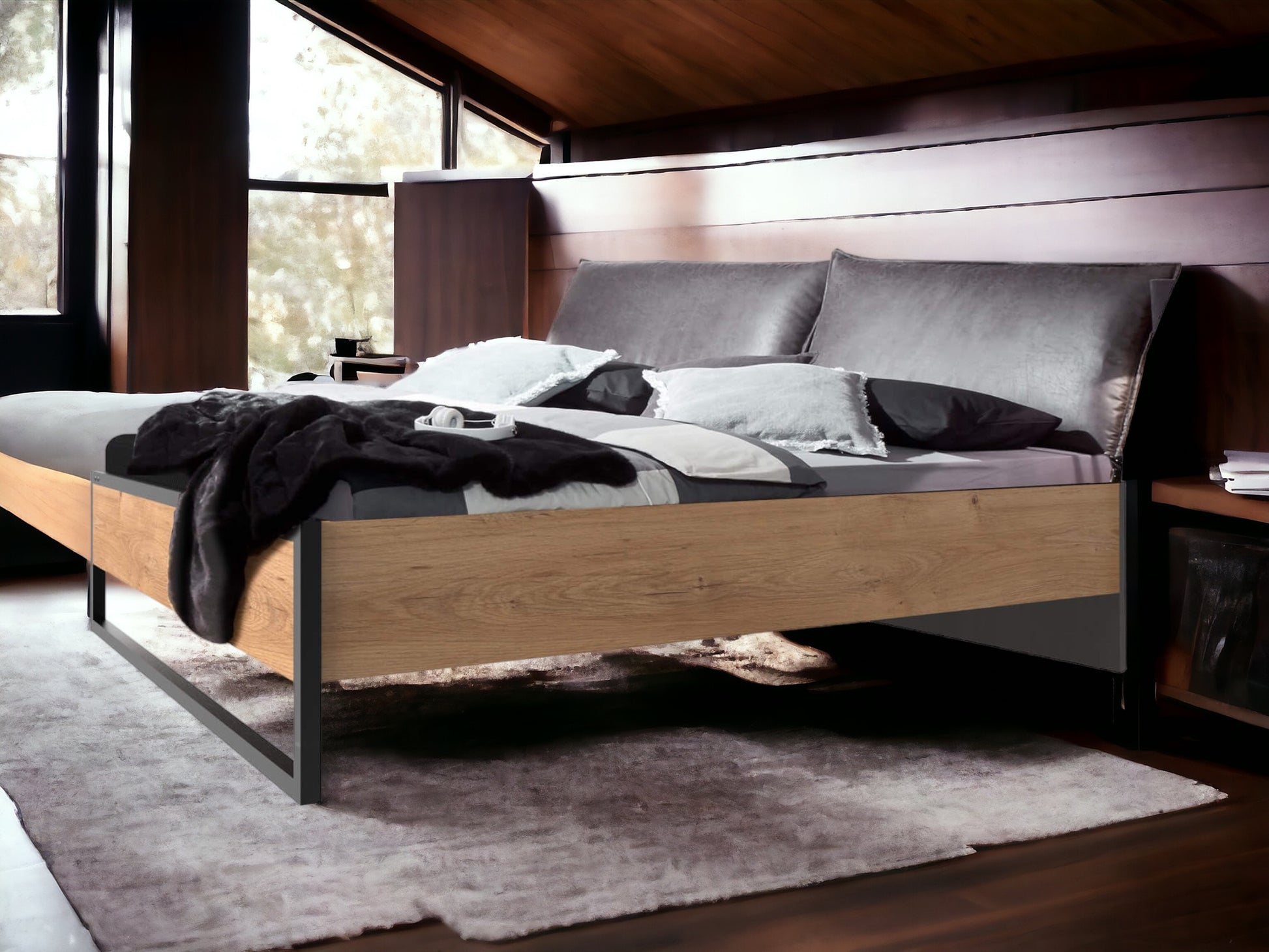 Plankeneiche-Nachbildung, Abs. Raw-Steel. Ohne Deko, Lattenroste und Matratzen.