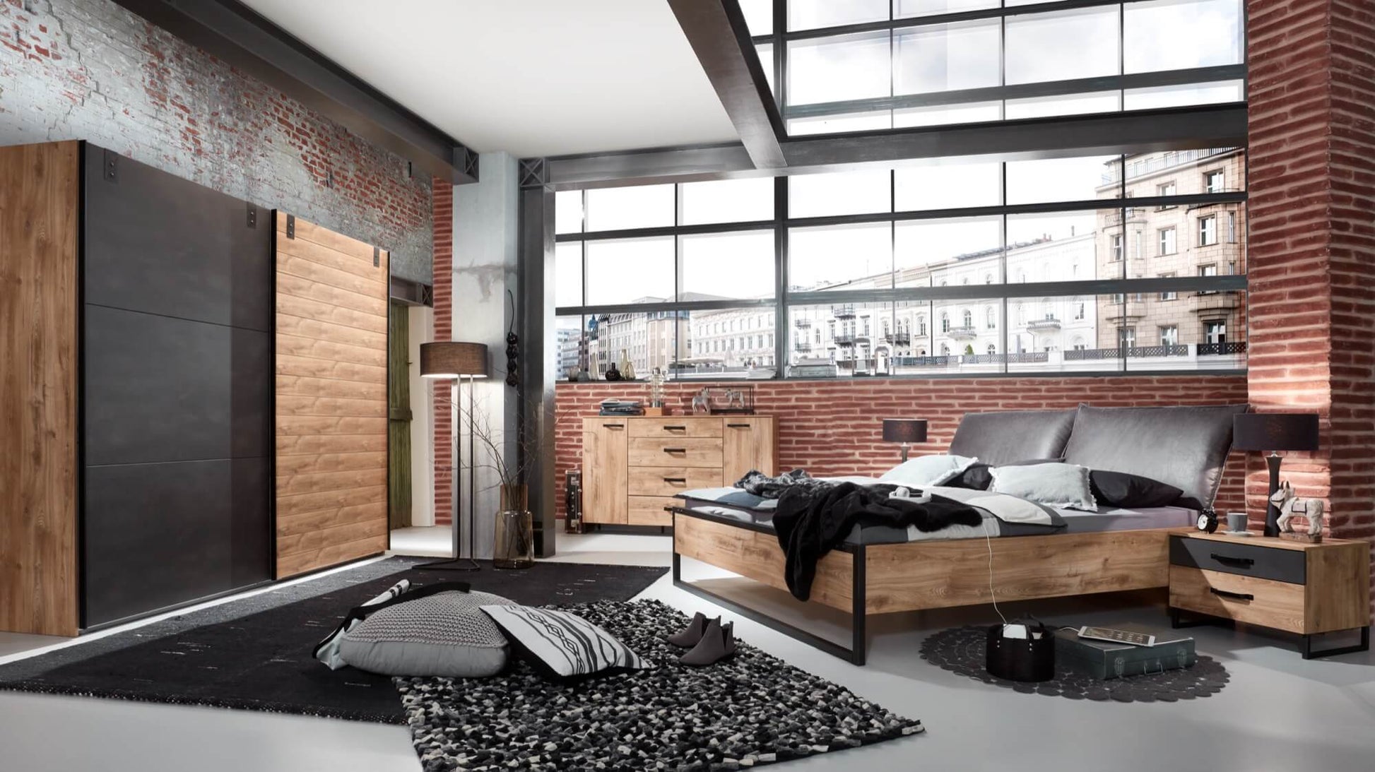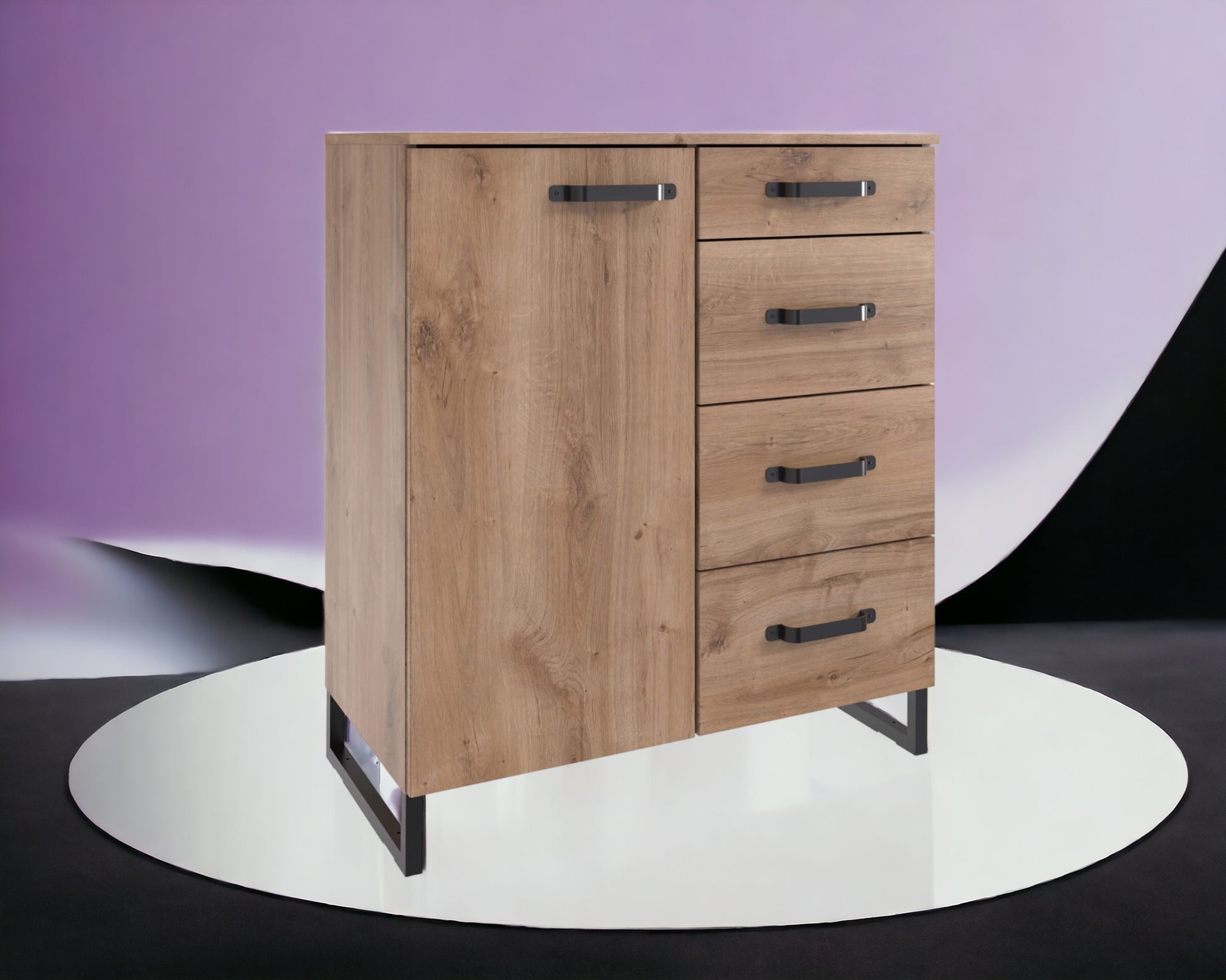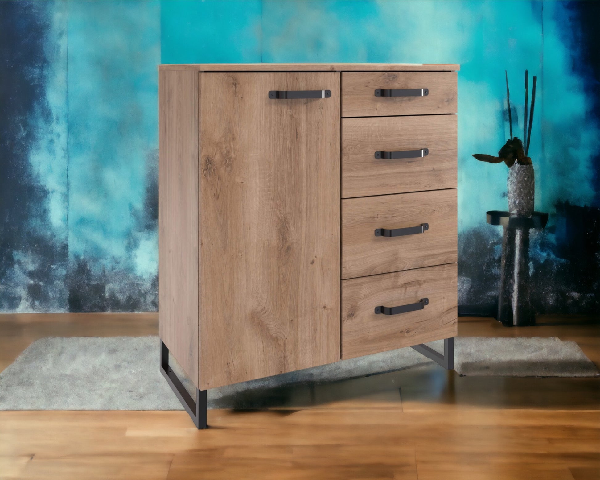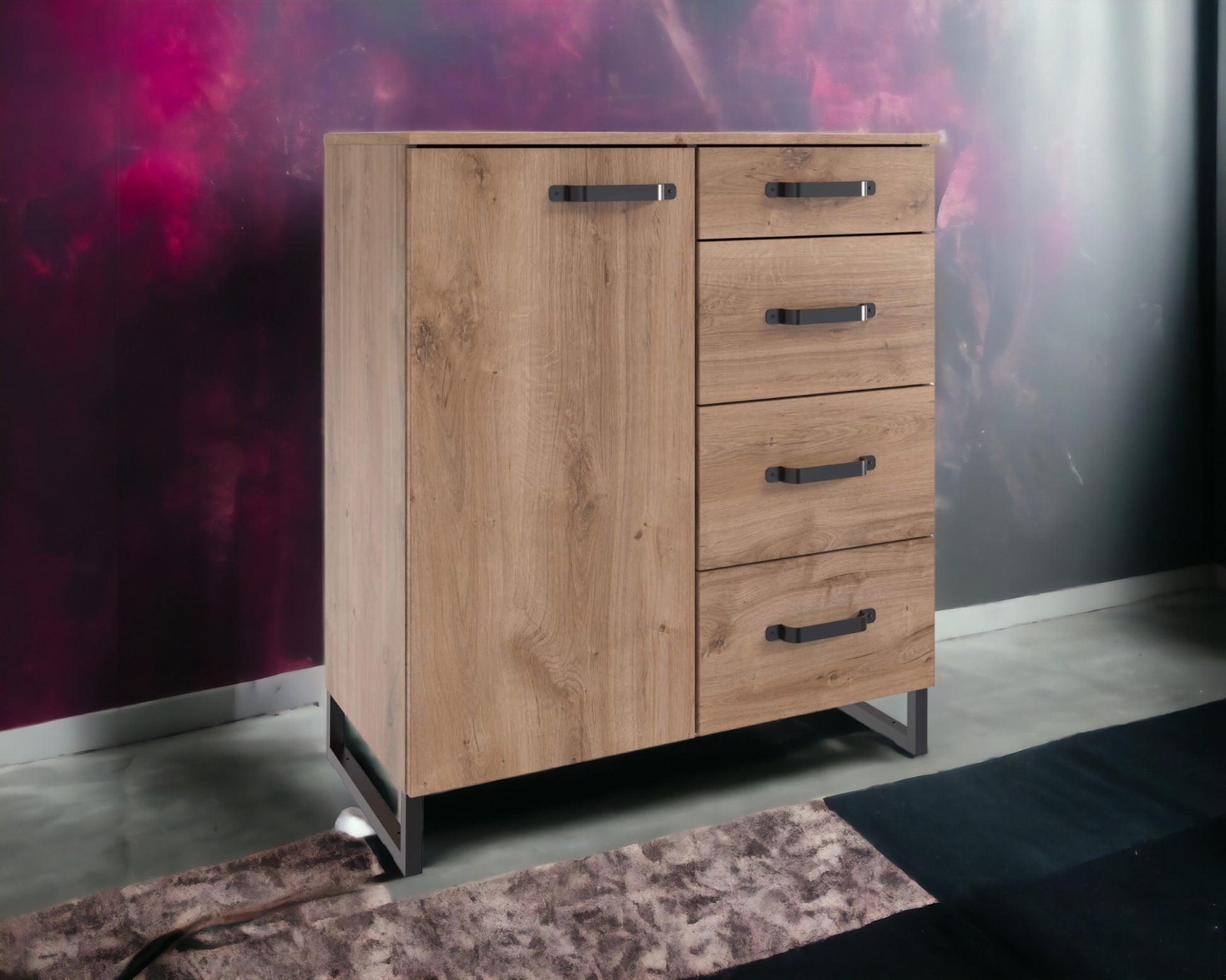 1 Tür links, 4 Schubladen recht, inkl. 2 Einlegeböden. Dekor: Plankeneiche-Nachbildung, Abs. Raw steel + Metall.