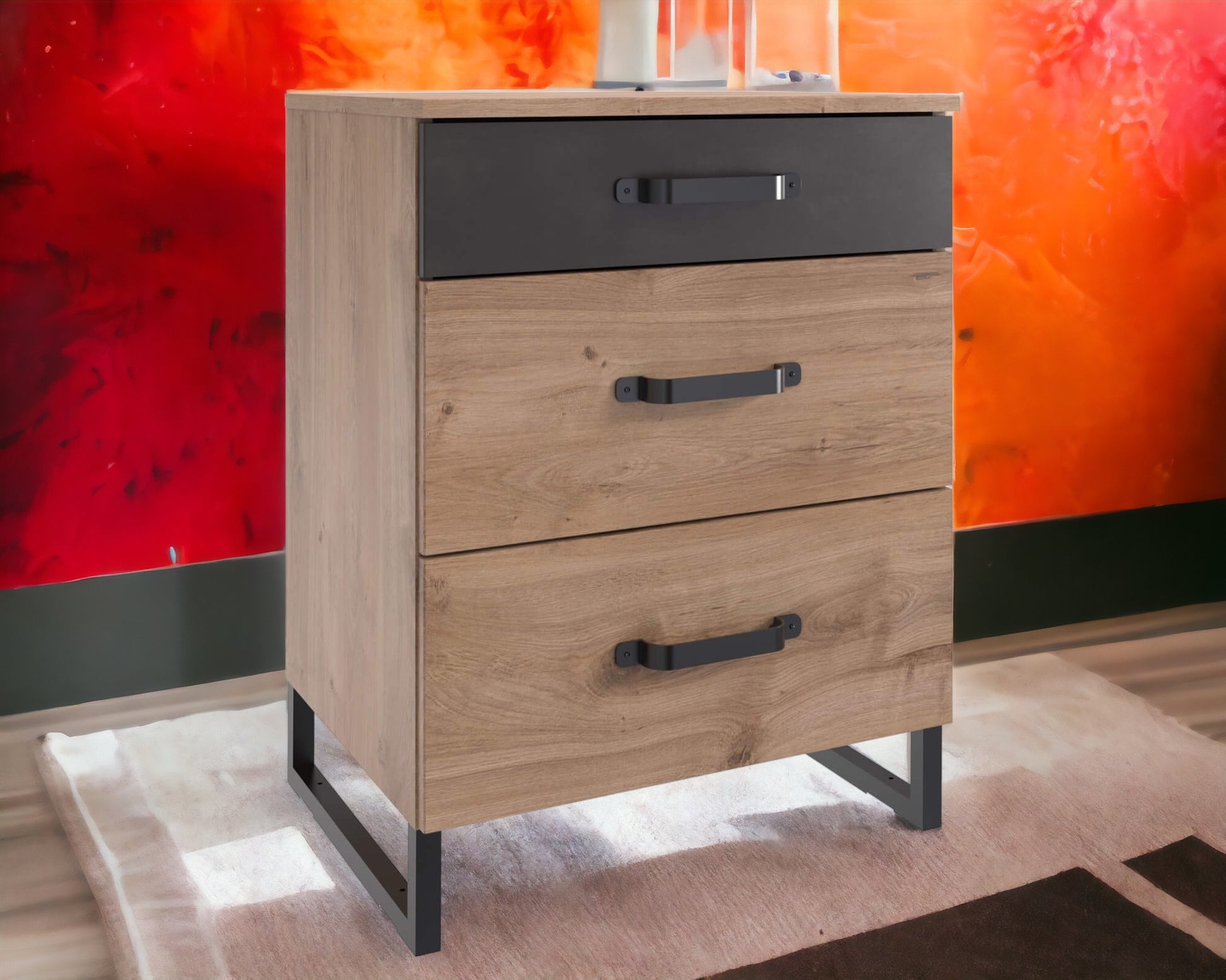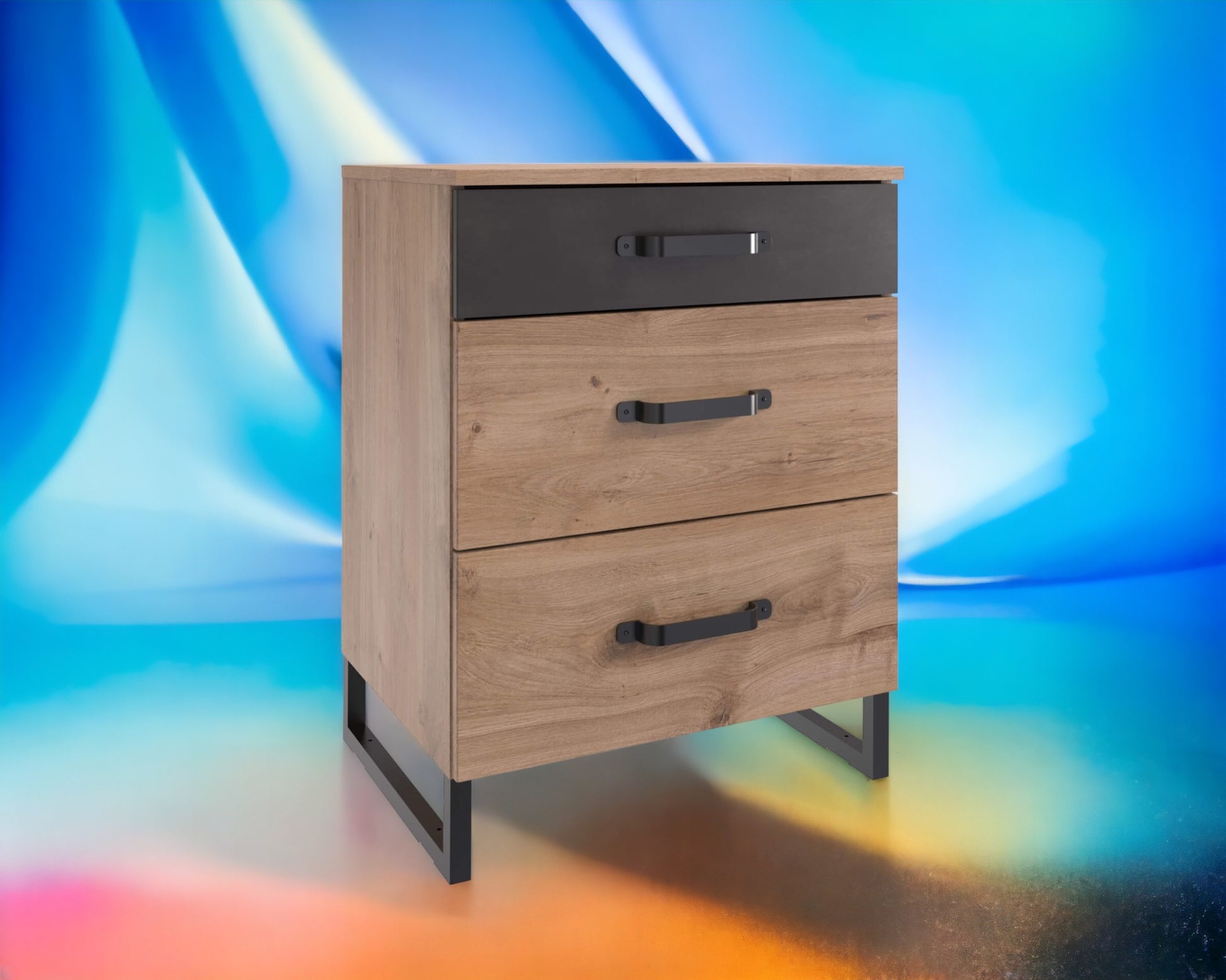 Mit 3 Schubladen. Dekor: Plankeneiche-Nachbildung, Abs. Raw steel + Metall.