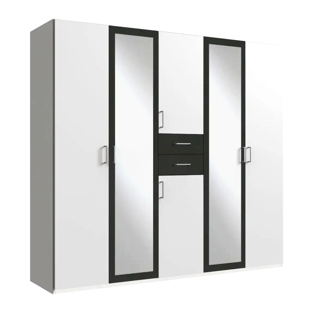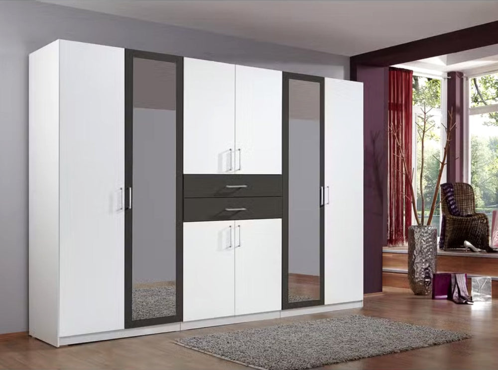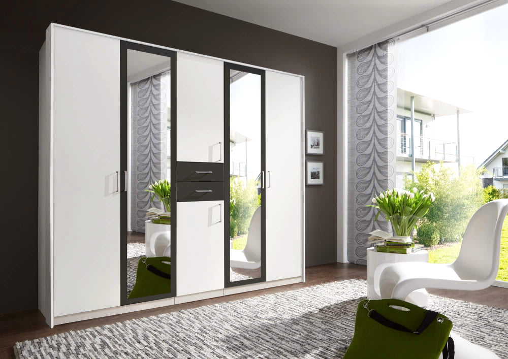 Drehtürenschrank 5-türig mit 2 Spiegeltüren. Besteht aus 3 Abteilungen inkl. Seiten ca. 90/45/90 cm, inkl. 3 Einlegeböden + 2 Kleiderstangen. 2 Schubladen in der Mitte. Dekor: Front + Korpus Weiß, Abs. Graphit.