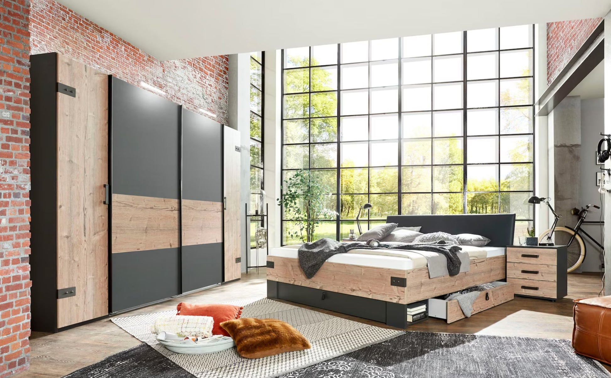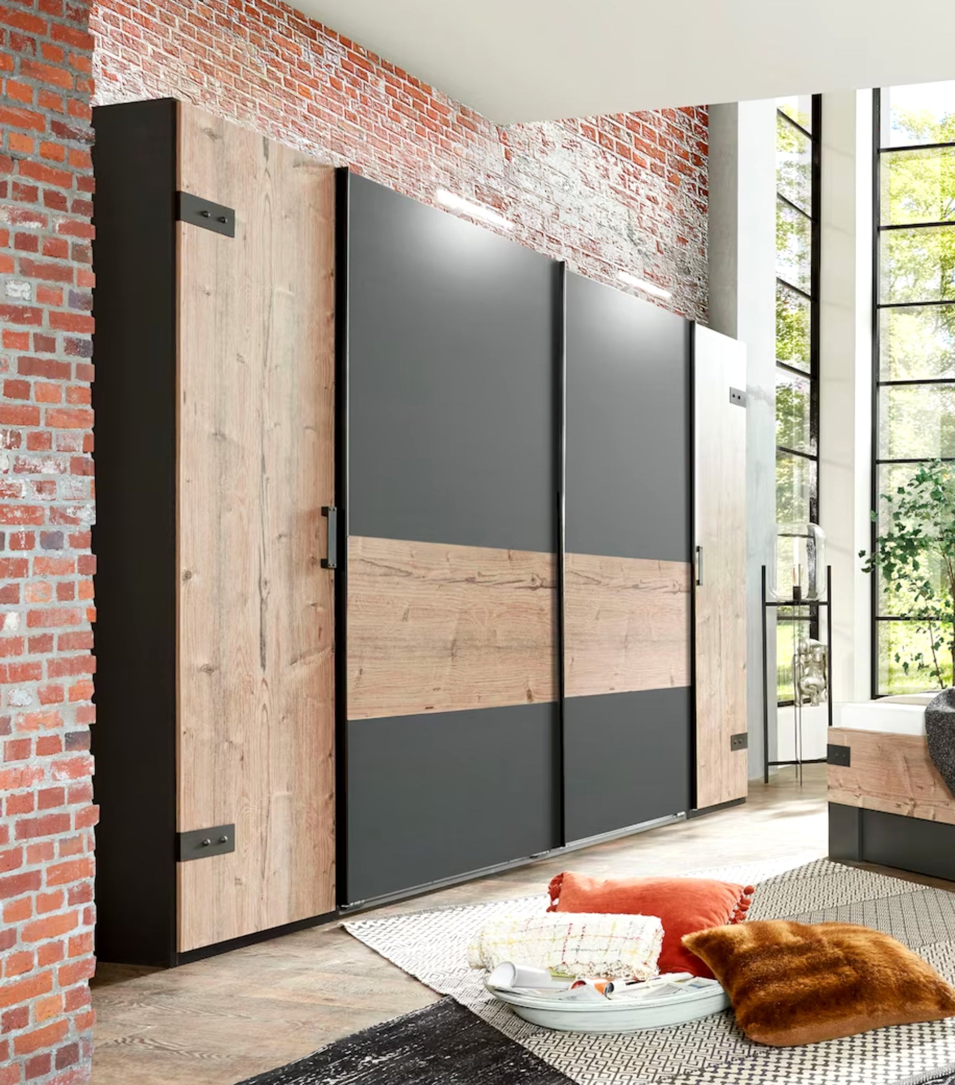 4 Abteilungen inkl. Seiten ca. 45/90/90/45 cm, inkl. 10 Einlegeböden + 2 Kleiderstangen, Korpus Graphit, Plankeneiche Nachbildung.