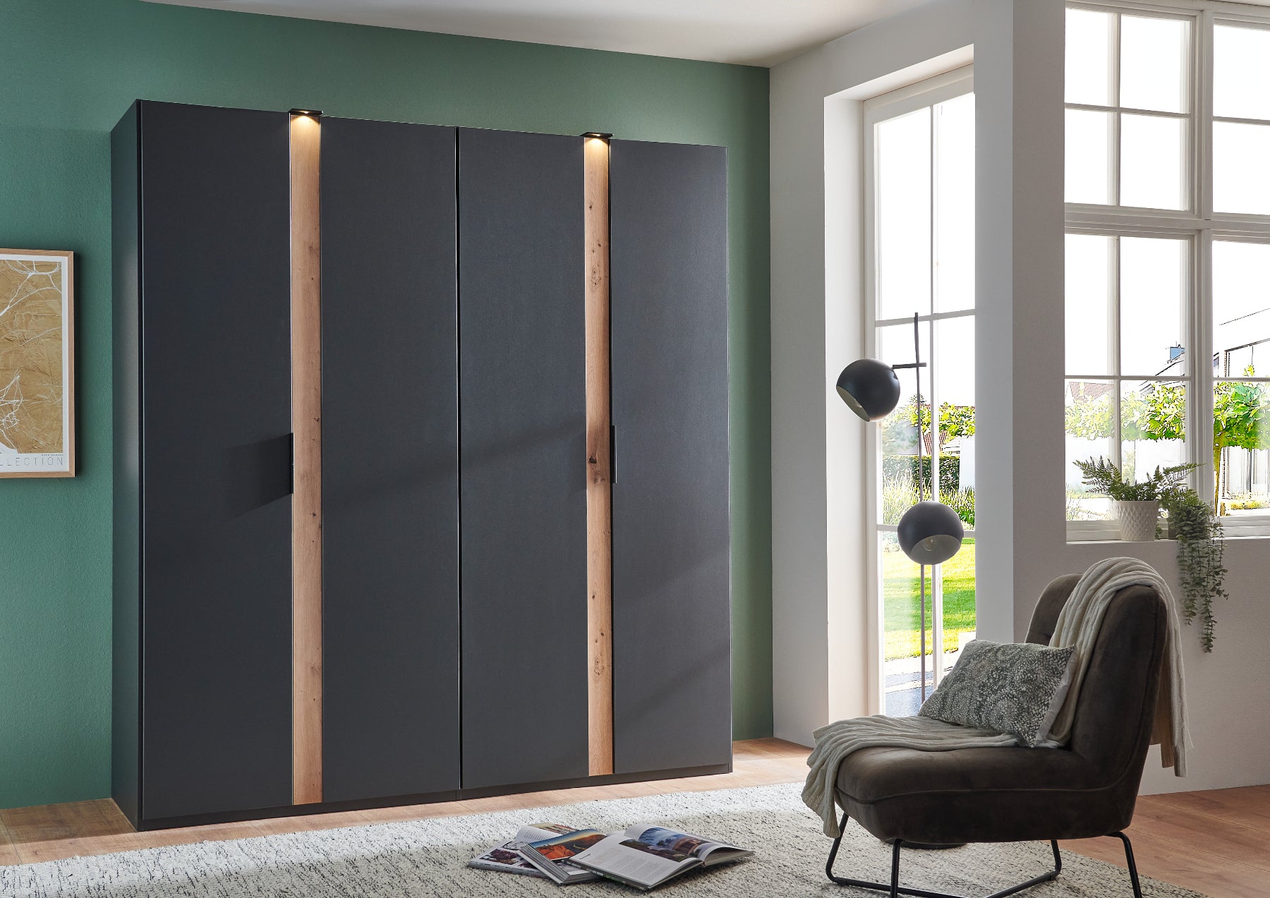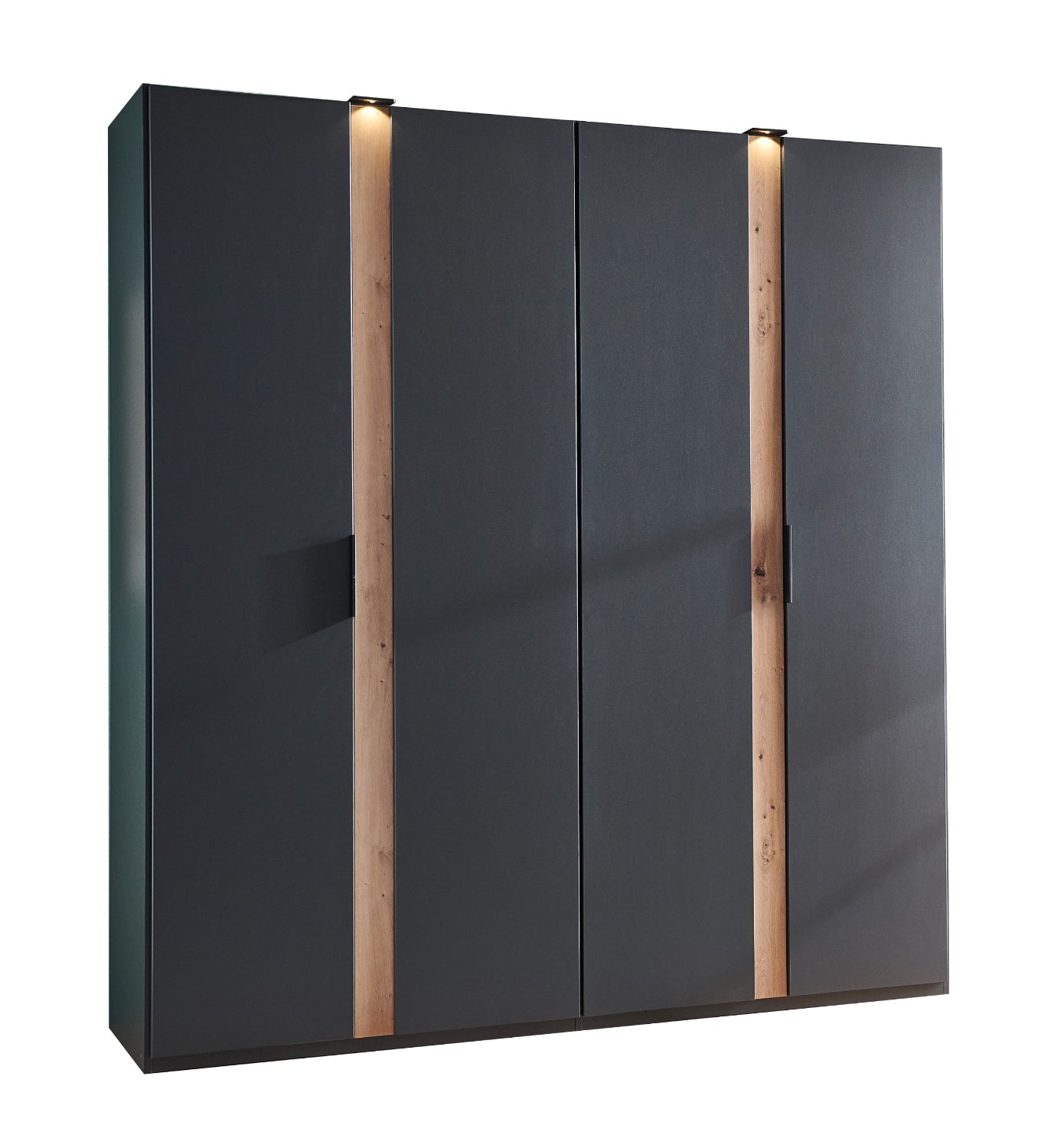 Der Wimex Drehtürenschrank Rimini bietet viel Stauraum und ist gleichzeitig ein stilvolles Möbelstück für Ihr Zuhause. Mit einer Höhe von ca. 216 cm und einer Breite von ca. 200 cm bietet er ausreichend Platz für Ihre Kleidung und Accessoires. In Weiß und Graphit gehalten, passt er perfekt zu verschiedenen Einrichtungsstilen. Für zusätzliche Atmosphäre sorgt die optionale Beleuchtung.