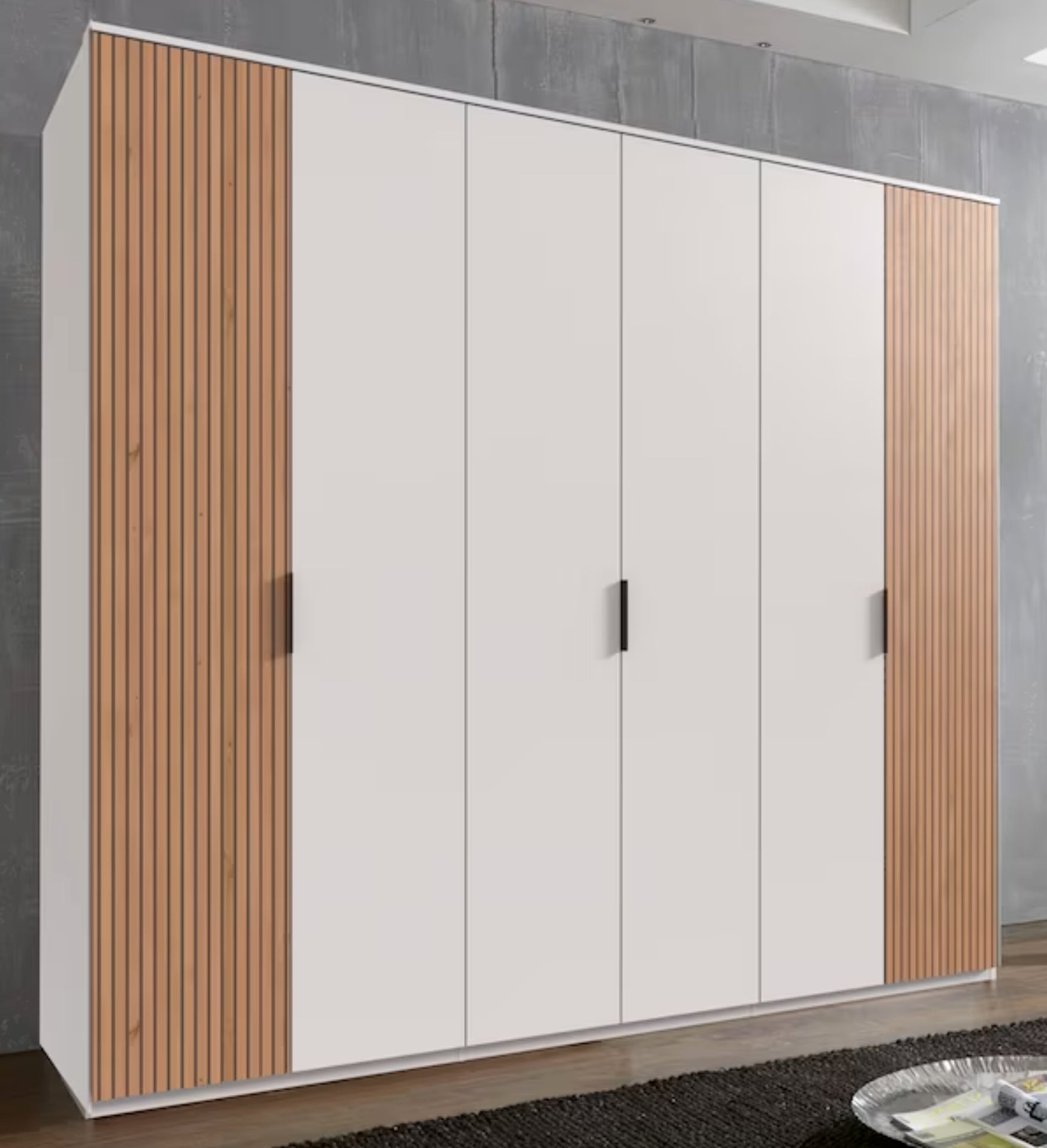 3 Abteilungen inkl. Seiten ca. 90/90/90 cm, inkl. 3 Einlegeböden + 3 Kleiderstangen. Dekor: Front + Korpus Weiß, Abs. Akustiklamellen Nachbildung Artisan Eiche Nachbildung.