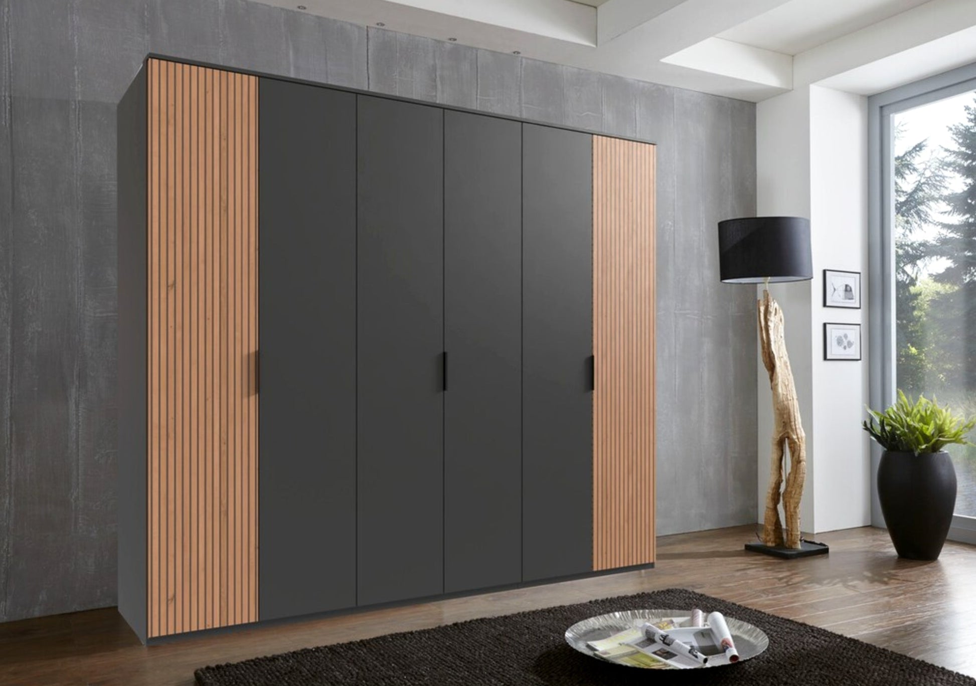 Der Wimex Drehtürenschrank Tunis ist ein zeitgemäßer Schrank mit sechs Türen, der in der Farbkombination Weiß, Graphit und Artisan-Eiche erhältlich ist. Die Außentüren weisen eine Akustiklamellen-Nachbildung auf und verleihen dem Schrank eine gehobene Eleganz. Mit seinen Drehtüren bietet er eine großzügige Aufbewahrungsmöglichkeit und verleiht Ihrem Zuhause eine moderne Note.