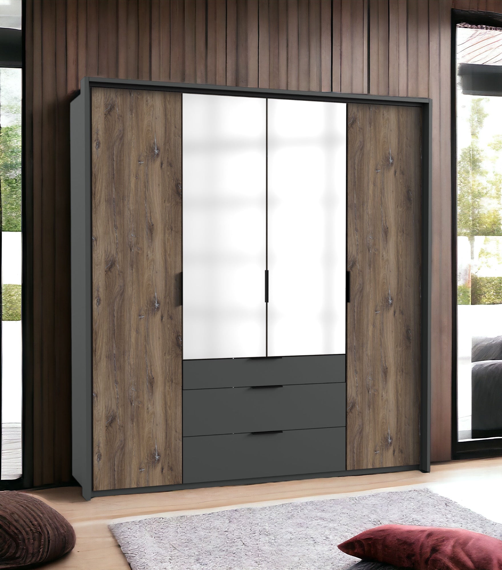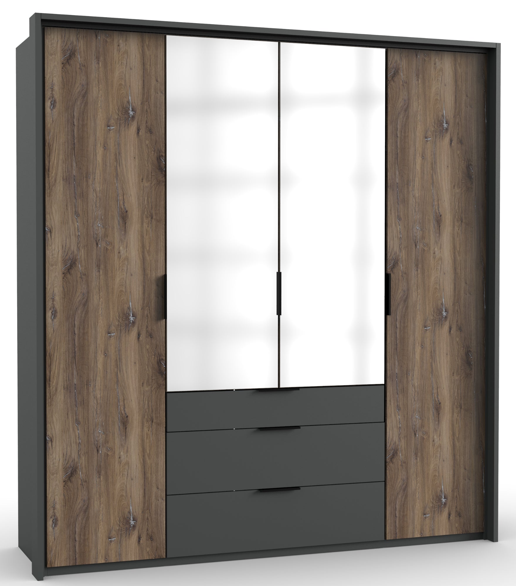 Ohne Passepartout-Rahmen. 3 Abteilungen inkl. Seiten ca. 50/100/50 cm, inkl. 3 Einlegeböden + 3 Kleiderstangen, 2 Spiegeltüren, inkl. 3 Schubladen. Dekor: Front Flagstaff Eiche Nachbildung, Korpus Graphit, Abs. Graphit + Spiegel.