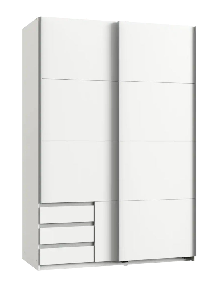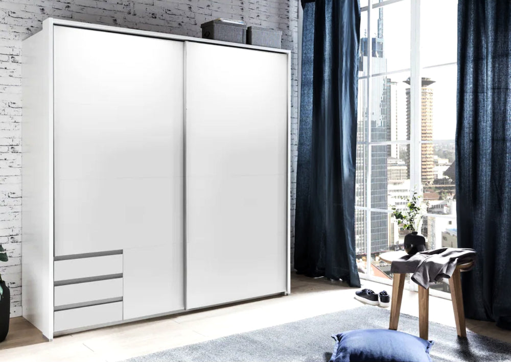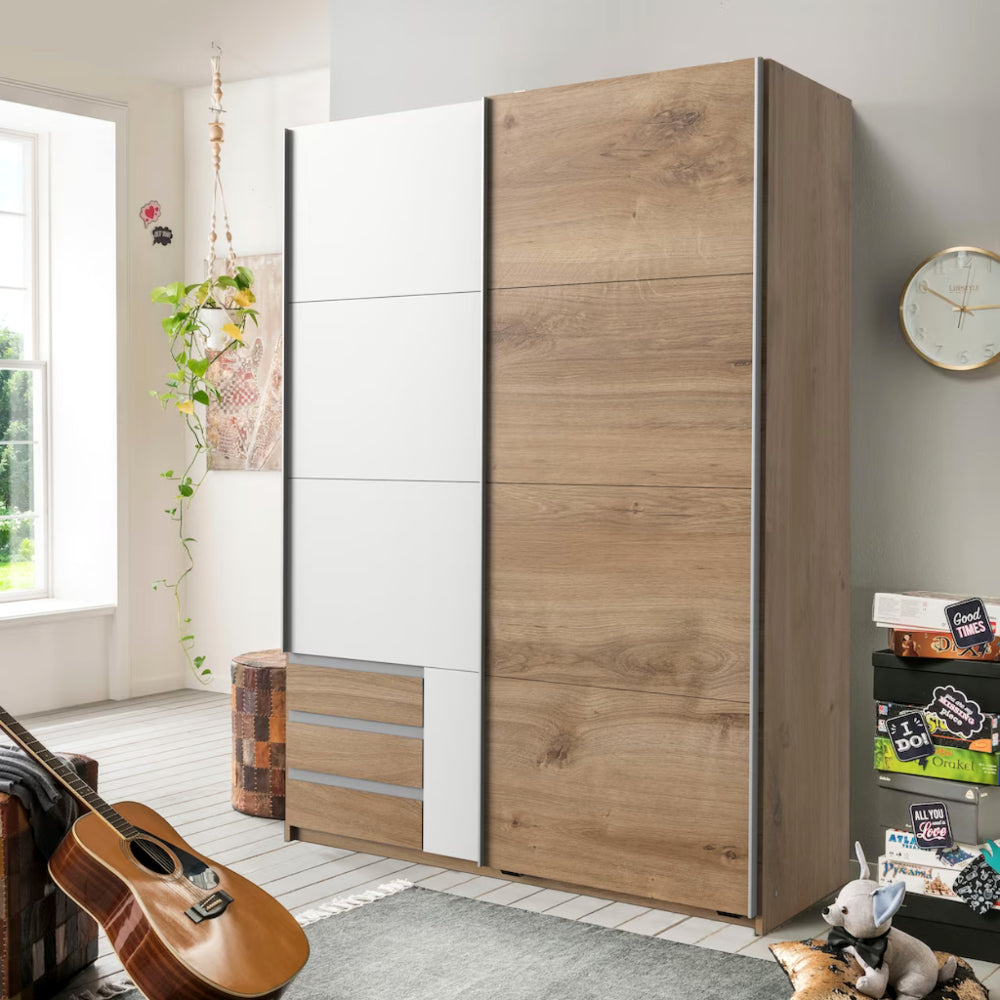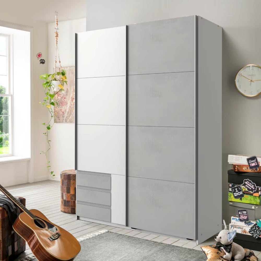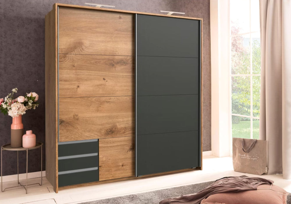 Trotz seines platzsparenden Formats bietet der “Emden” viel Stauraum: Die praktischen Schubladen bieten Platz für Accessoires und persönliche Gegenstände, während die Hauptfächer für Ordnung und Übersichtlichkeit sorgen. Die Schwebetüren lassen sich besonders leicht und geräuschlos öffnen – ideal für moderne, bequeme Raumnutzung.