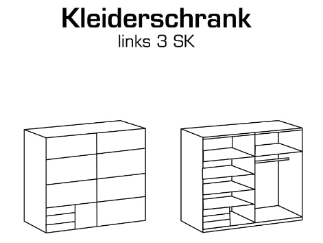Schwebetürenschrank 2-türig. Besteht aus 2 Abteilungen inkl. Seiten ca.: 90/45 cm, inkl. 4 Einlegeböden + 1 Kleiderstange, links 3 Schubladen. Dekor: Front + Korpus Weiß.