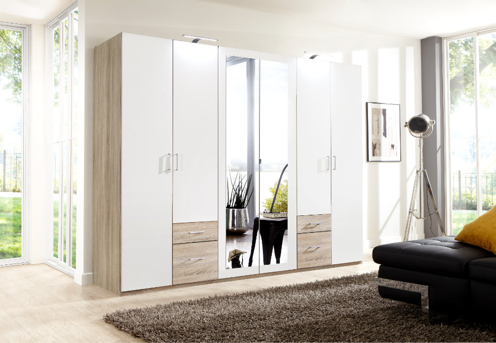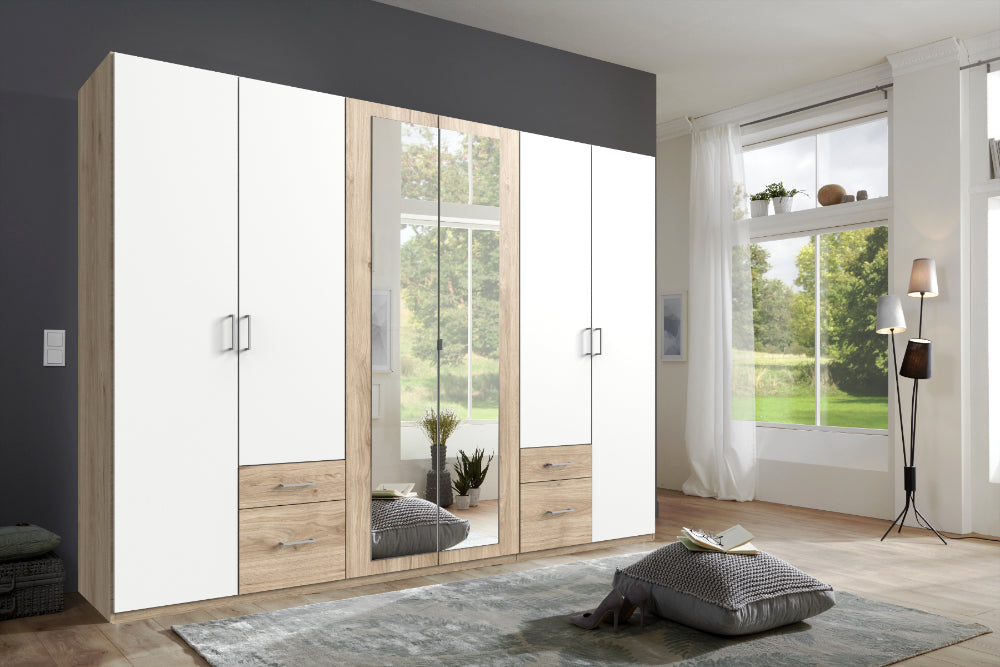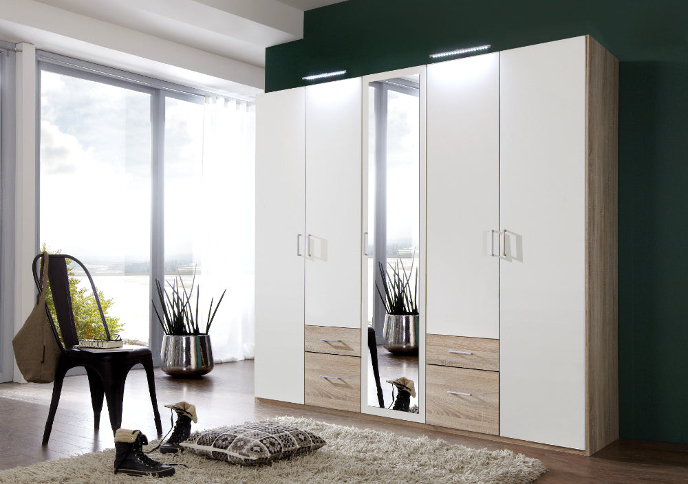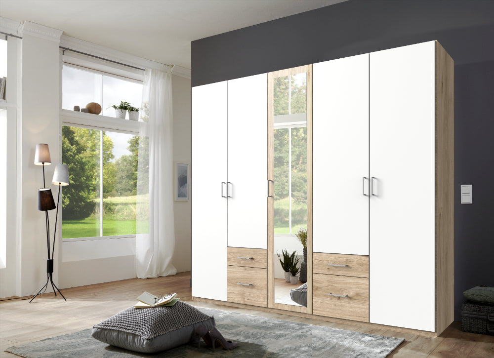 Drehtürenschrank 5-türig mit Spiegel. Besteht aus 3 Abteilungen inkl. Seiten ca. 90/45/90 cm, inkl. 3 Einlegeböden und 3 Kleiderstangen. Korpus: Eiche sägerau-Nachbildung, Front: Weiß, Schubkästen Eiche sägerau-Nachbildung.