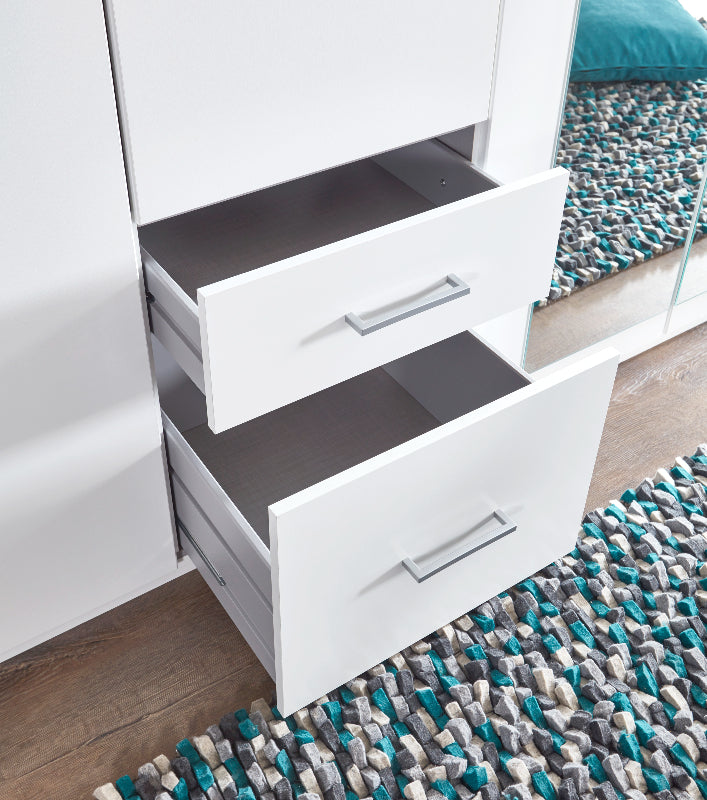 Trotz seines modischen, kompakten Designs bietet der “Freiburg” großzügigen Stauraum. Die praktischen Schubladen eignen sich ideal für Accessoires und kleinere Gegenstände, während der restliche Innenraum bestens organisiert und geräumig ist. Die Drehtüren sorgen für bequemen Zugang zu allen Fächern – eine perfekte Lösung für modernes Wohnen.