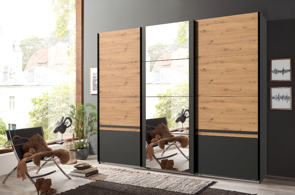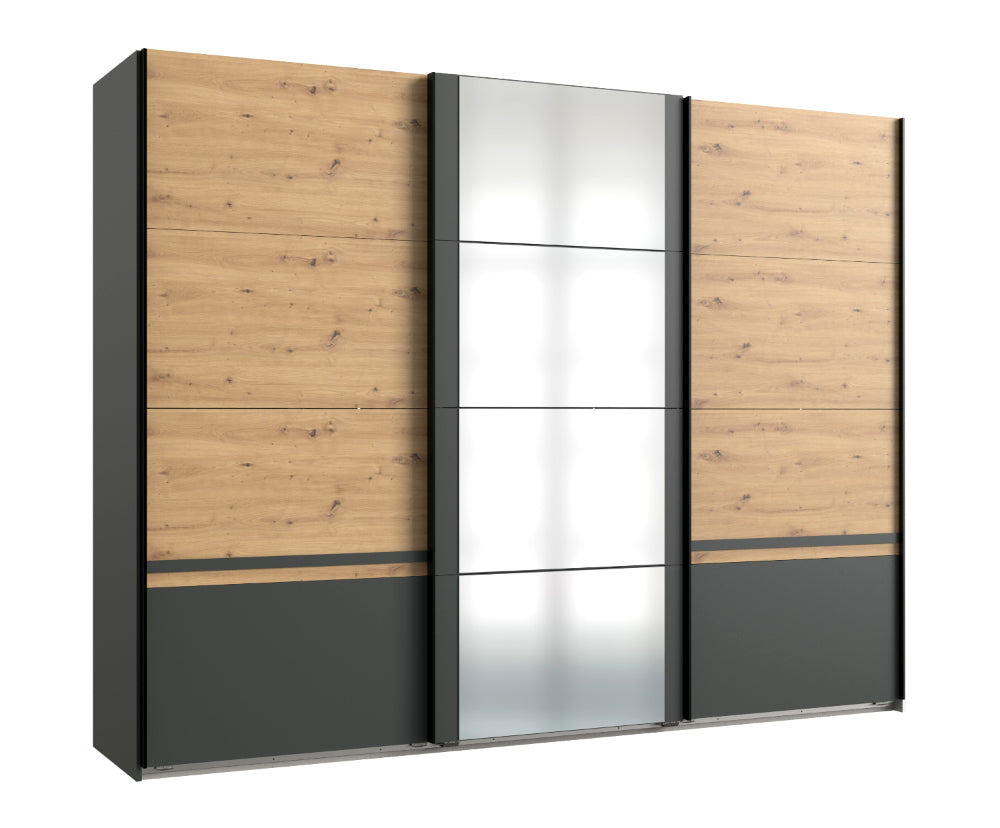 Schwebetürenschrank 3-türig mit Spiegeltür. Besteht aus 3 Abteilungen inkl. Seiten ca. 90/90/90 cm, inkl. 3 Einlegeböden und 3 Kleiderstangen. Dekor: Korpus und Front Graphit, Absetzung Artisan-Eiche-Nachbildung.