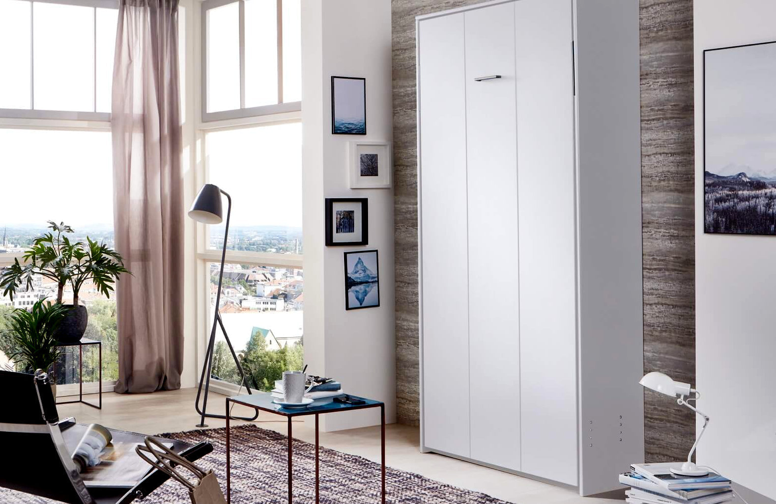 Betttyp: Vertikal klappbar. Tiefe ausgeklappt 217 cm, inkl. Lattenrost. Dekor: Korpus und Front Weiß.
